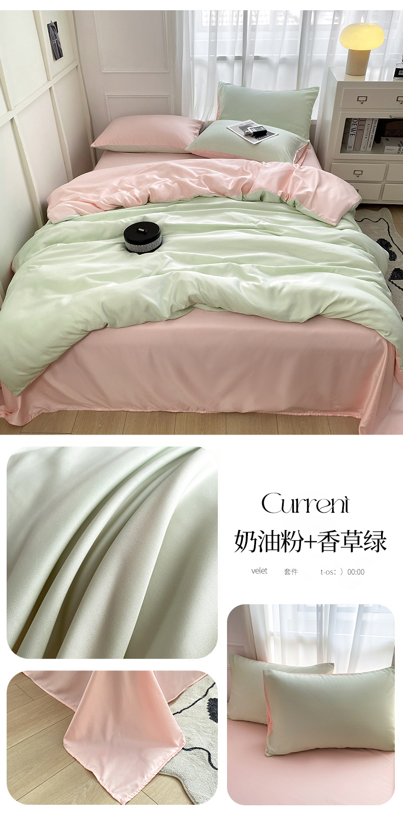 当前位置: 91家纺网 > 商品网购 > 床品套件 > 四件套 > 水洗真丝四件套 > 乐沐家纺 2024新款夏季水洗冰丝四件套水洗真丝纯色双拼单被套-风格二 奶油粉+青草绿
