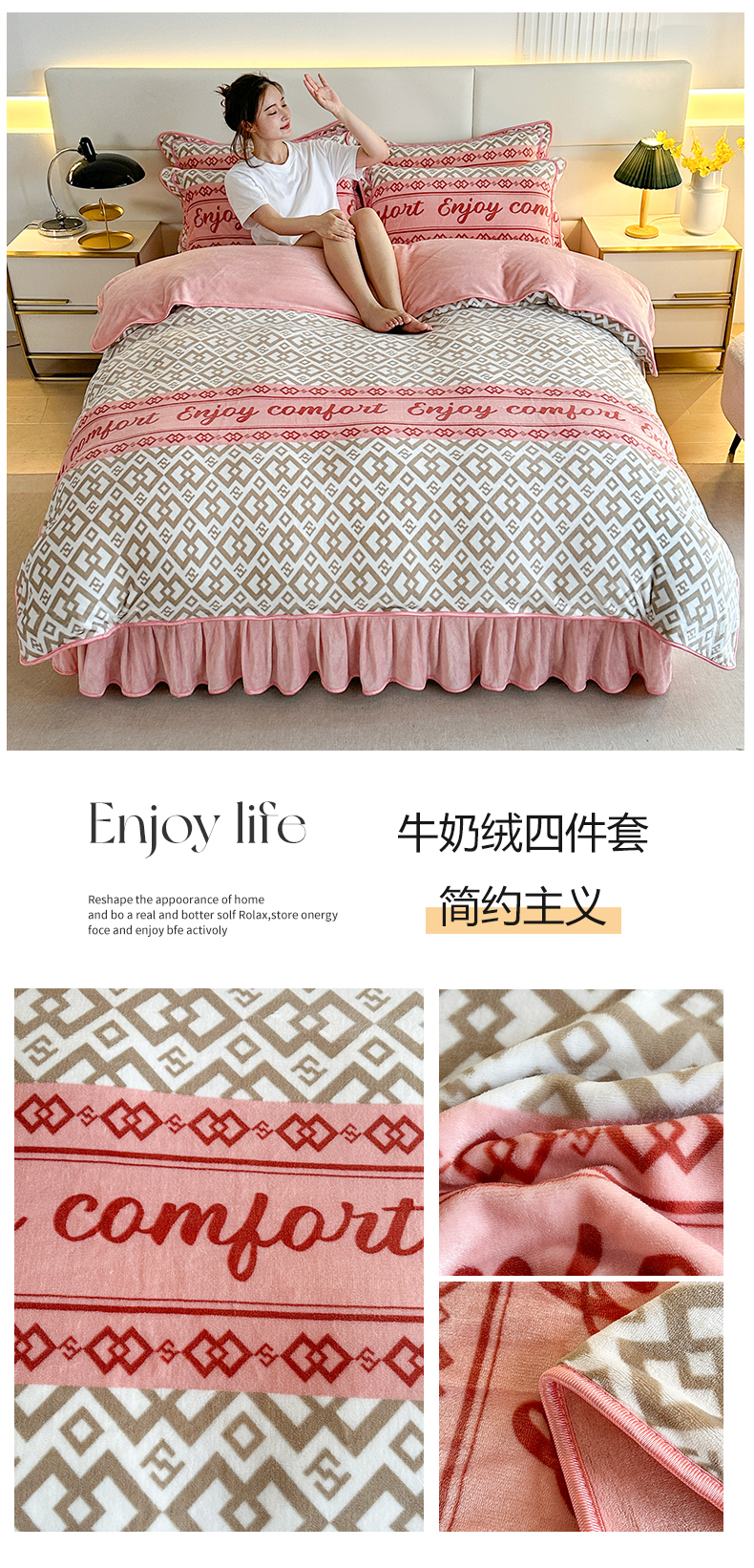 商品名称:富缦庭 2024新款8-9斤小包边床裙款牛奶绒印花四件套 简约主义