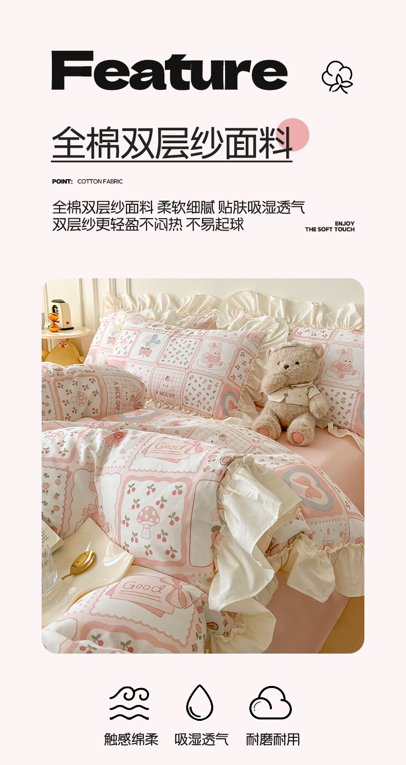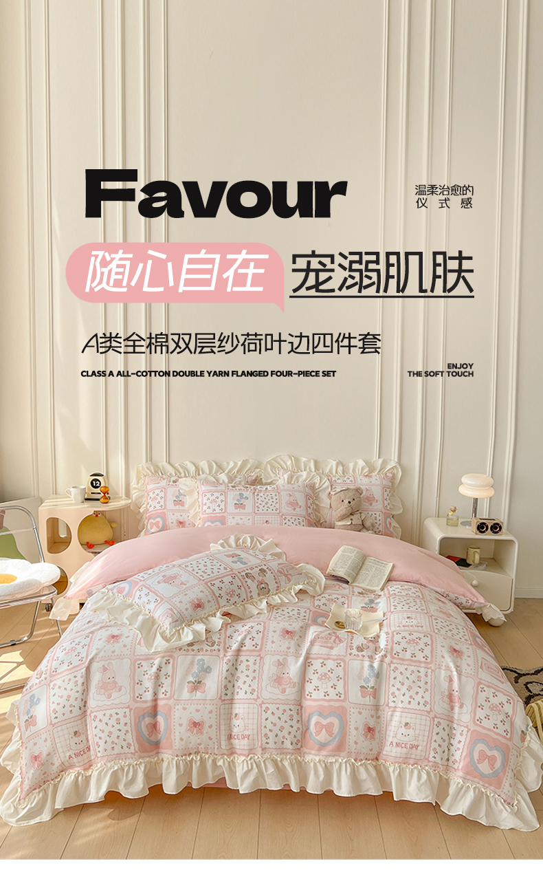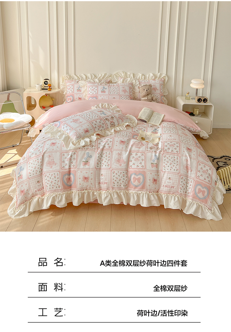 当前位置: 91家纺网 > 商品网购 > 床品套件 > 四件套 > 双层纱四件套 > 涵宸家纺 2025新款A类全棉双层纱荷叶花边四件套 花边-粉黛