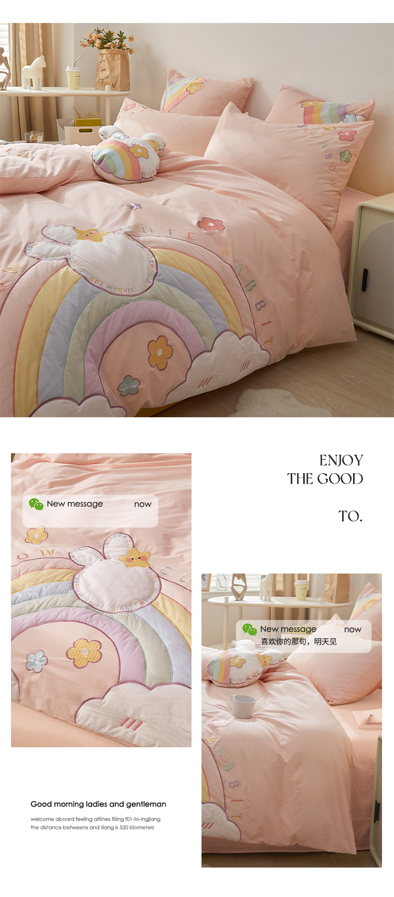 当前位置: 91家纺网 > 商品网购 > 床品套件 > 四件套 > 全棉普通四件套 > 涵宸家纺 2026新款全棉贴布绣小清新卡通系列四件套 彩虹漾