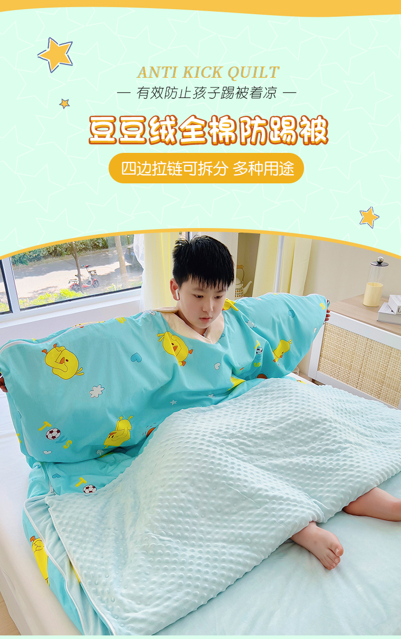 • 91家纺网 家纺一手货源 找家纺 萌朵家纺 2025新款豆豆绒全棉防踢被-结合牛奶绒绒防踢被 小鸭踢球蓝