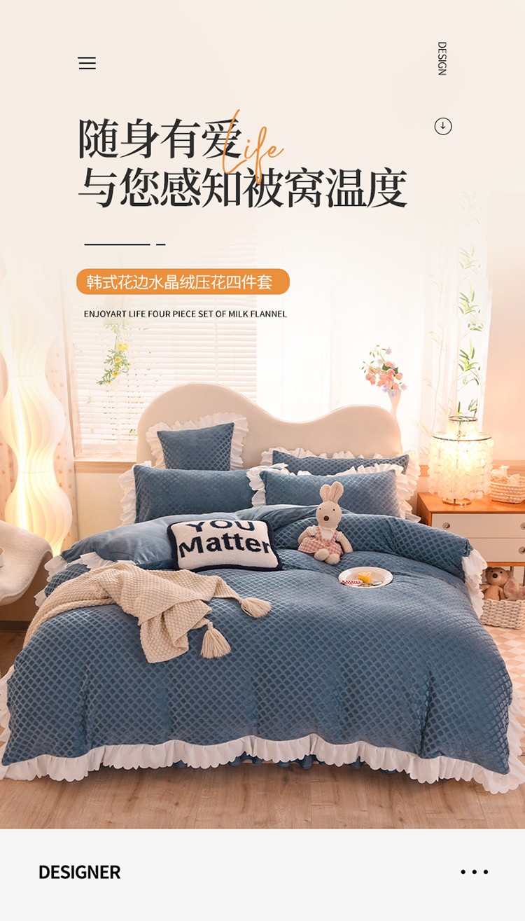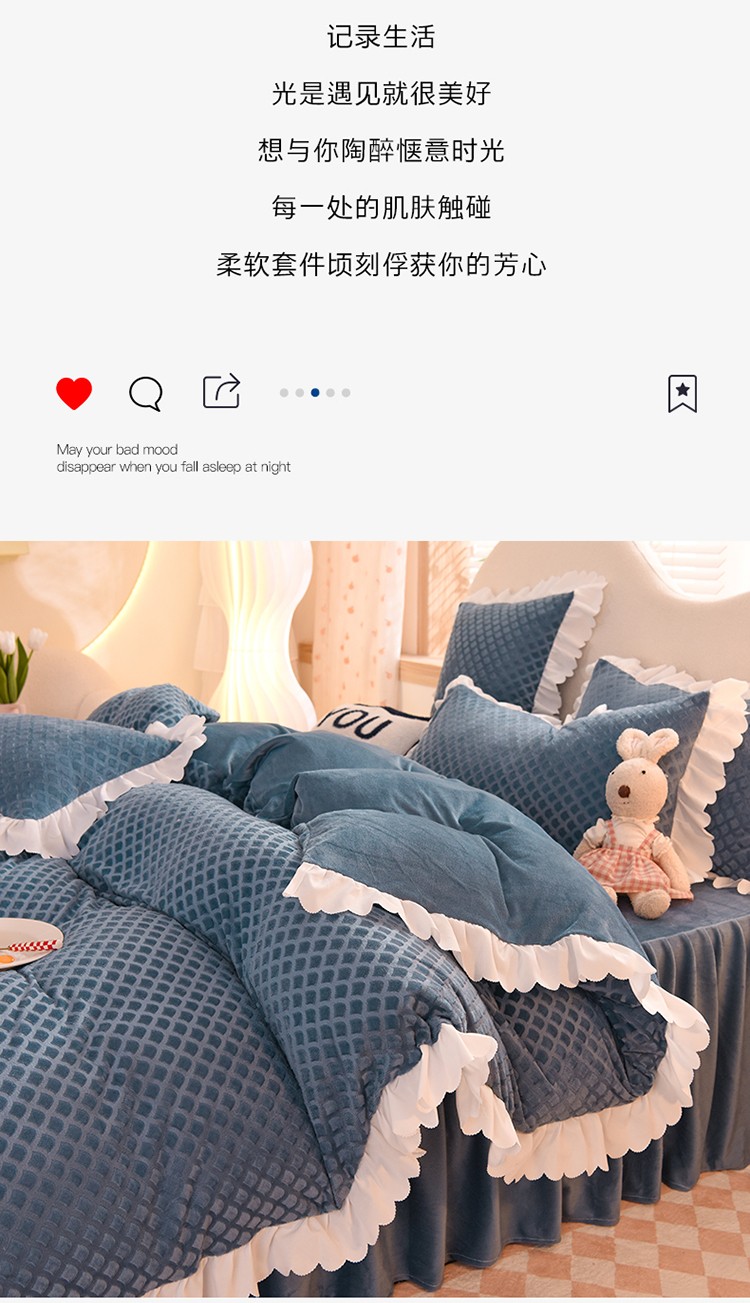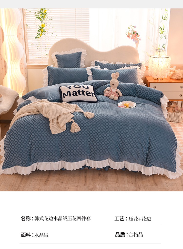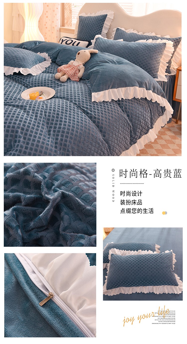 当前位置: 91家纺网 > 商品网购 > 床品套件 > 四件套 > 牛奶绒四件套 > 梦之岛 2022新款韩版牛奶绒水晶绒剪花四件套 时尚格-高贵蓝