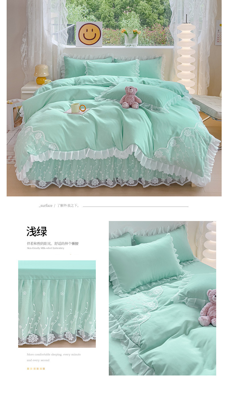 靓生活 2023新款韩版花边水洗磨毛床裙四件套 浅绿