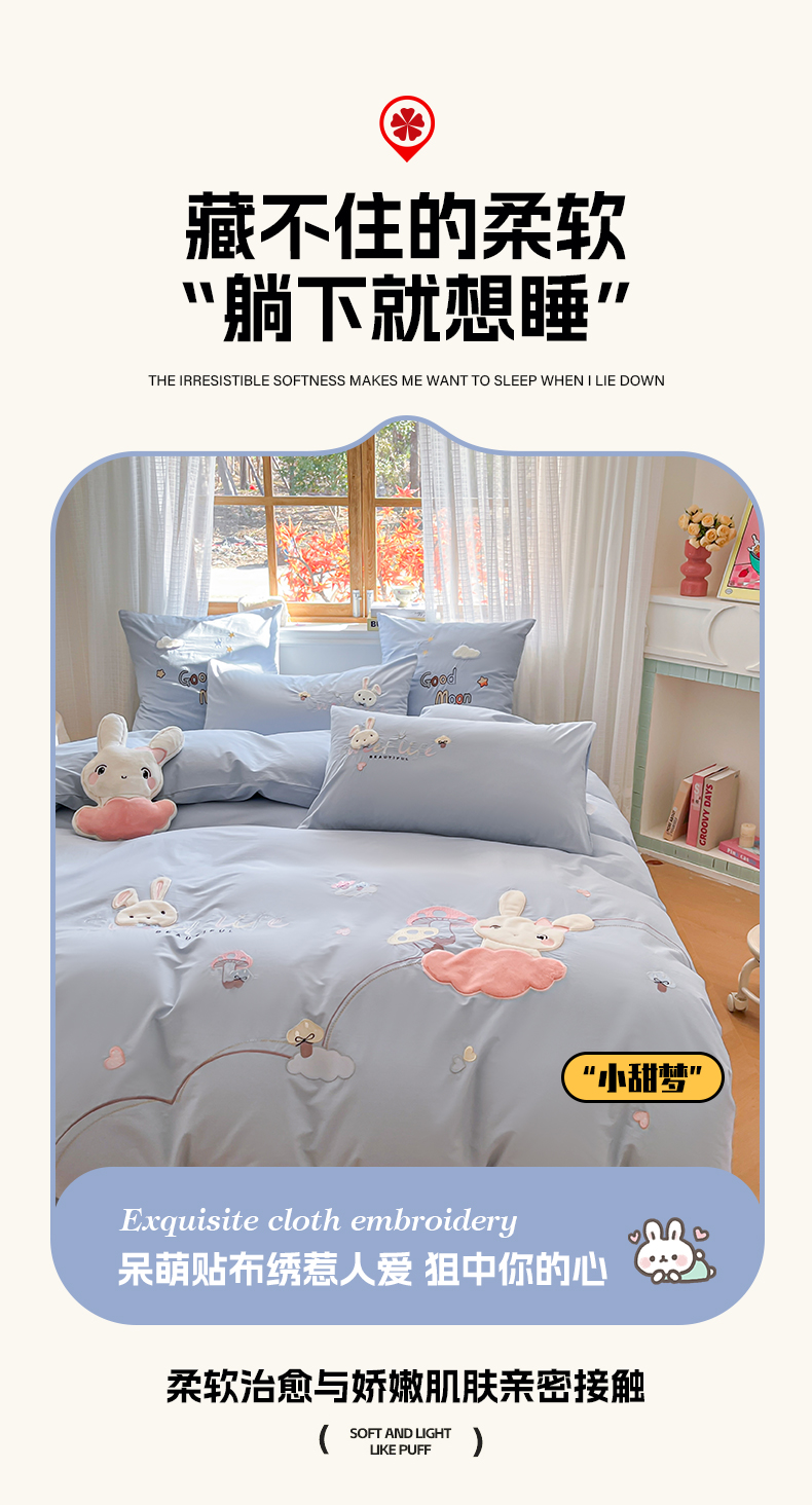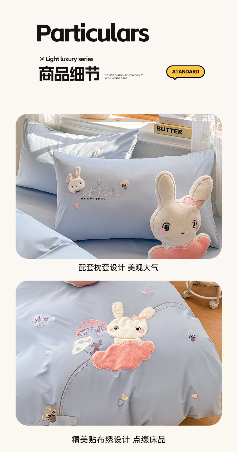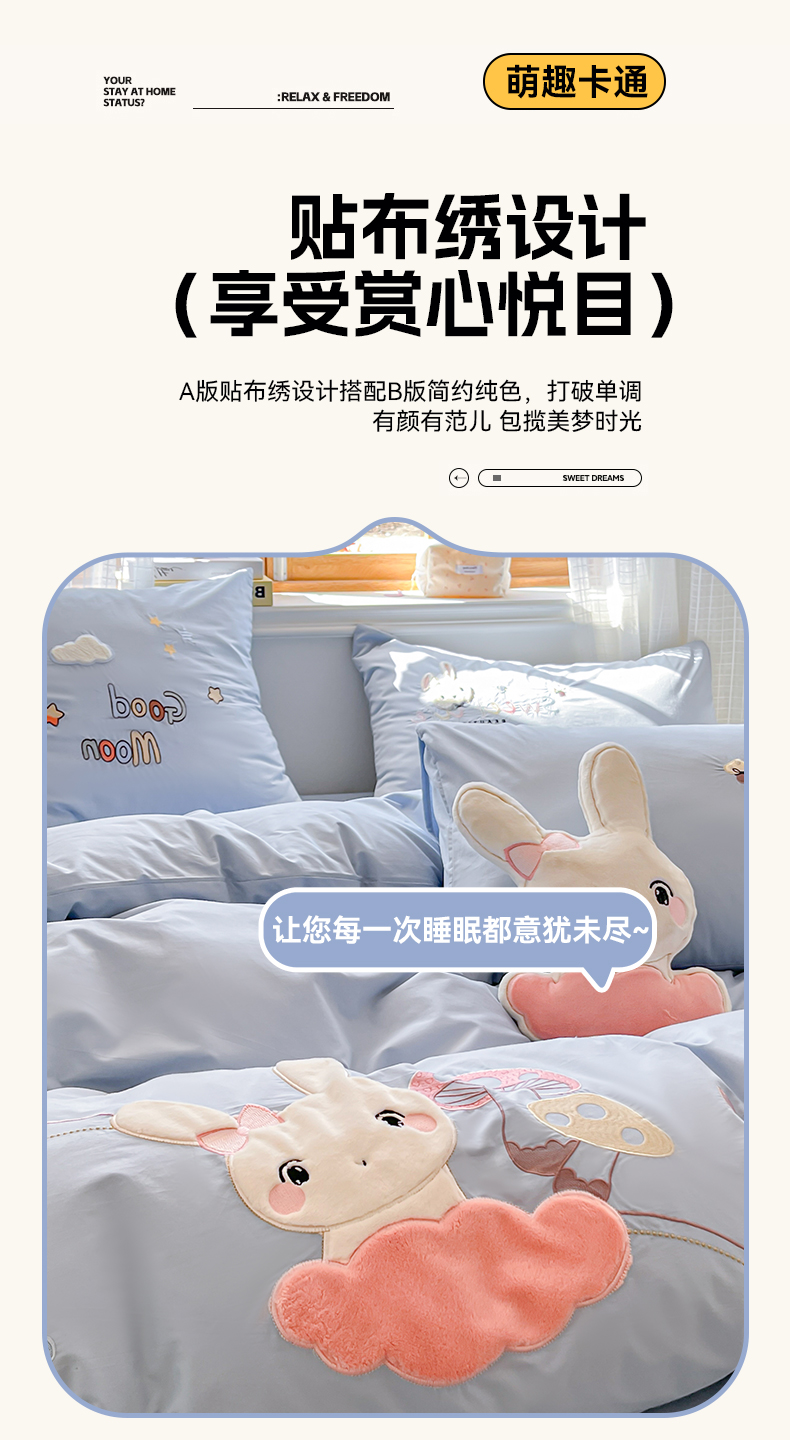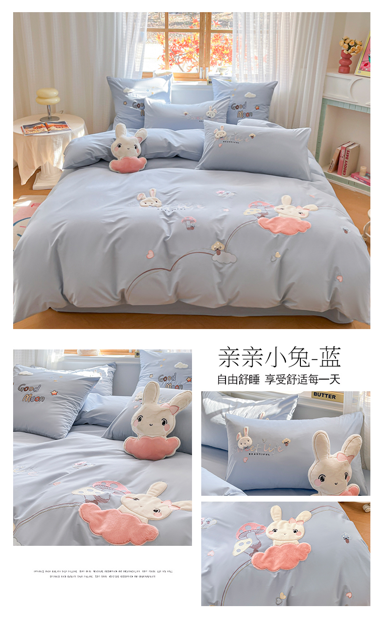 当前位置: 91家纺网 > 商品网购 > 床品套件 > 四件套 > 全棉普通四件套 > 恋绒2025新款亲肤全棉水洗棉纯棉贴布绣立体刺绣四件套系列—暗合款(提供买家秀)(送同款抱枕) 亲亲小兔-蓝
