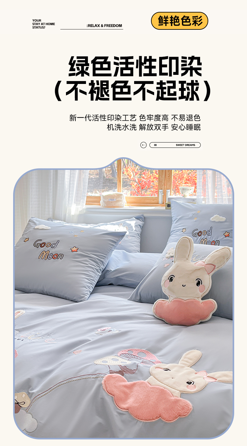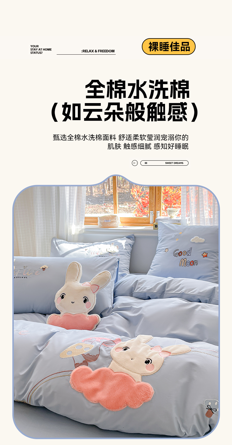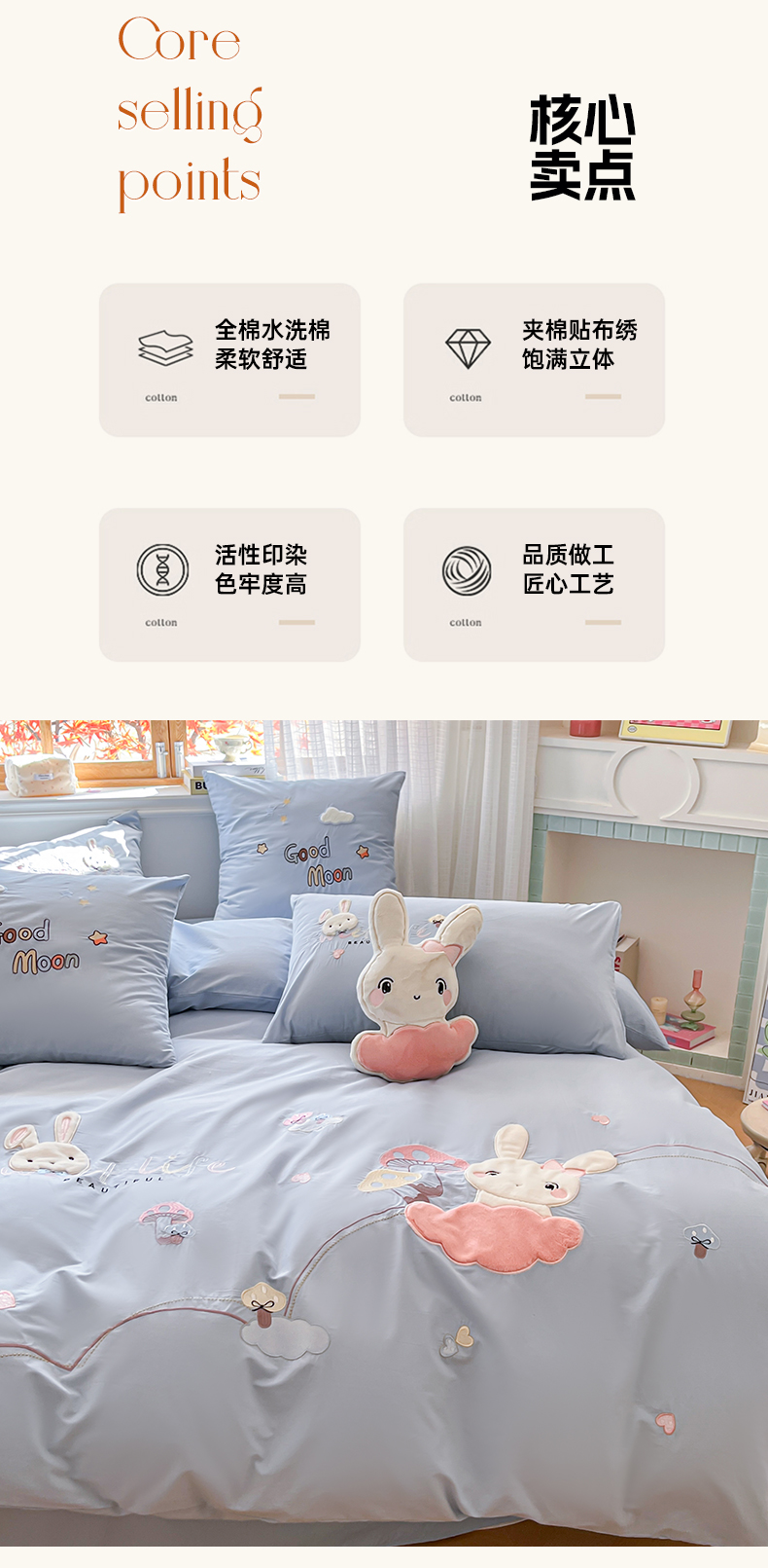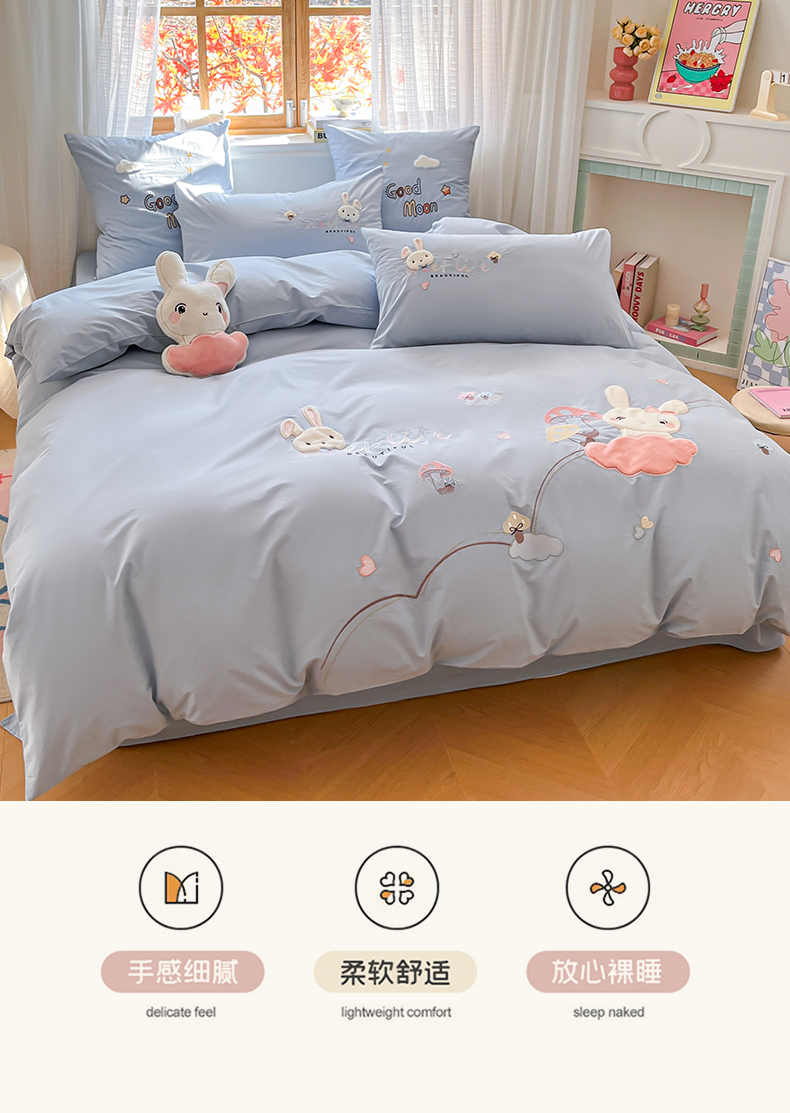 当前位置: 91家纺网 > 商品网购 > 床品套件 > 四件套 > 全棉普通四件套 > 恋绒2025新款亲肤全棉水洗棉纯棉贴布绣立体刺绣四件套系列—暗合款(提供买家秀)(送同款抱枕) 亲亲小兔-蓝