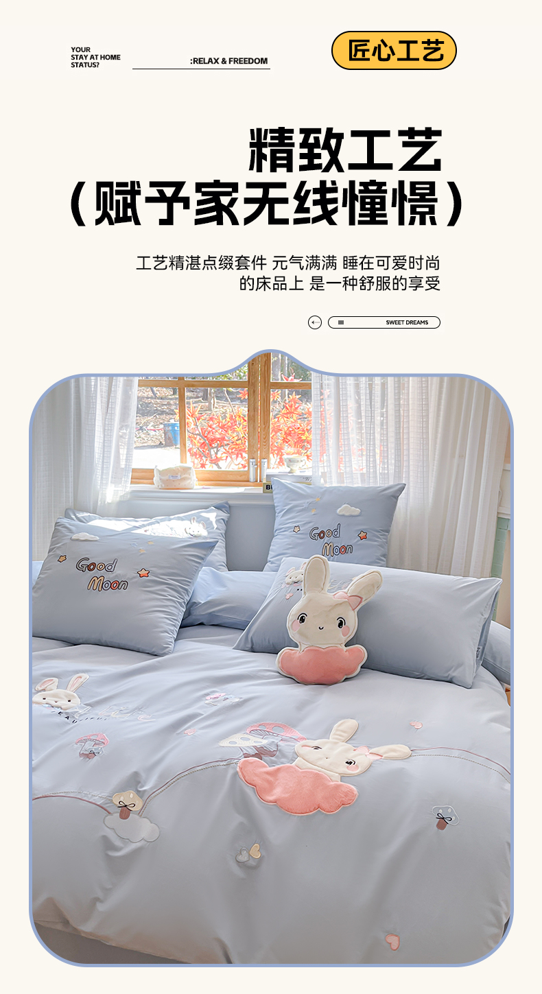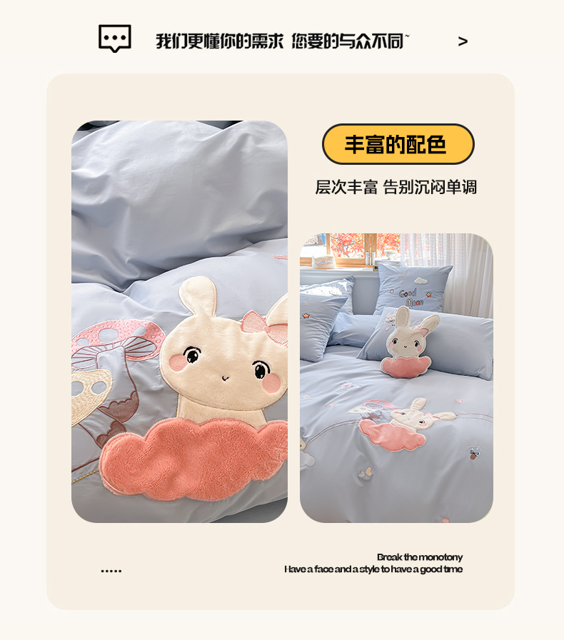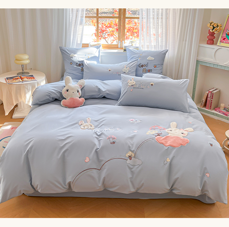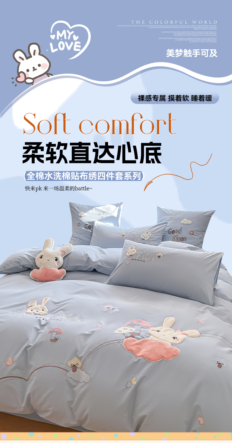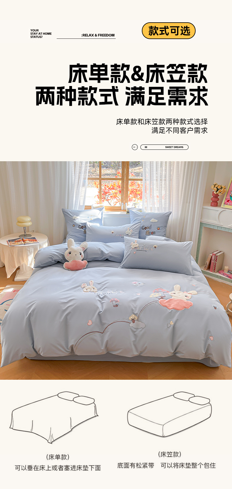 当前位置: 91家纺网 > 商品网购 > 床品套件 > 四件套 > 全棉普通四件套 > 恋绒2025新款亲肤全棉水洗棉纯棉贴布绣立体刺绣四件套系列—暗合款(提供买家秀)(送同款抱枕) 亲亲小兔-蓝