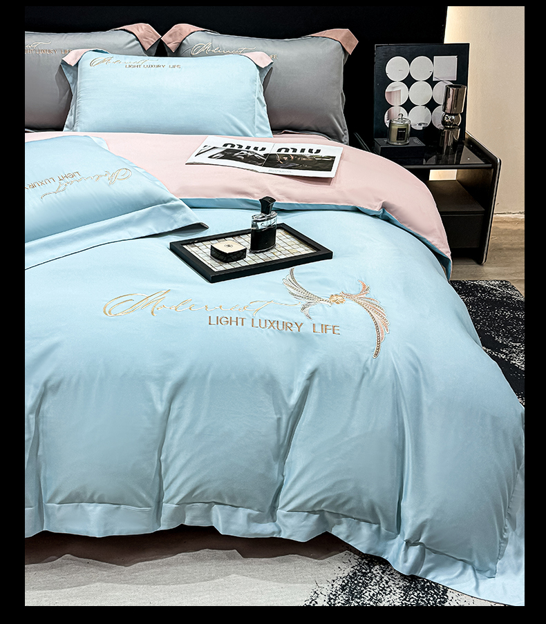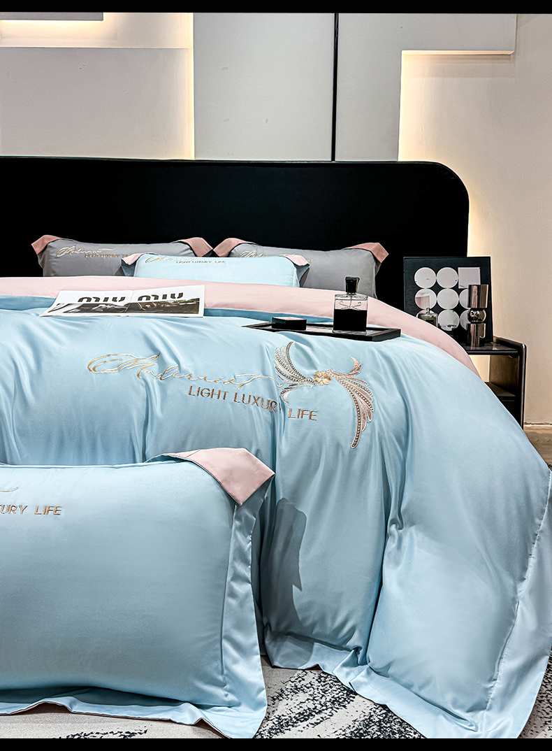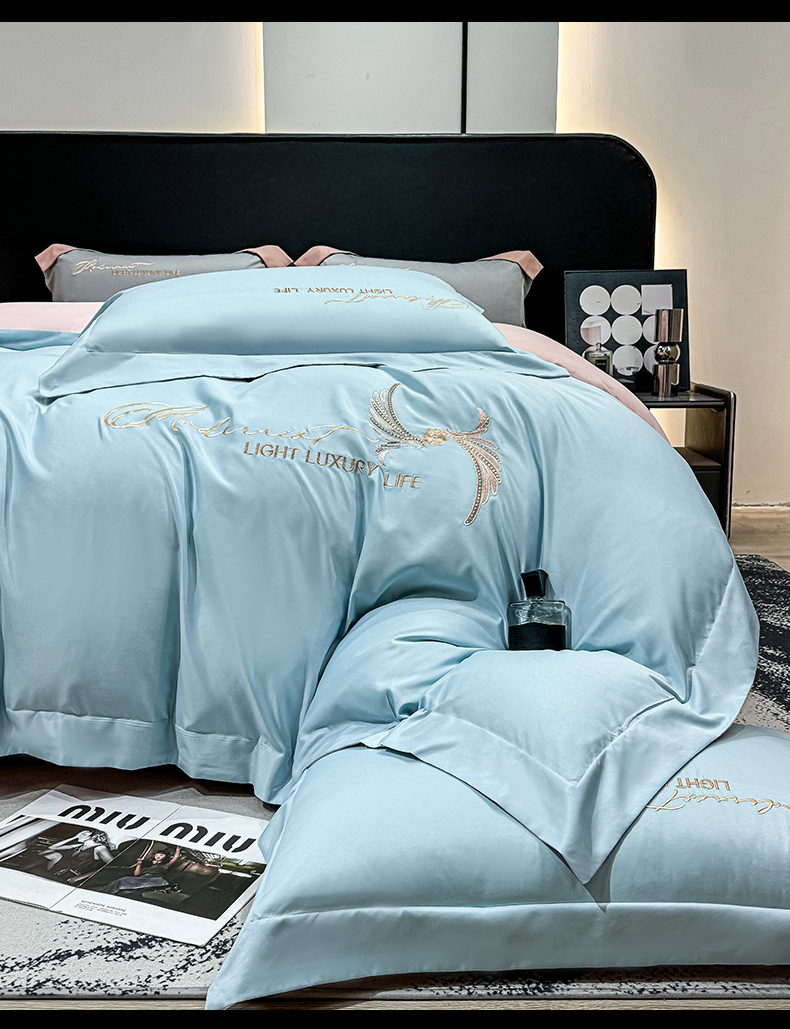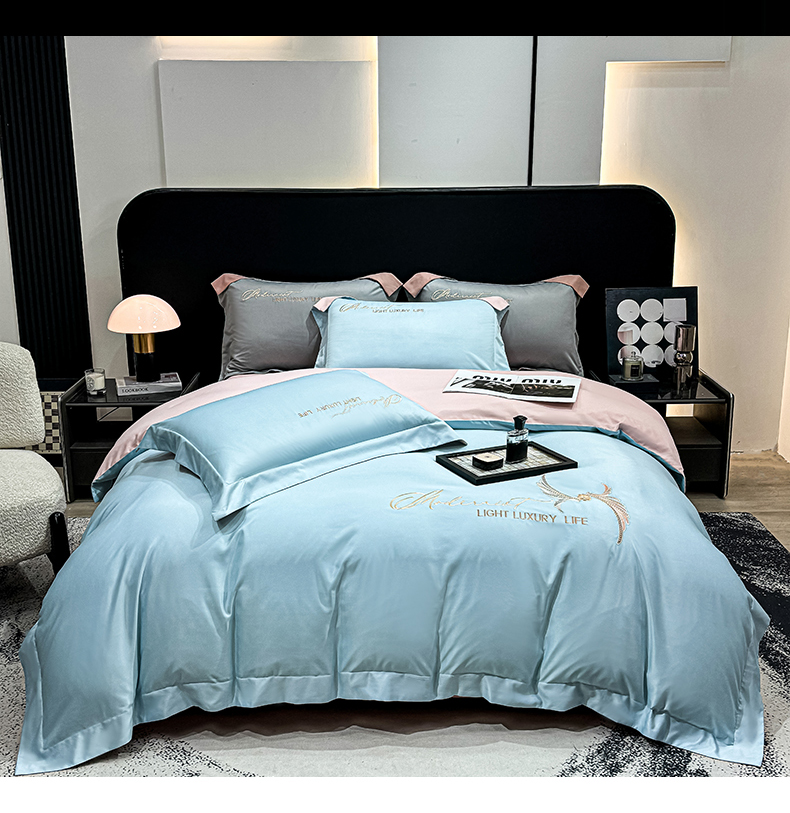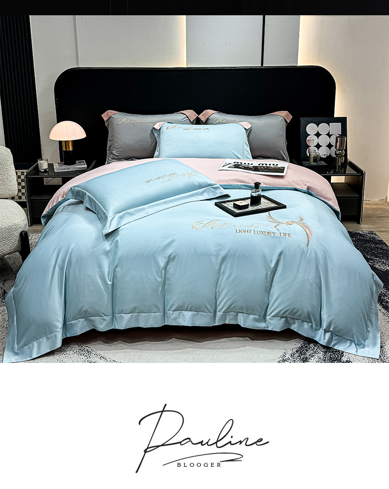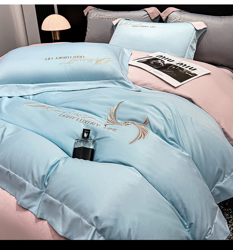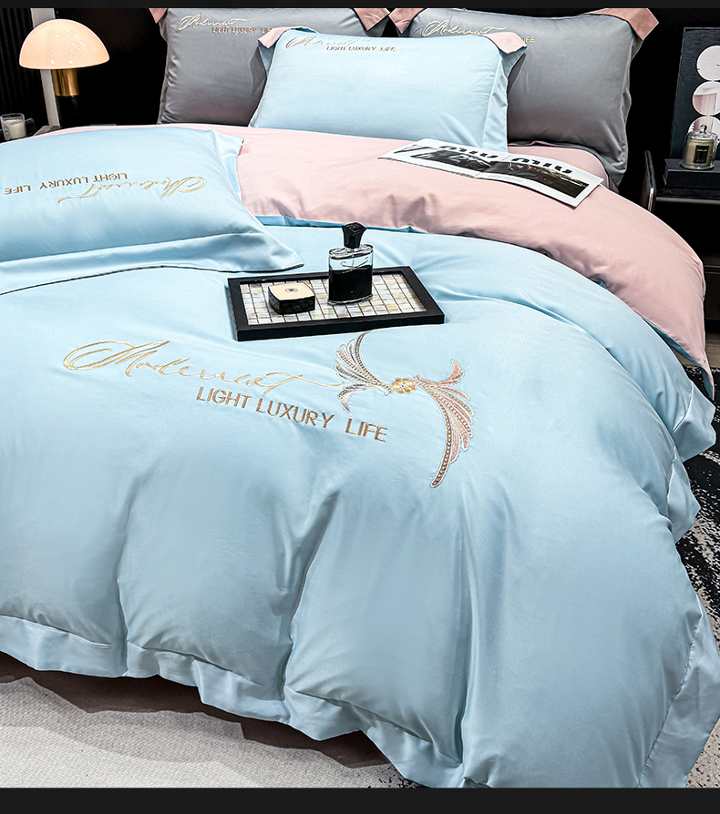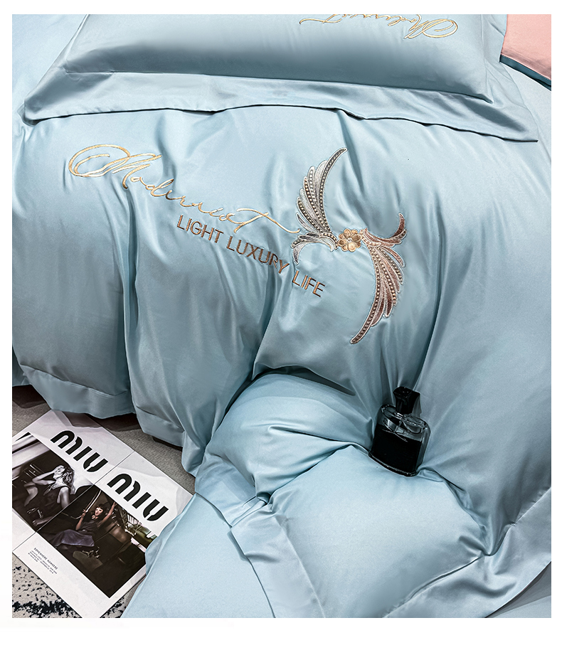 悦织湾家纺 亲肤120克水洗棉磨毛刺绣纯色四件套2025新款轻奢韩版公主风精致床上用品绣花4件套 宽境天蓝