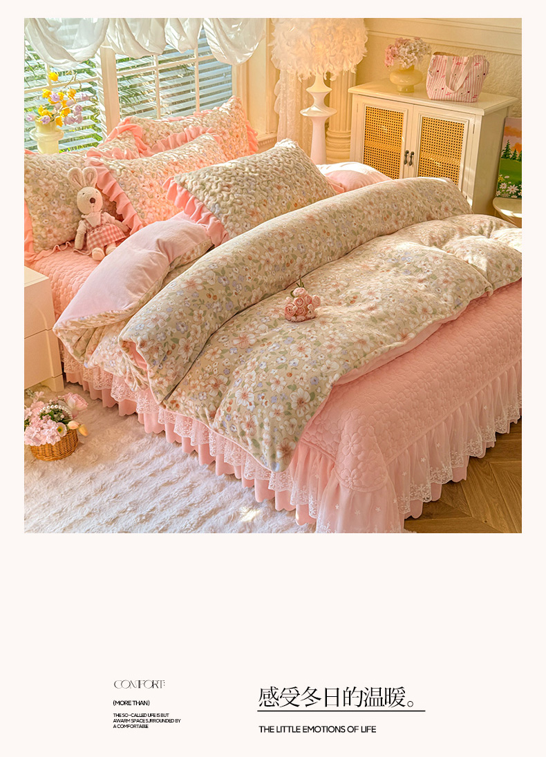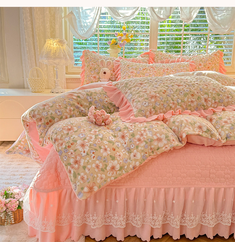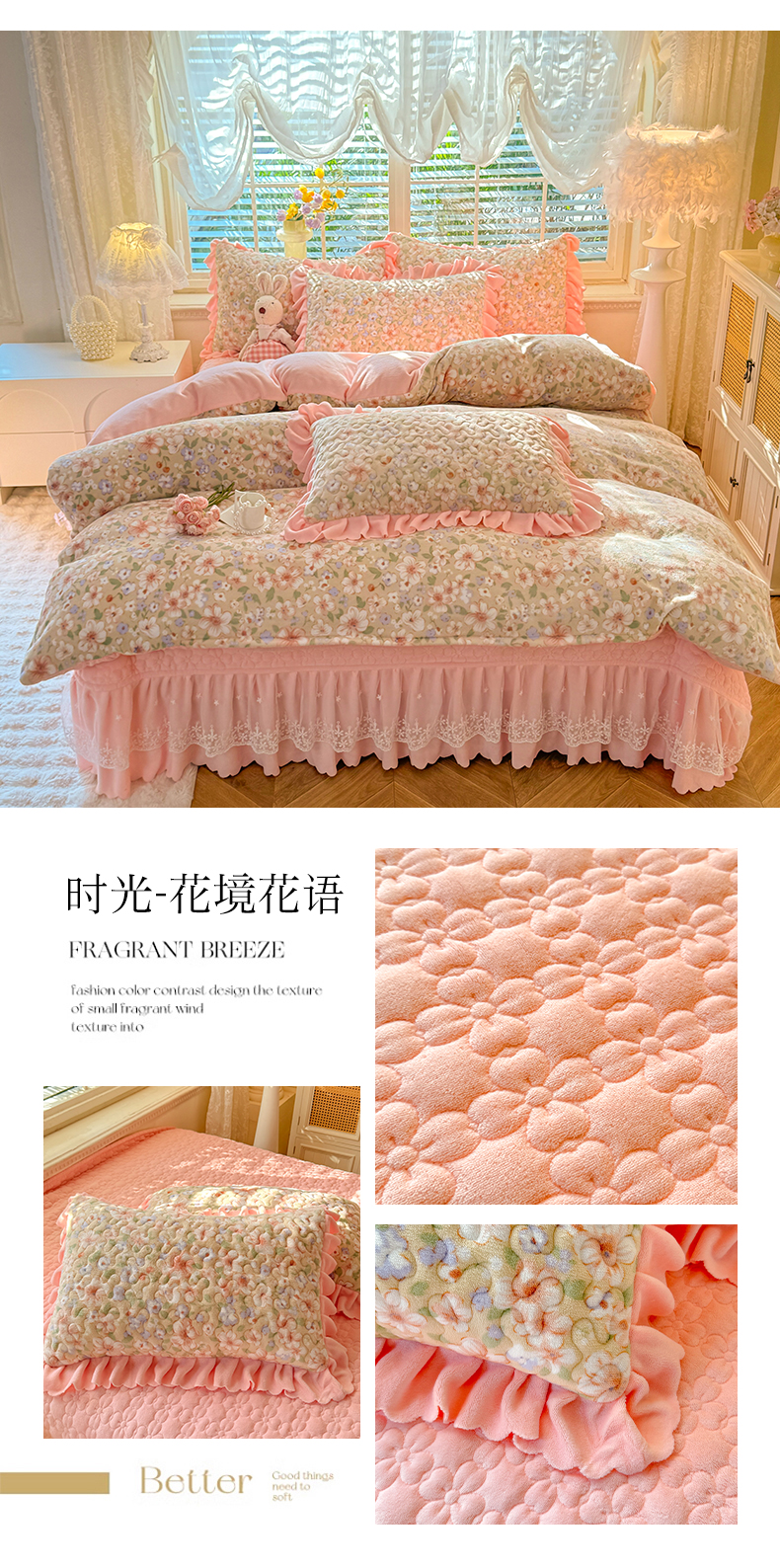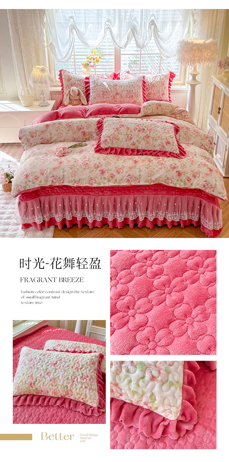 当前位置: 91家纺网 > 商品网购 > 床品套件 > 四件套 > 牛奶绒四件套 > 九诺家纺 2025新款直播热款双层蕾丝花边牛奶绒印花床盖四件套床盖单件三件套 风情-沐熙花