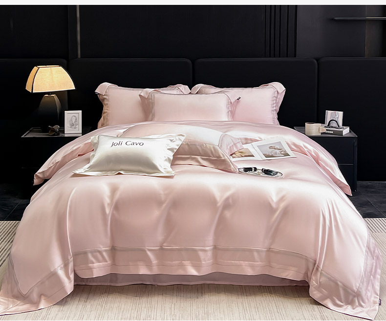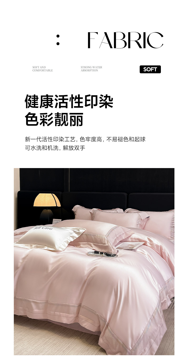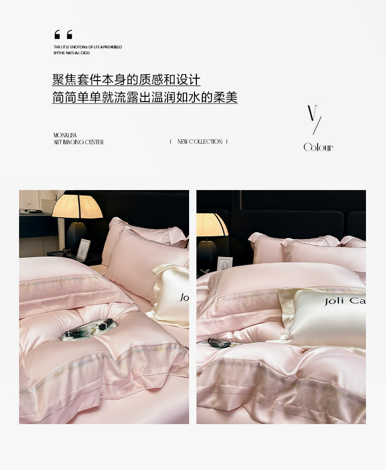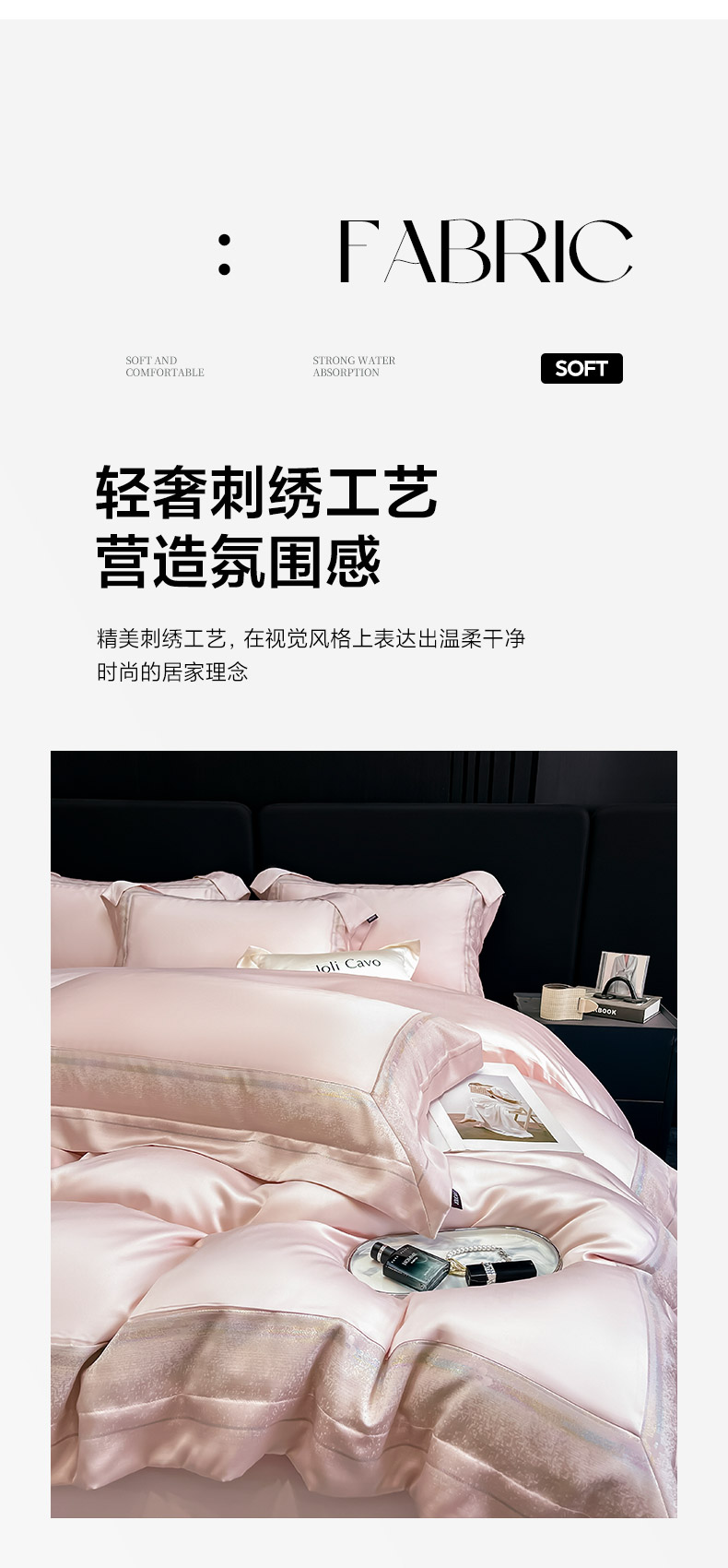 商品名称:2025轻奢风A类贡缎长绒棉四件套纯棉全棉重工刺绣被套床单高端拼接床上用品 馥雅-慕斯粉