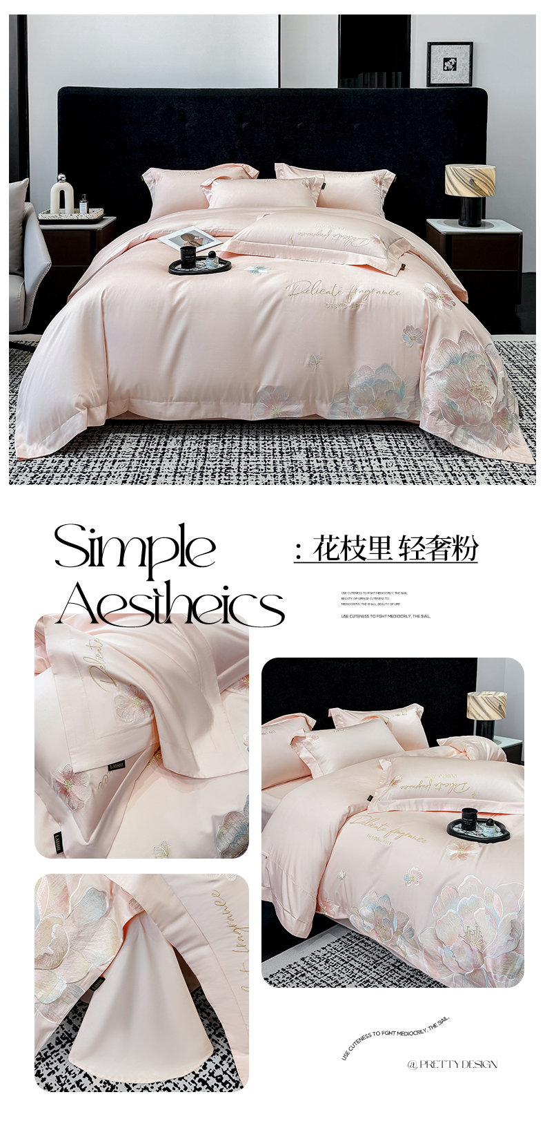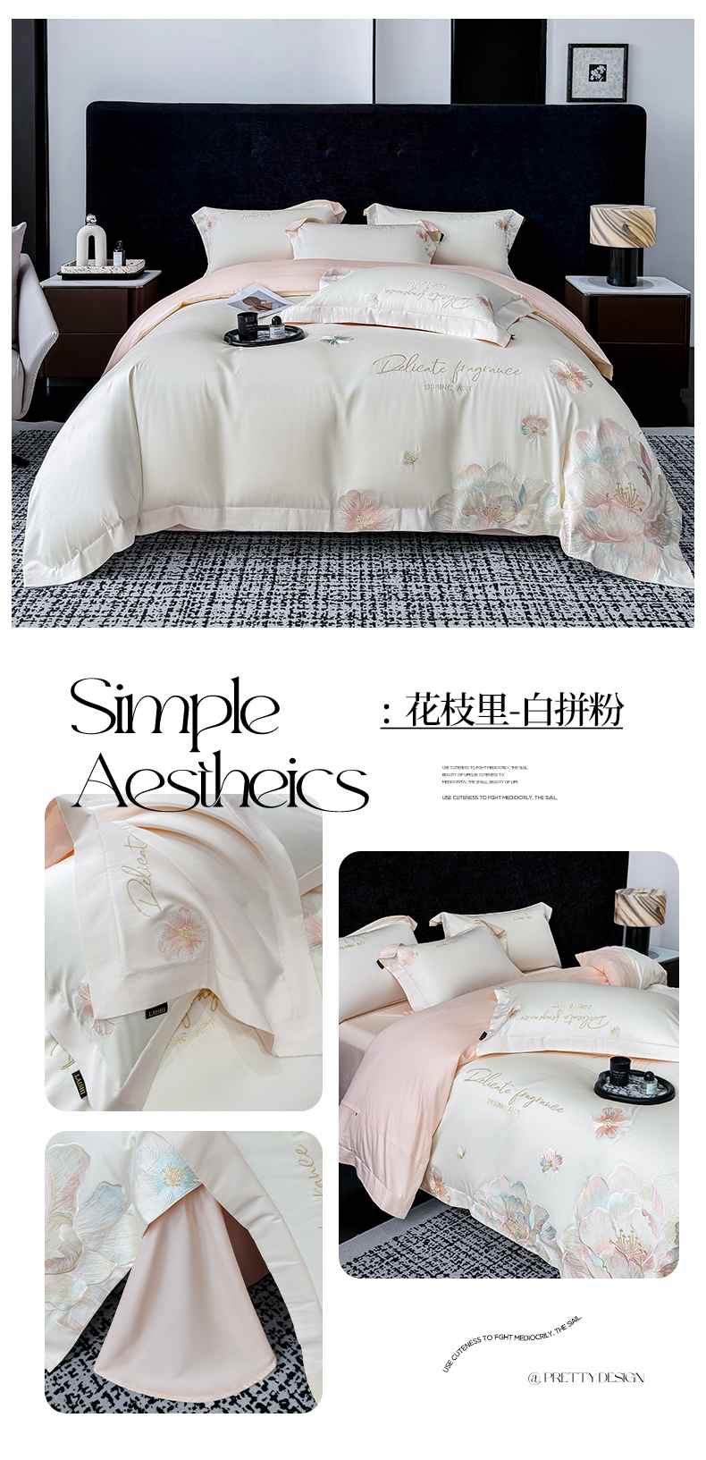 (总)莱势 2026新品A类50支高密贡缎长绒棉四件套-花枝里系列,花枝里-白拼粉,花枝里-轻奢粉,花枝里-天空蓝,花枝里-香芋紫