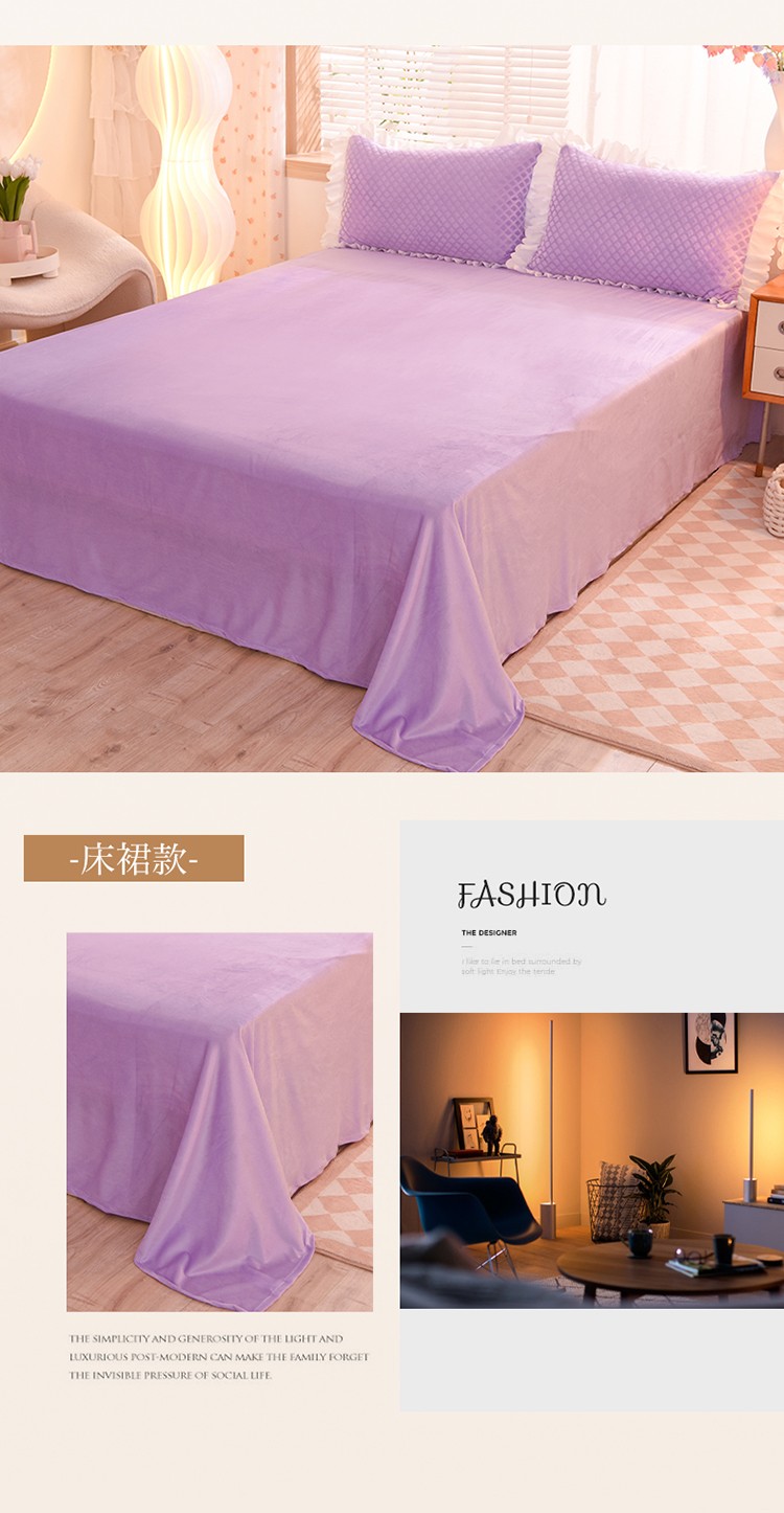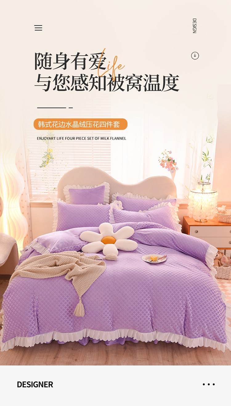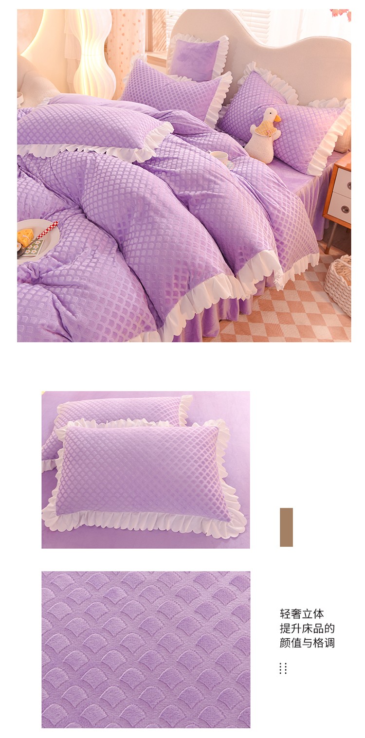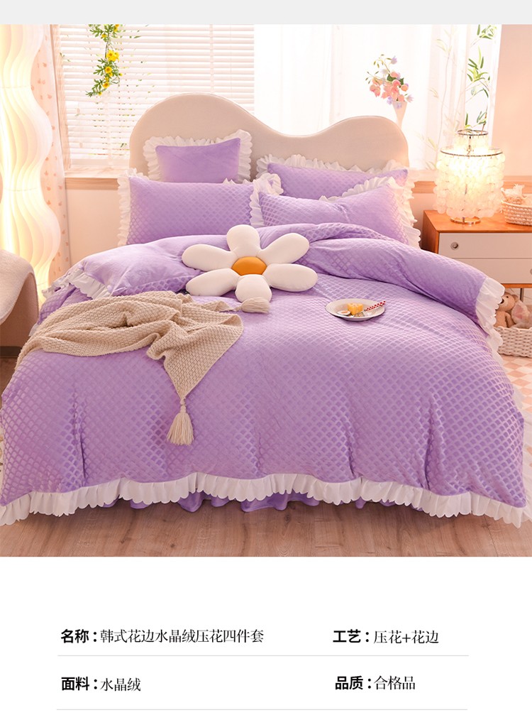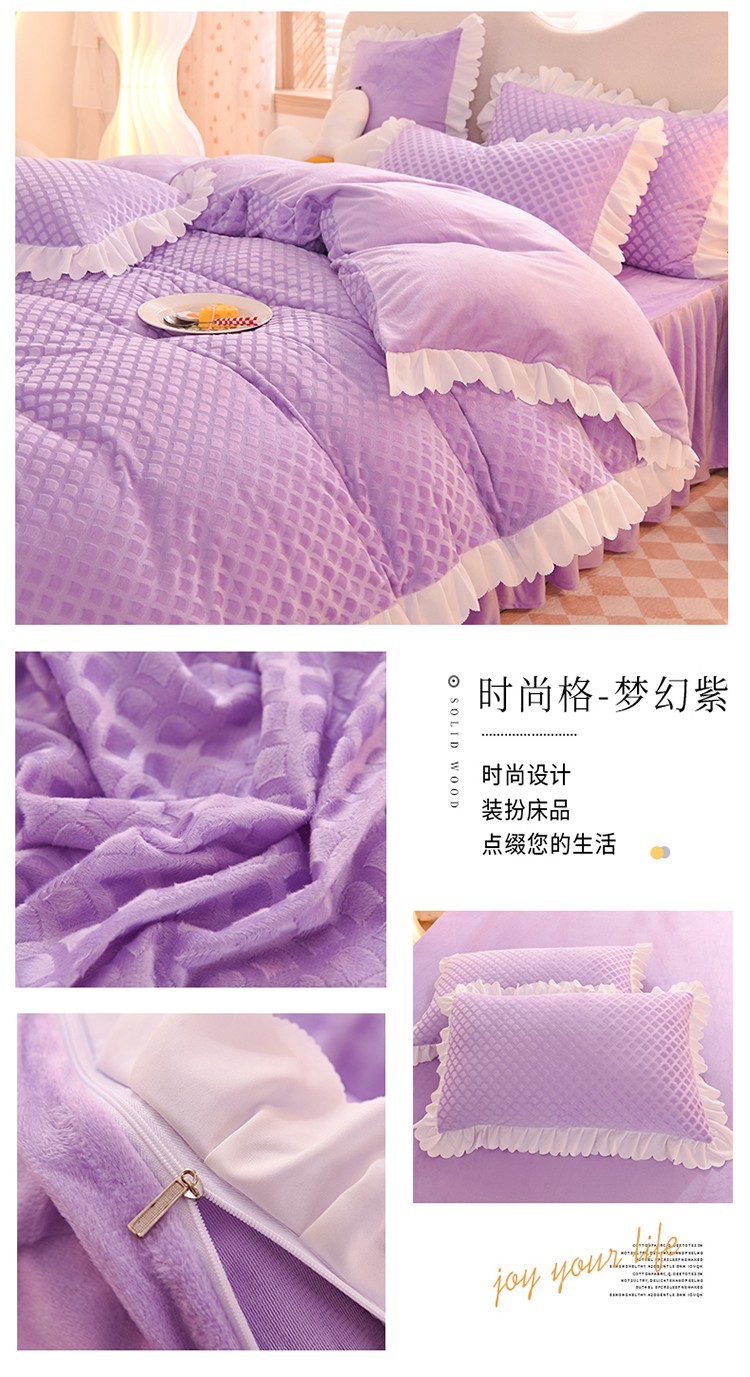 当前位置: 91家纺网 > 商品网购 > 床品套件 > 四件套 > 牛奶绒四件套 > 梦之岛 2022新款韩版牛奶绒水晶绒剪花四件套 时尚格-梦幻紫