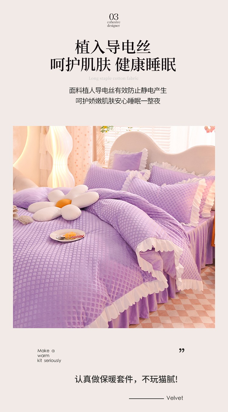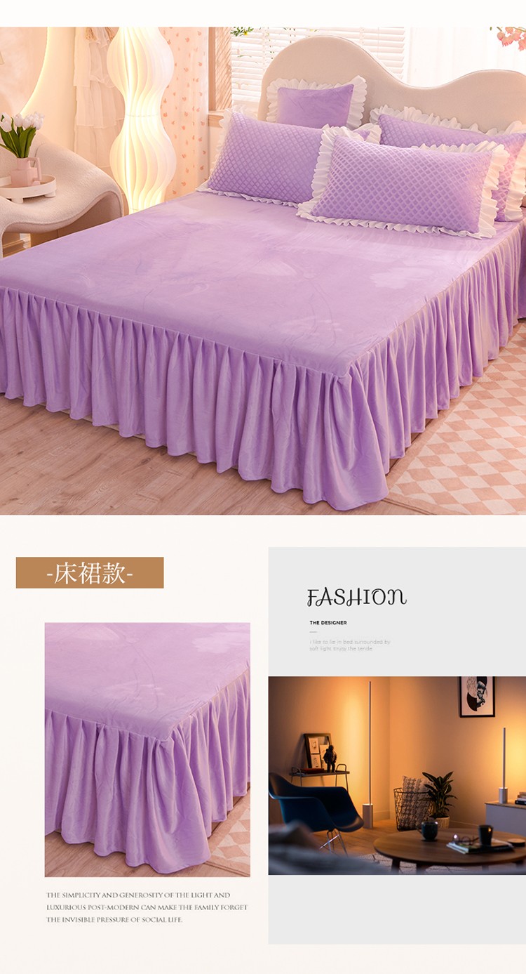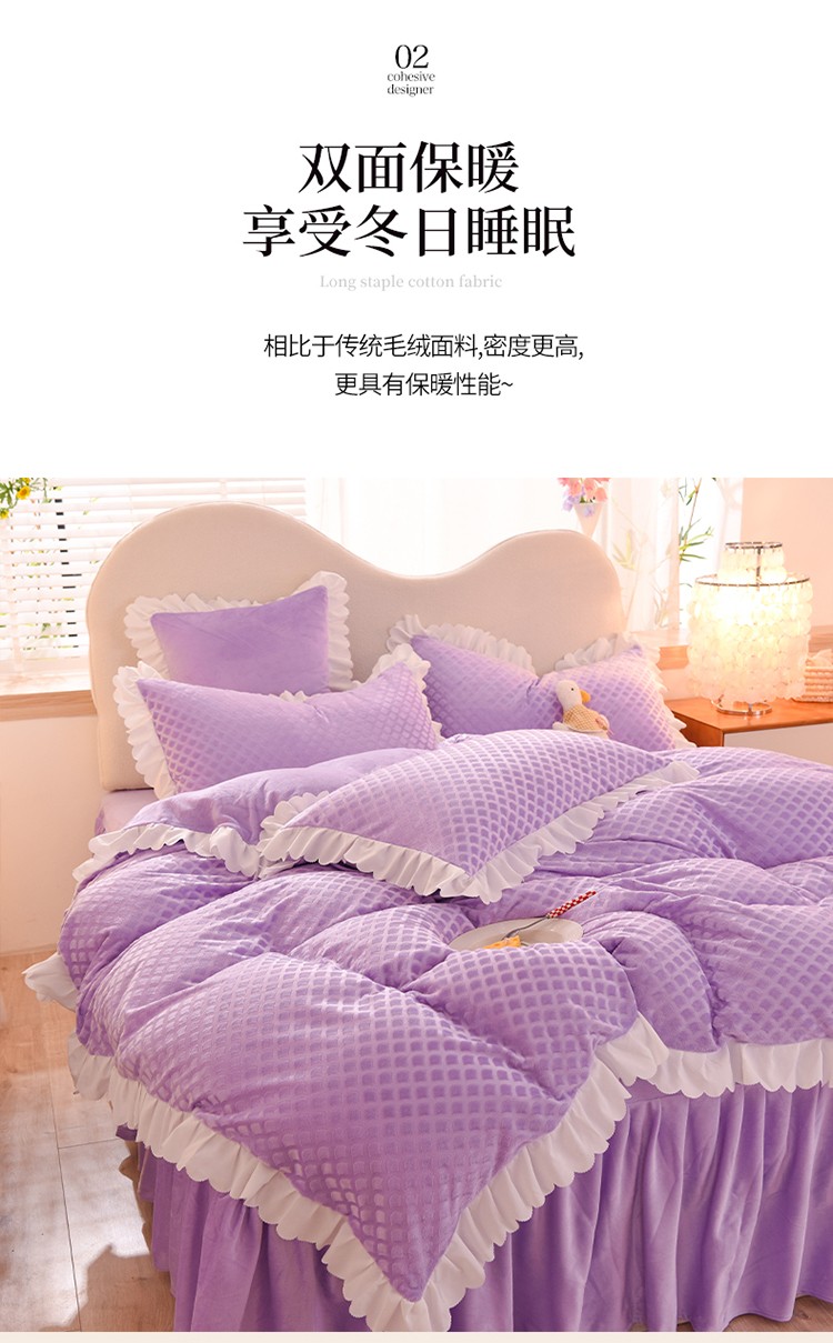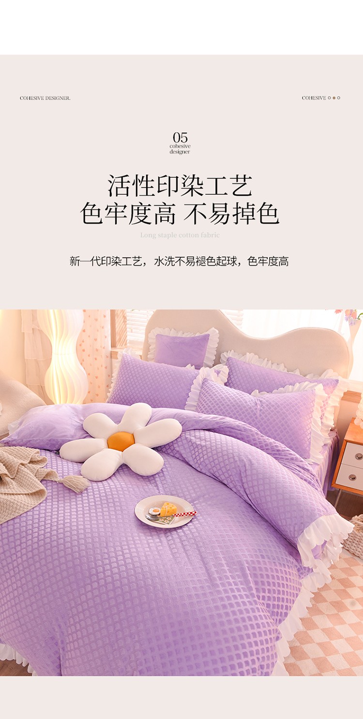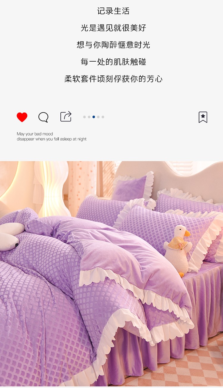 当前位置: 91家纺网 > 商品网购 > 床品套件 > 四件套 > 牛奶绒四件套 > 梦之岛 2022新款韩版牛奶绒水晶绒剪花四件套 时尚格-梦幻紫