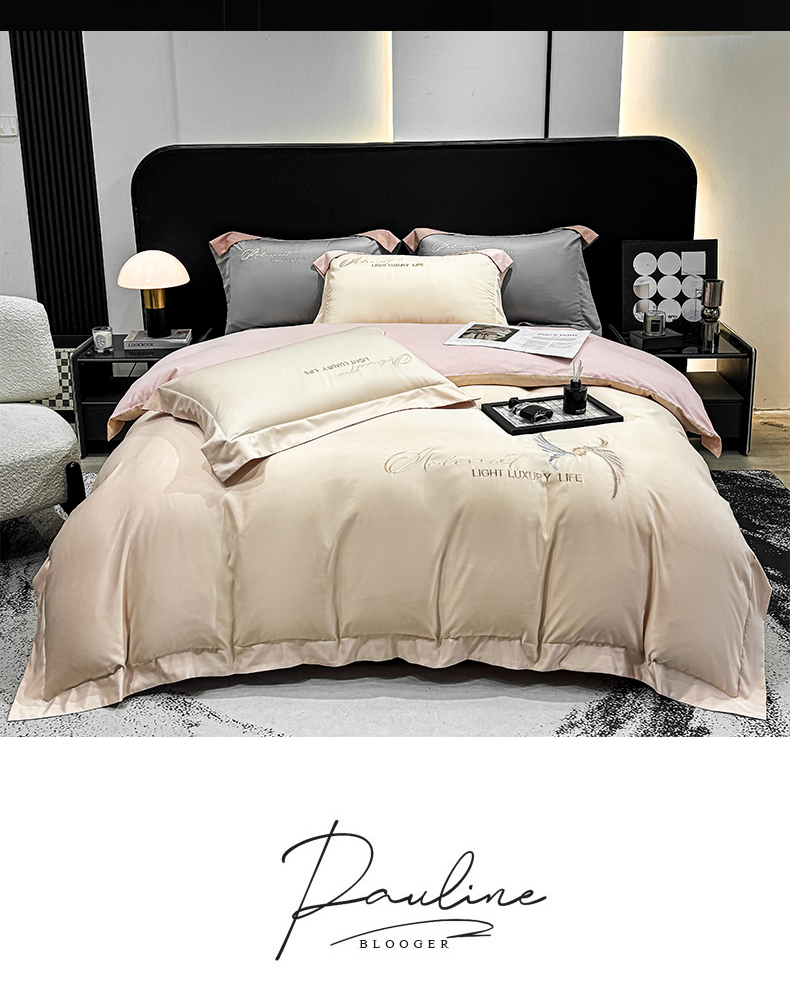 悦织湾家纺 亲肤120克水洗棉磨毛刺绣纯色四件套2025新款轻奢韩版公主风精致床上用品绣花4件套 宽境香槟