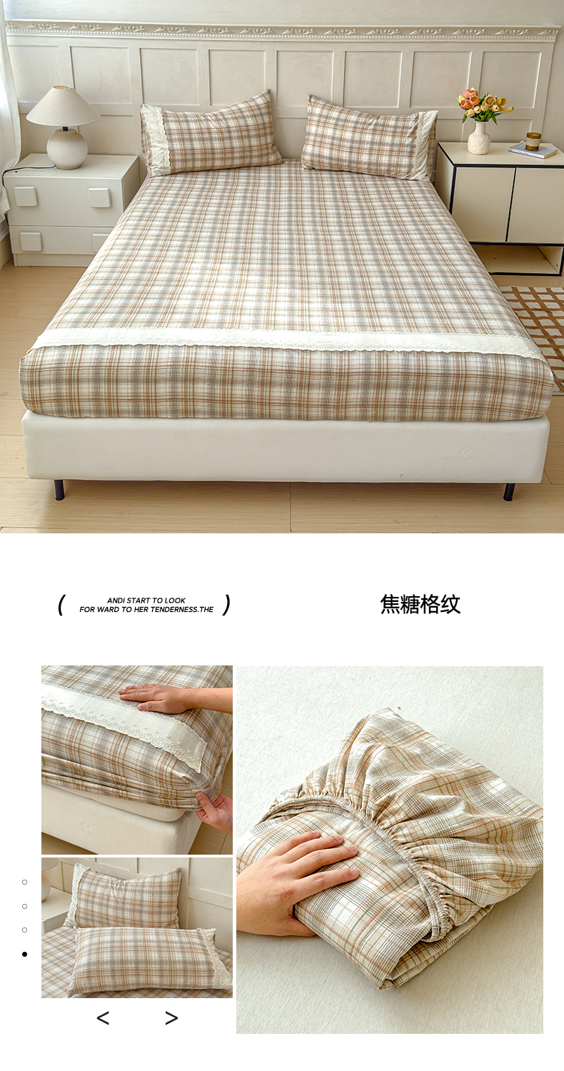当前位置: 91家纺网 > 商品网购 > 床品套件 > 三件套 > 富阿娜家纺 2026年新款小布袋简约复古花边床笠三件套 焦糖格纹