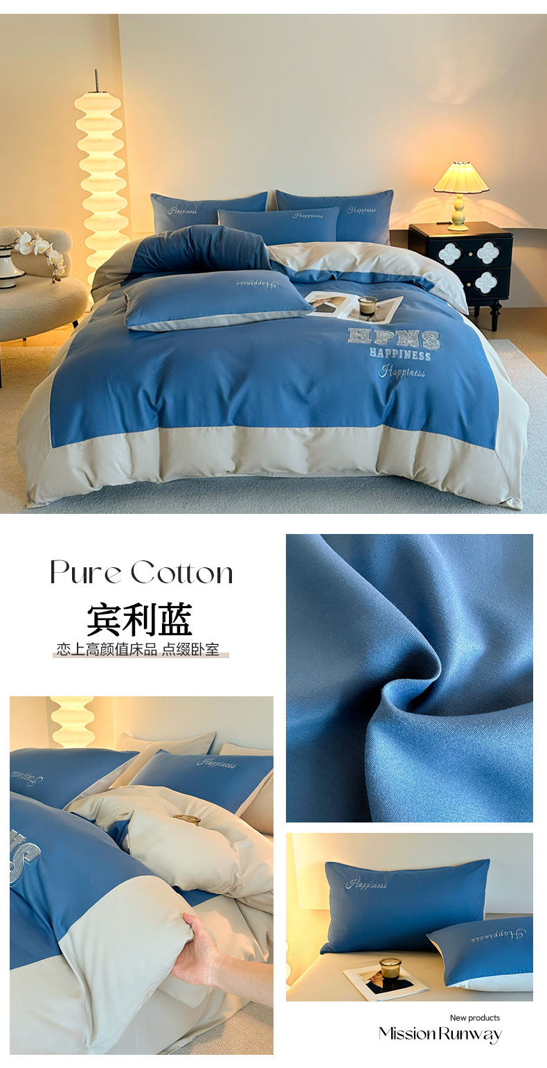 麦空家居 2026新款提花大拼角贴布水洗棉四件套 宾利蓝