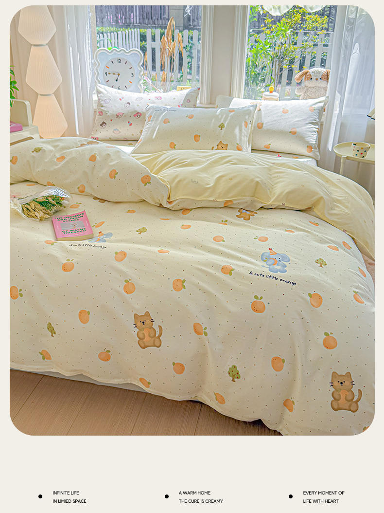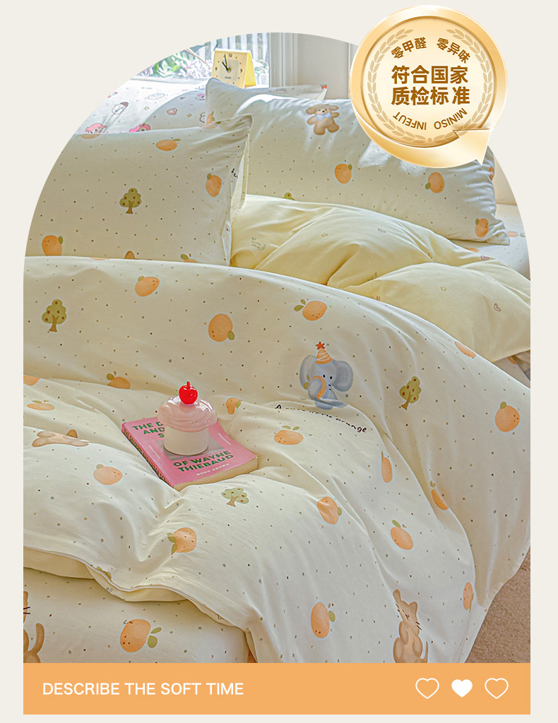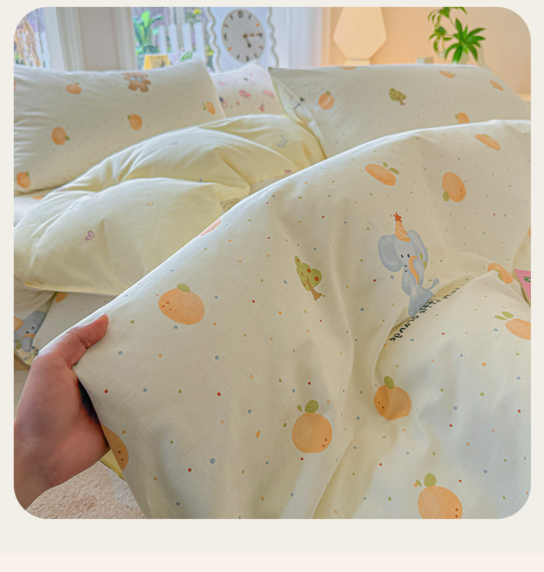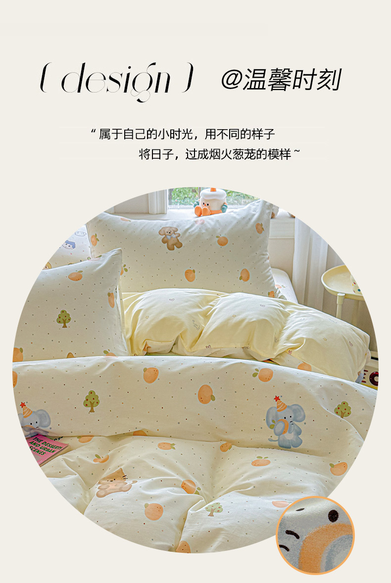 当前位置: 91家纺网 > 商品网购 > 床品套件 > 四件套 > 全棉普通四件套 > 女子家纺 2026新款全棉印花四件套系列 橘子象宝