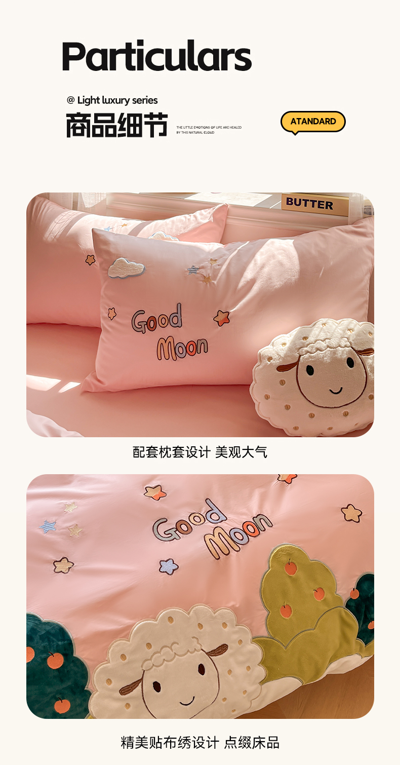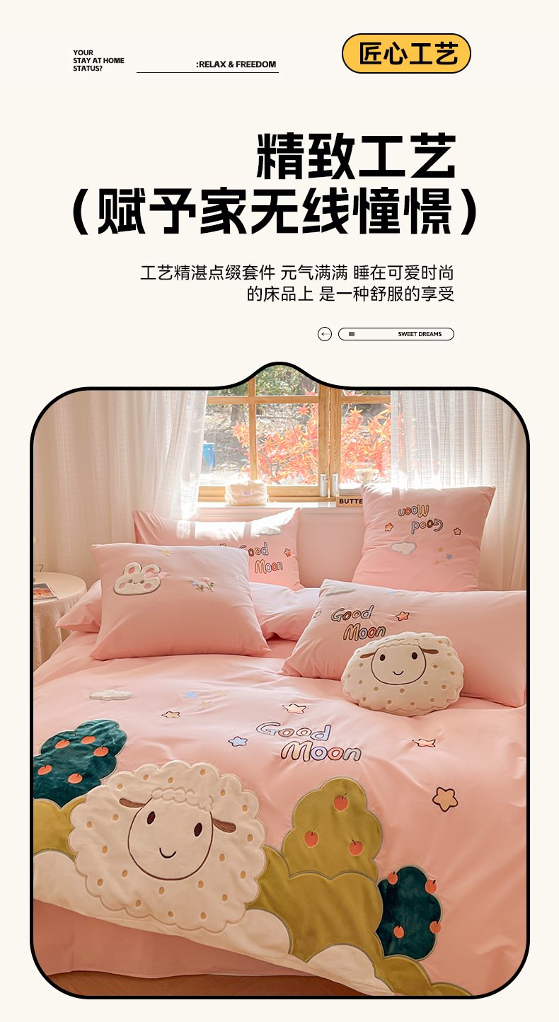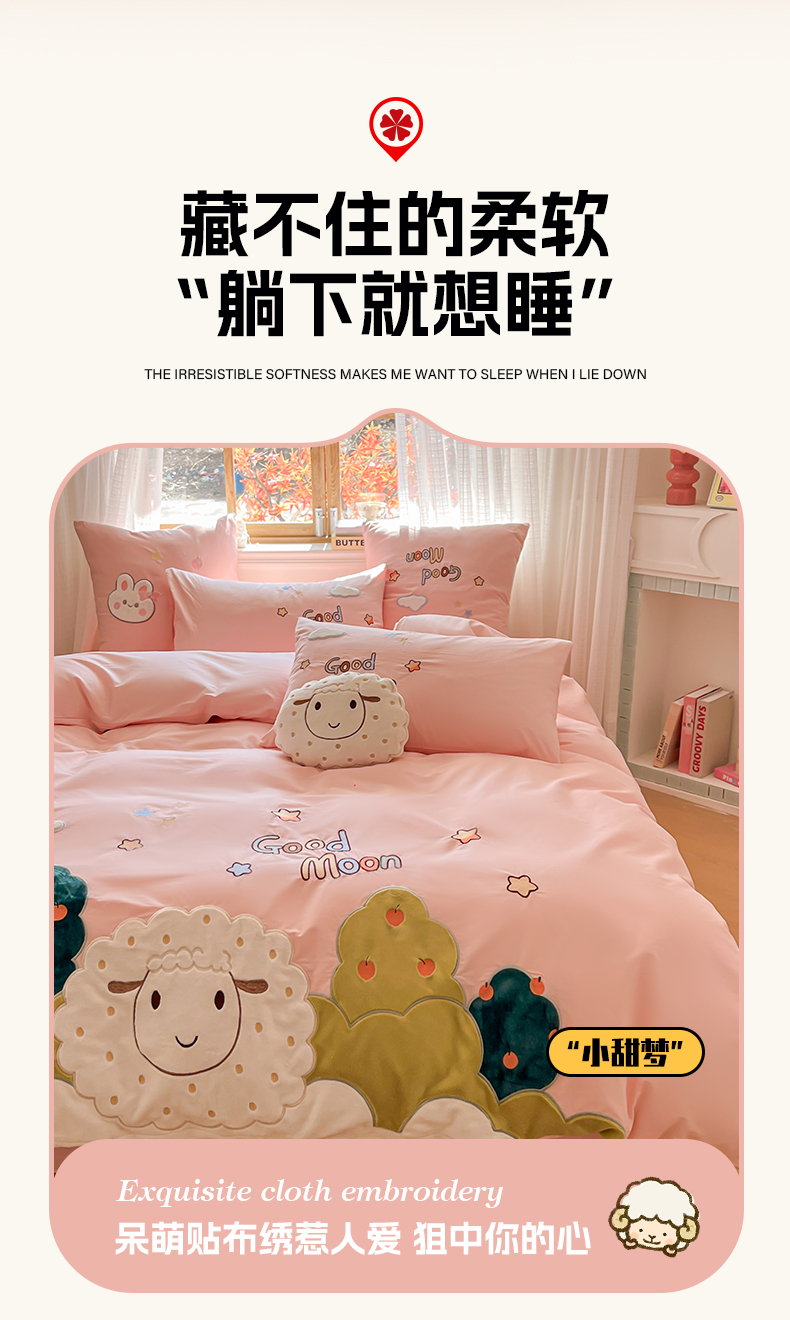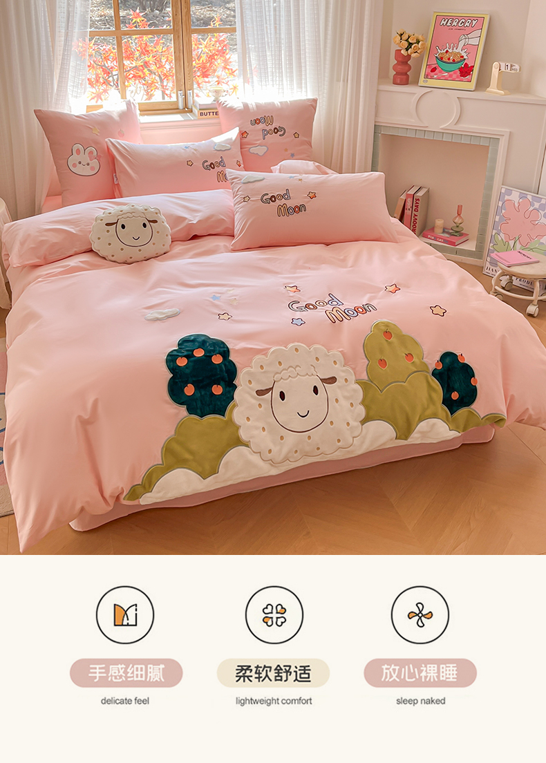 当前位置: 91家纺网 > 商品网购 > 床品套件 > 四件套 > 全棉普通四件套 > 恋绒2025新款亲肤全棉水洗棉纯棉贴布绣立体刺绣四件套系列—暗合款(提供买家秀)(送同款抱枕) 羊咩咩-粉