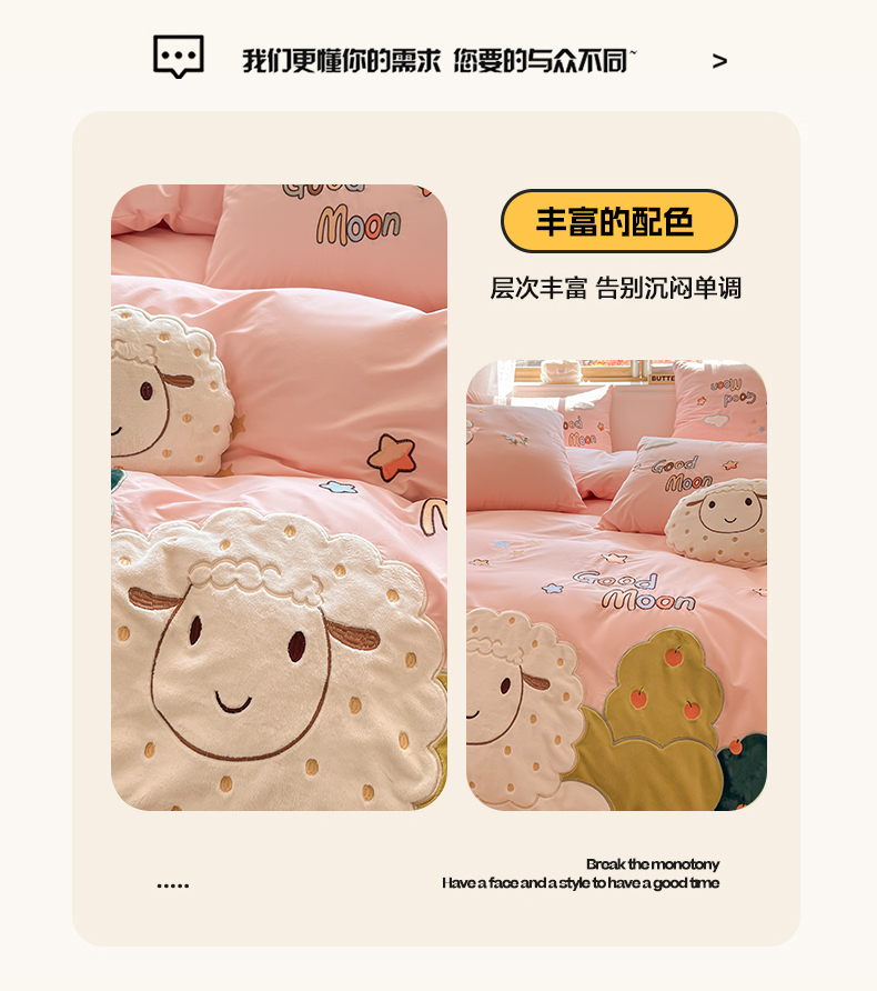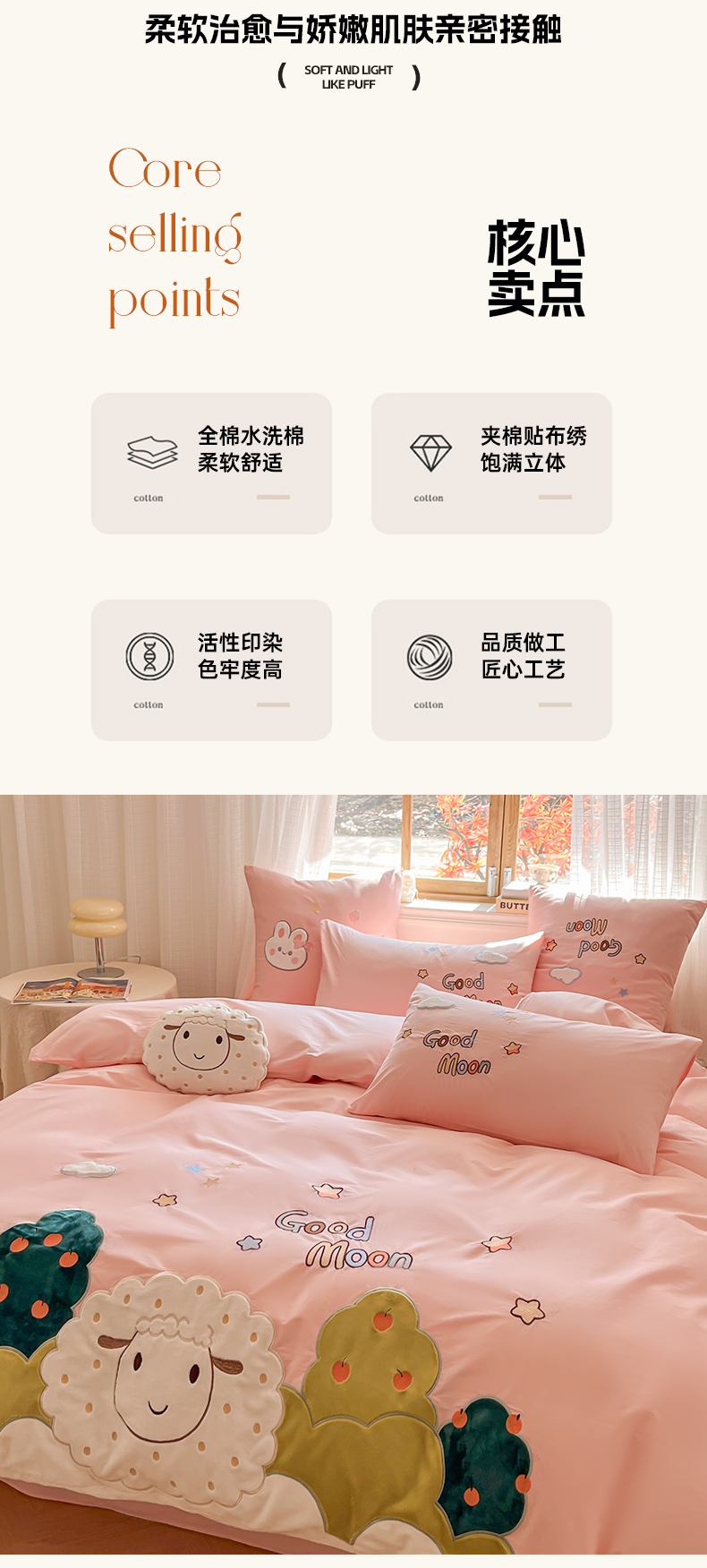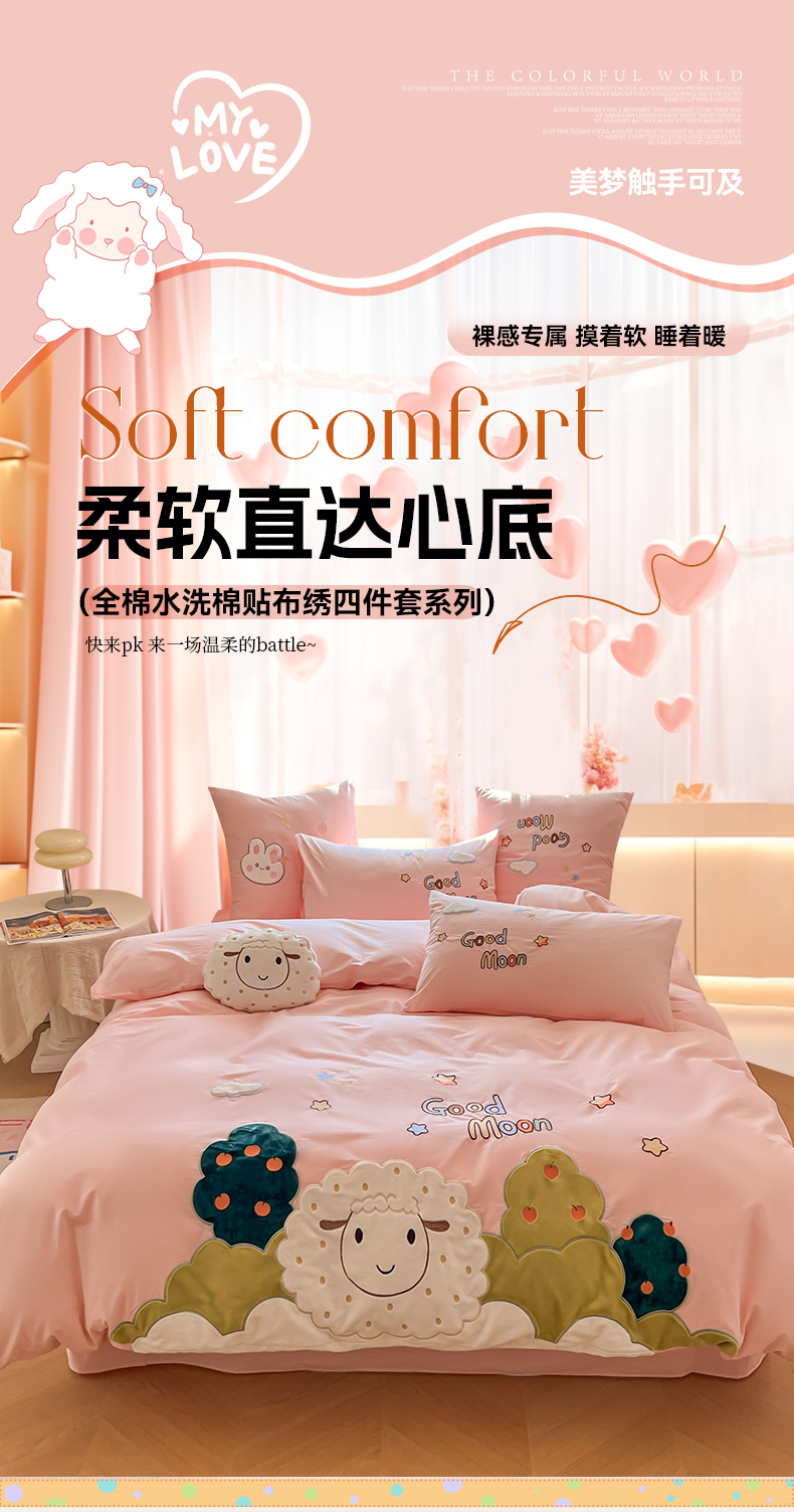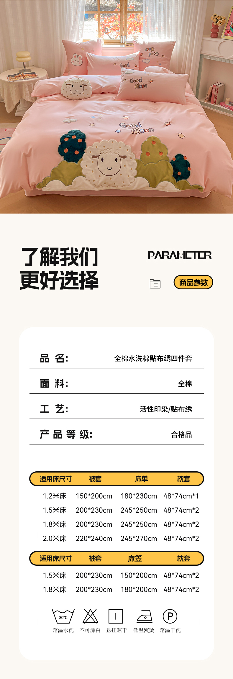 当前位置: 91家纺网 > 商品网购 > 床品套件 > 四件套 > 全棉普通四件套 > 恋绒2025新款亲肤全棉水洗棉纯棉贴布绣立体刺绣四件套系列—暗合款(提供买家秀)(送同款抱枕) 羊咩咩-粉
