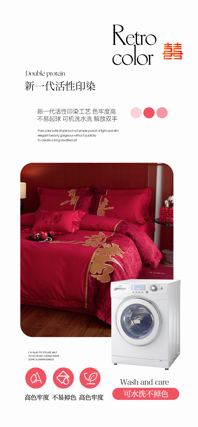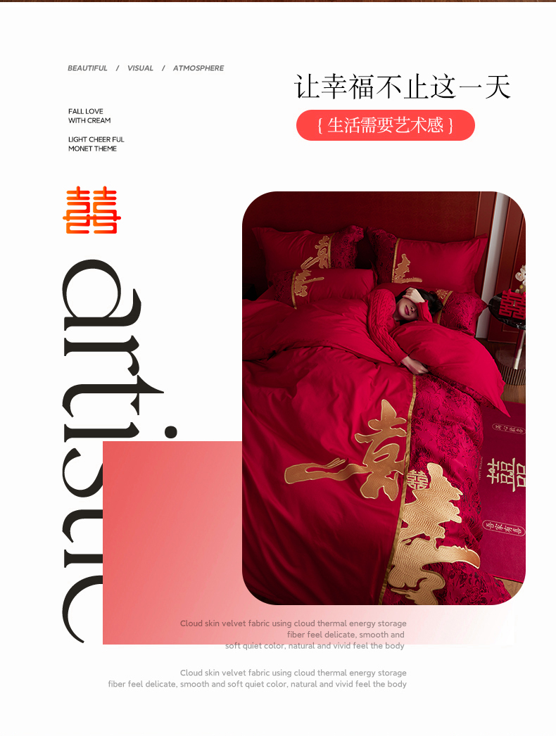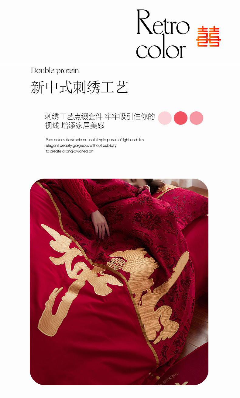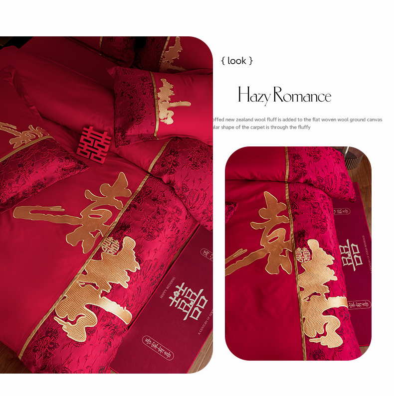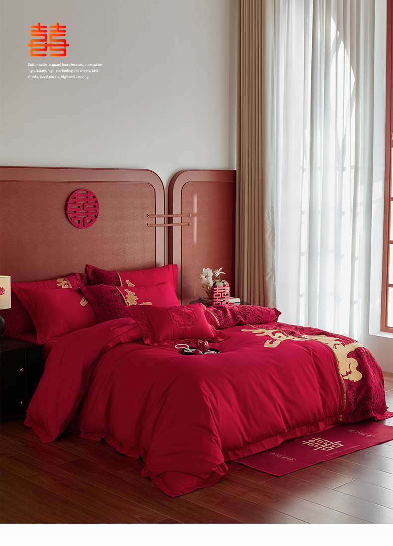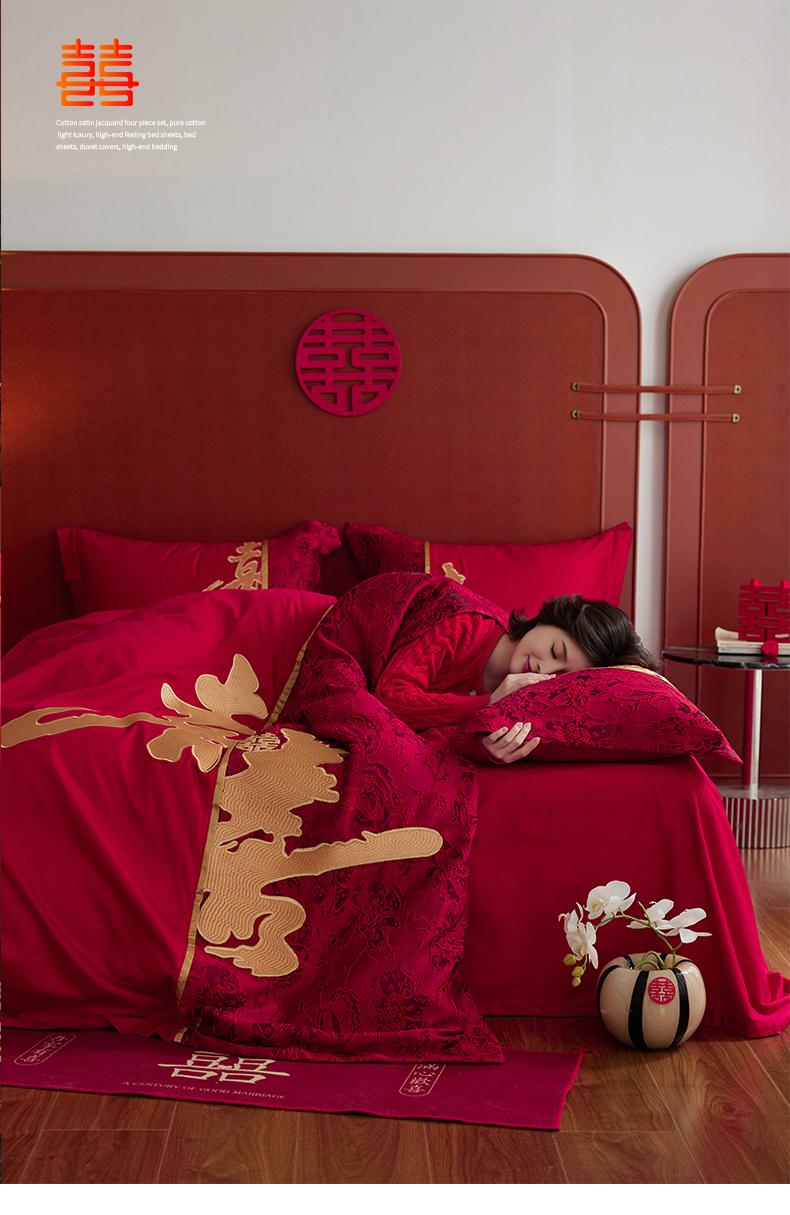 当前位置: 91家纺网 > 商品网购 > 床品套件 > 四件套 > 婚庆四件套 > (总)红番天婚庆 2025年新款新中式婚庆纯棉刺绣四件套-喜书系列
