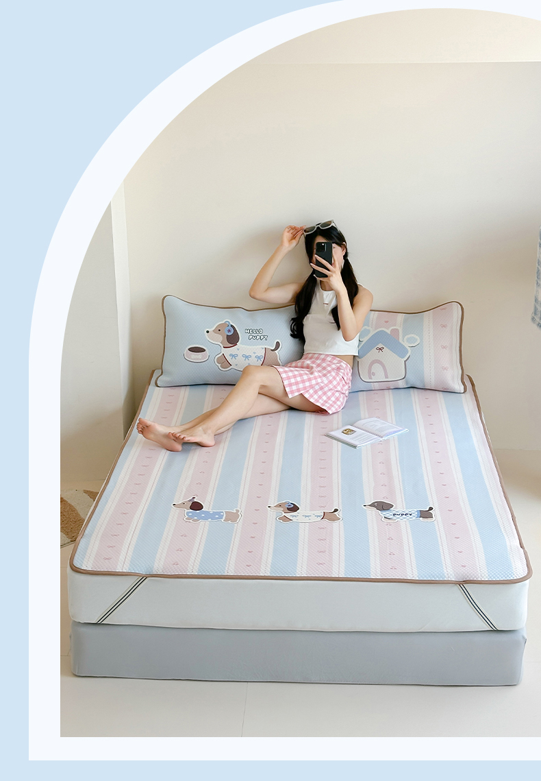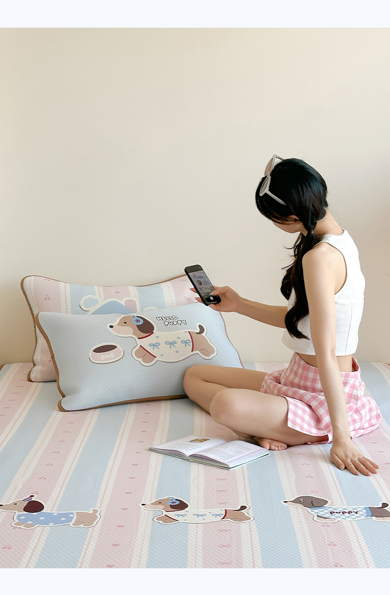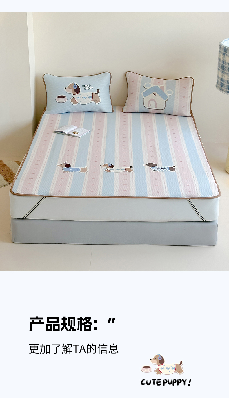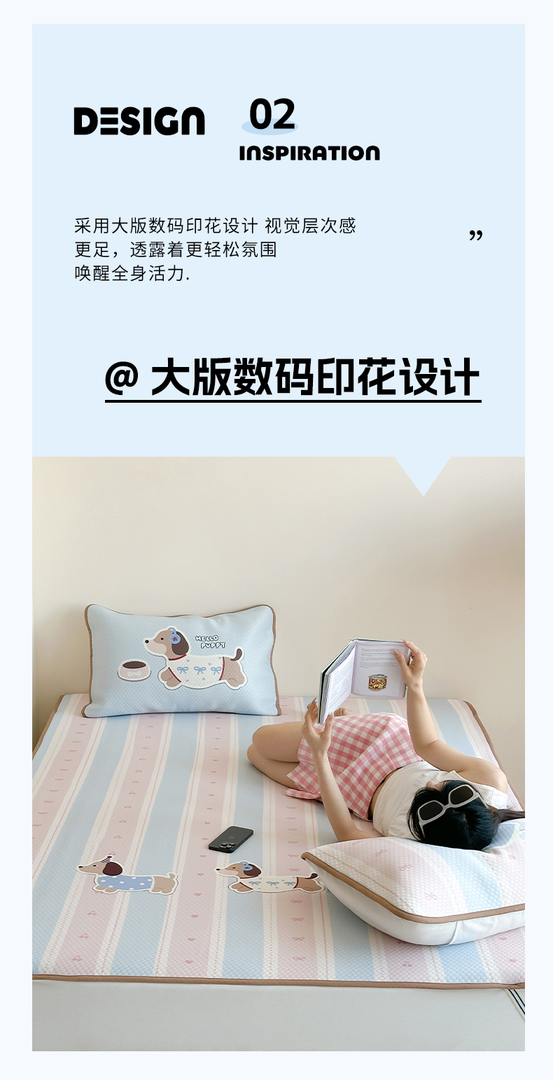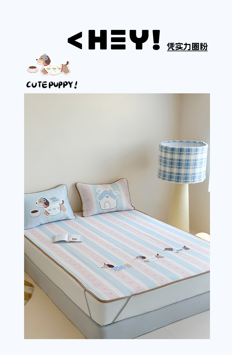 商品名称:RYB红黄兰 2025新款ins设计师原创A类数码大版卡通印花冰豆豆席凉席席子 甜心腊肠狗