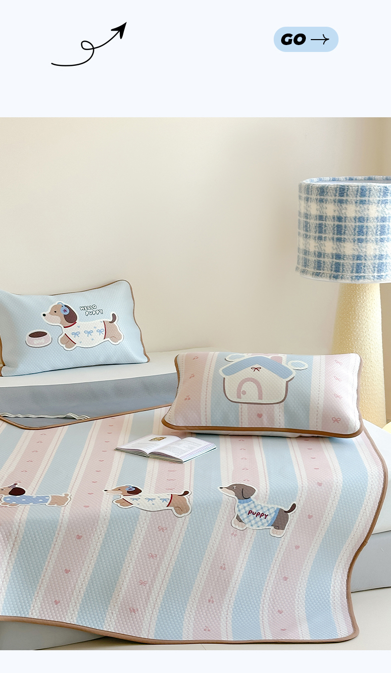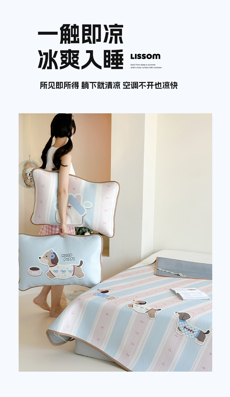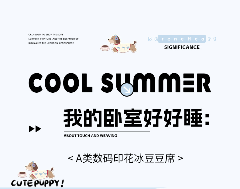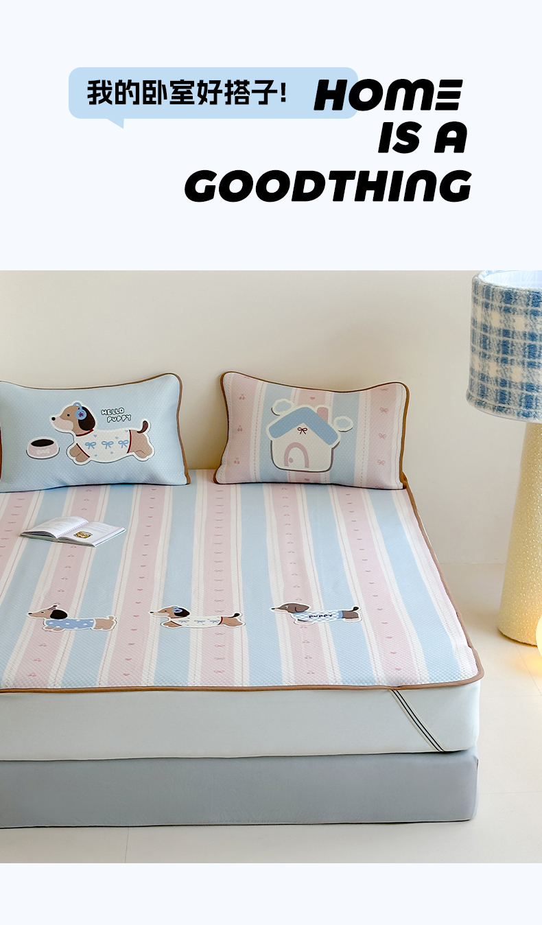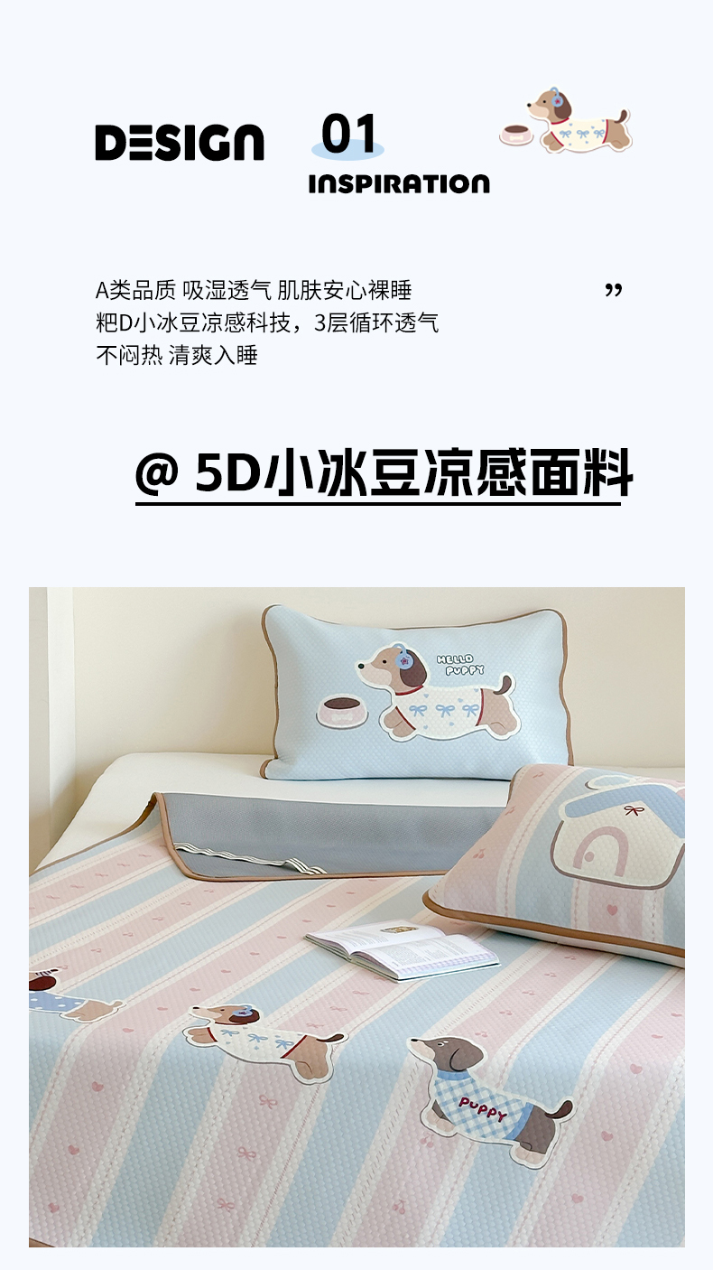 商品名称:RYB红黄兰 2025新款ins设计师原创A类数码大版卡通印花冰豆豆席凉席席子 甜心腊肠狗