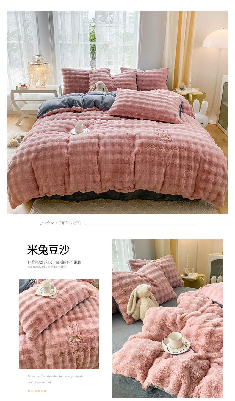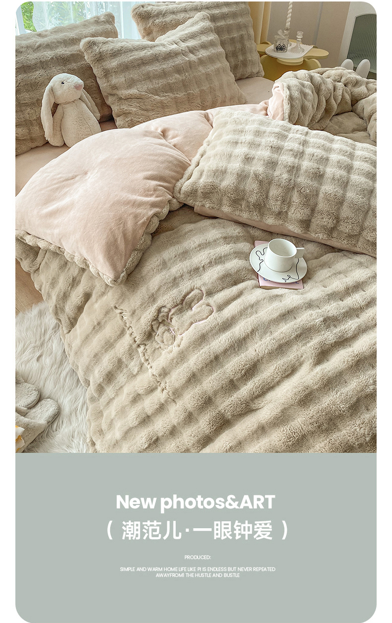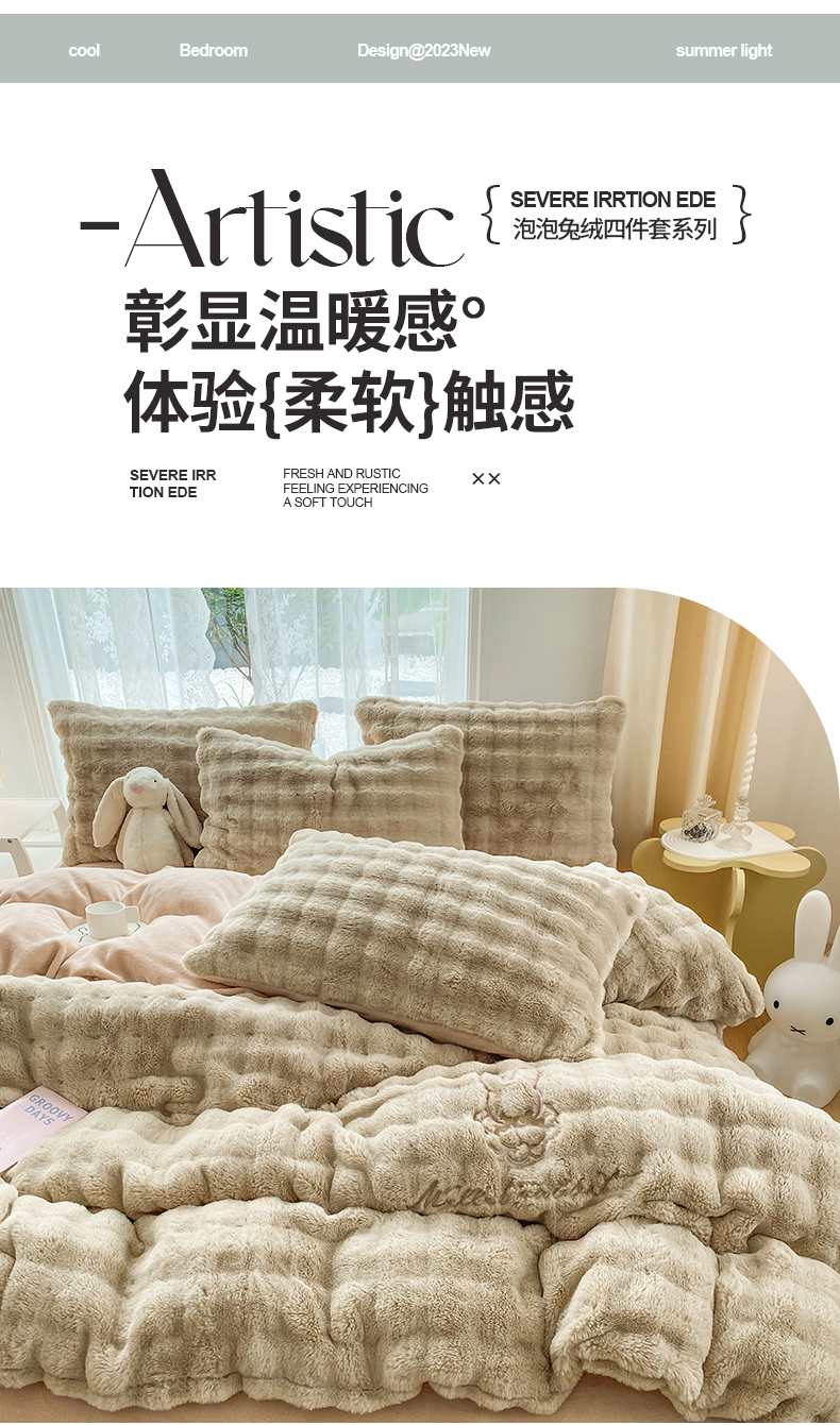 当前位置: 91家纺网 > 商品网购 > 床品套件 > 四件套 > 其它四件套 > 潮邦创意家居 2025新款小米兔泡泡兔绒保暖四件套 米兔卡其