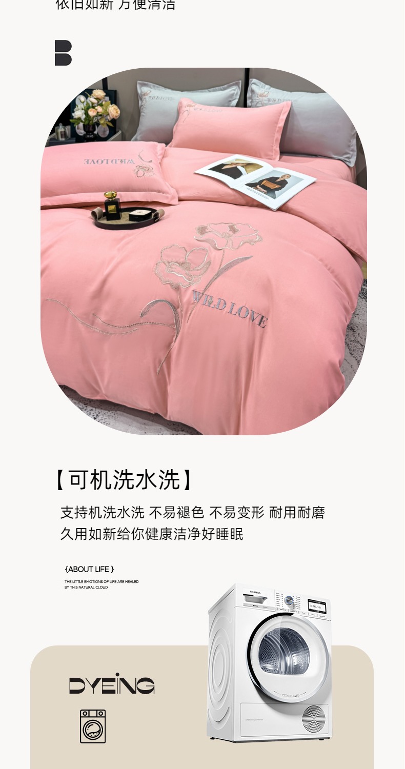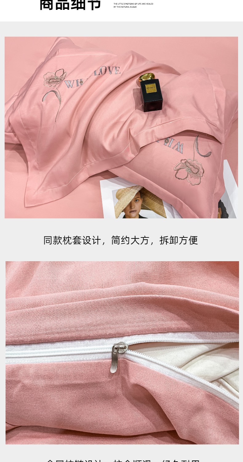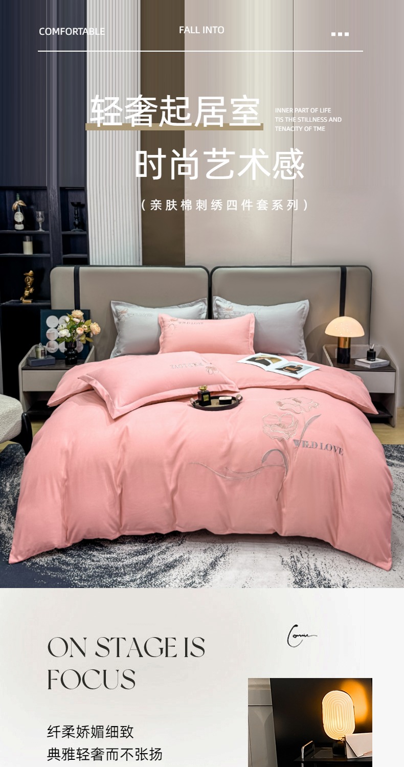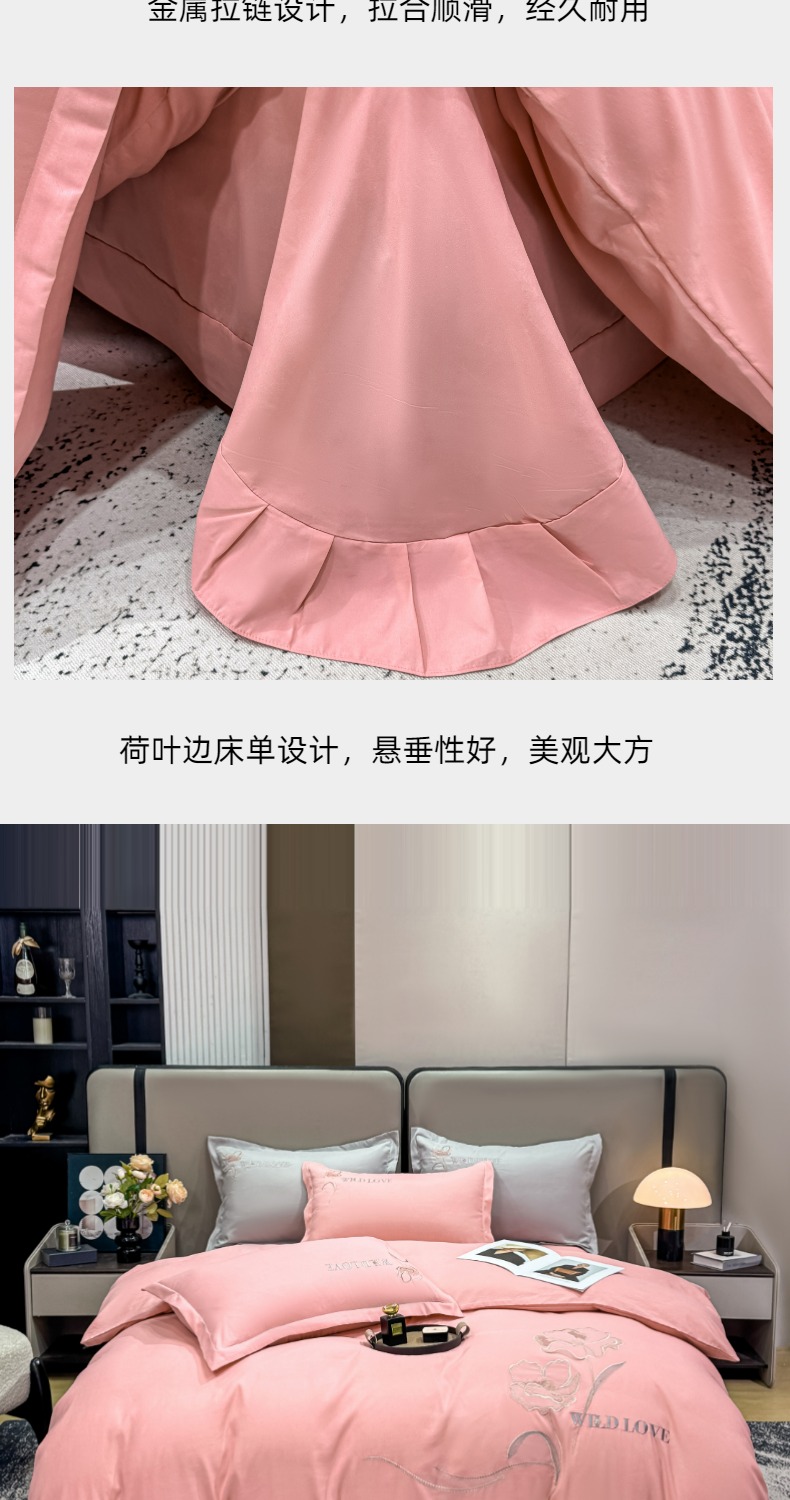 商品名称:悦织湾家纺 90克磨毛刺绣纯色四件套2025新款轻奢韩版公主风精致床上用品绣花亲肤水洗棉4件套 诗诺-玉色