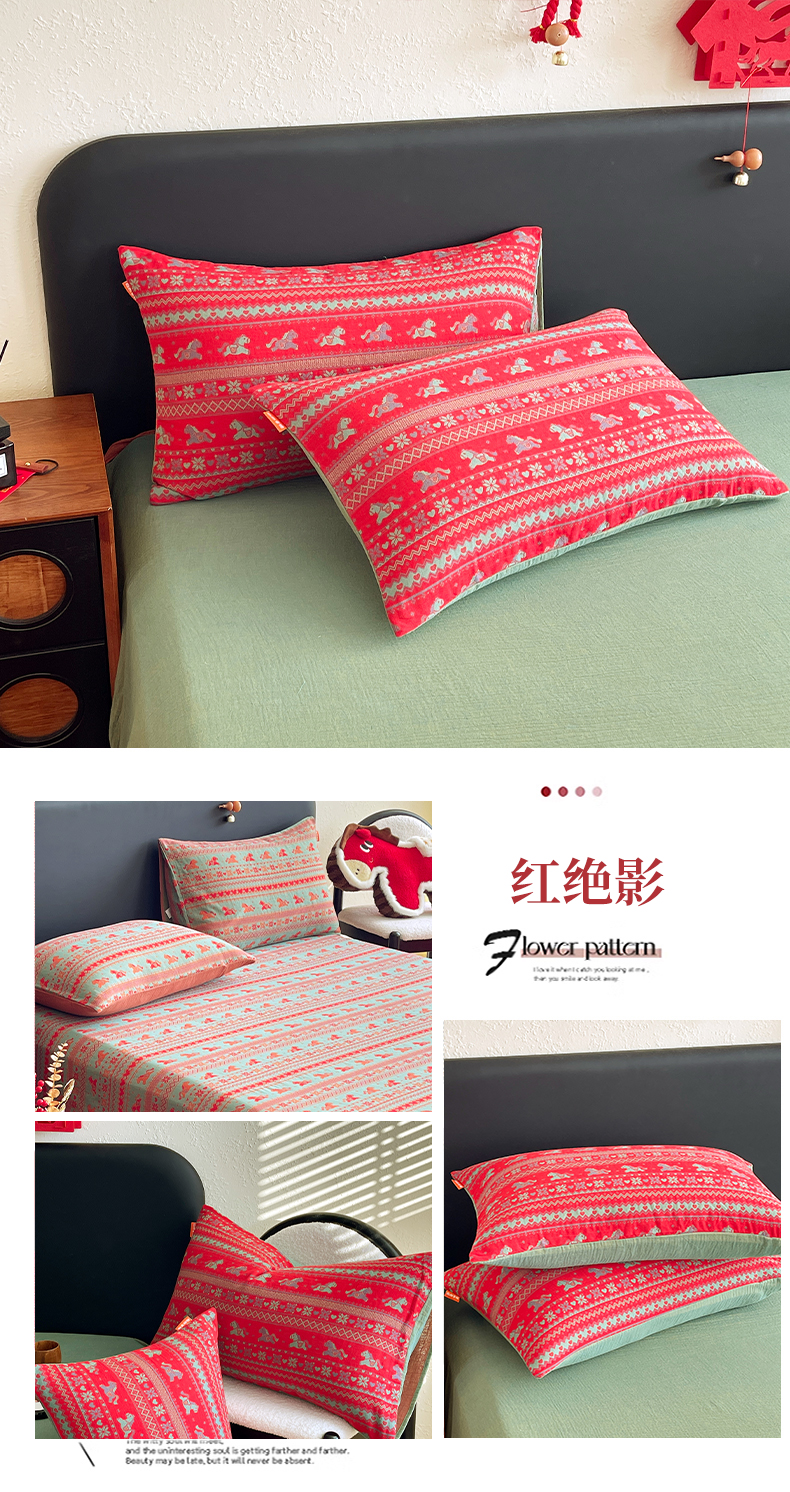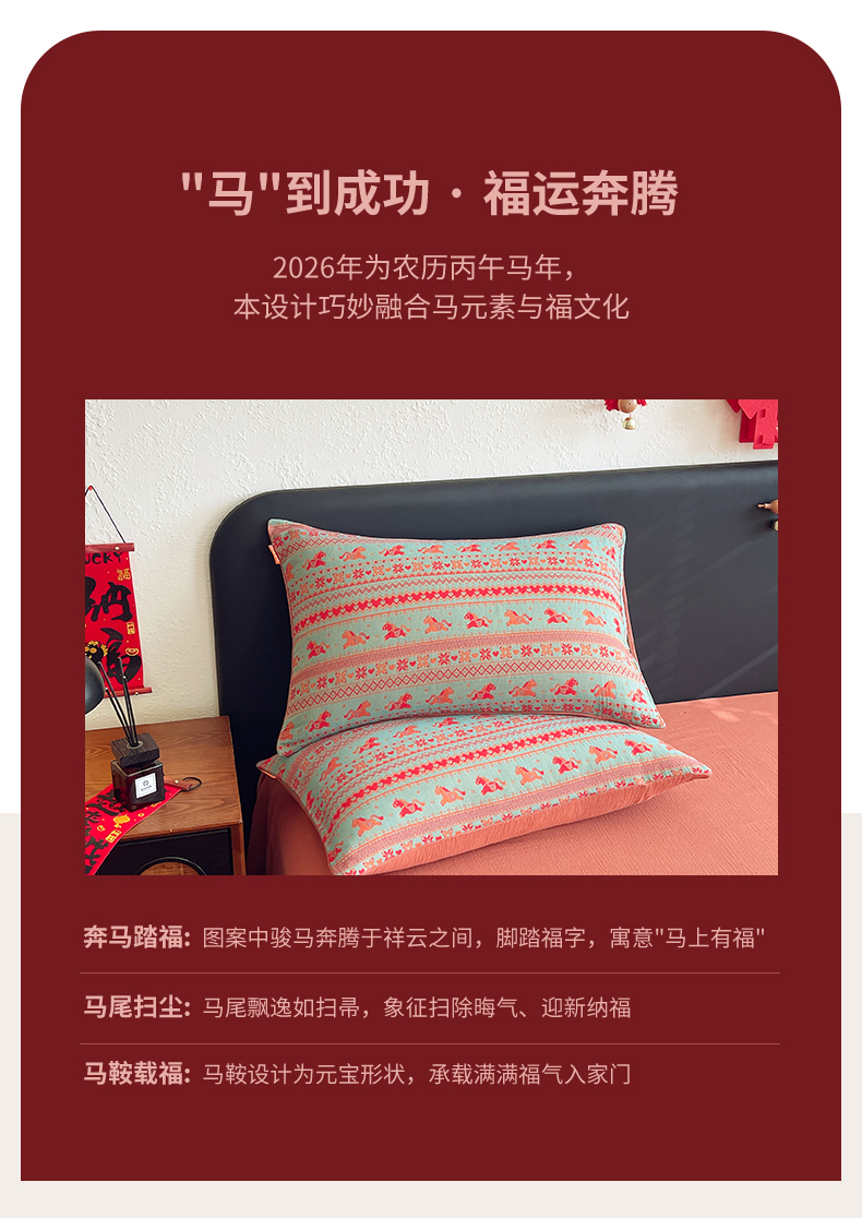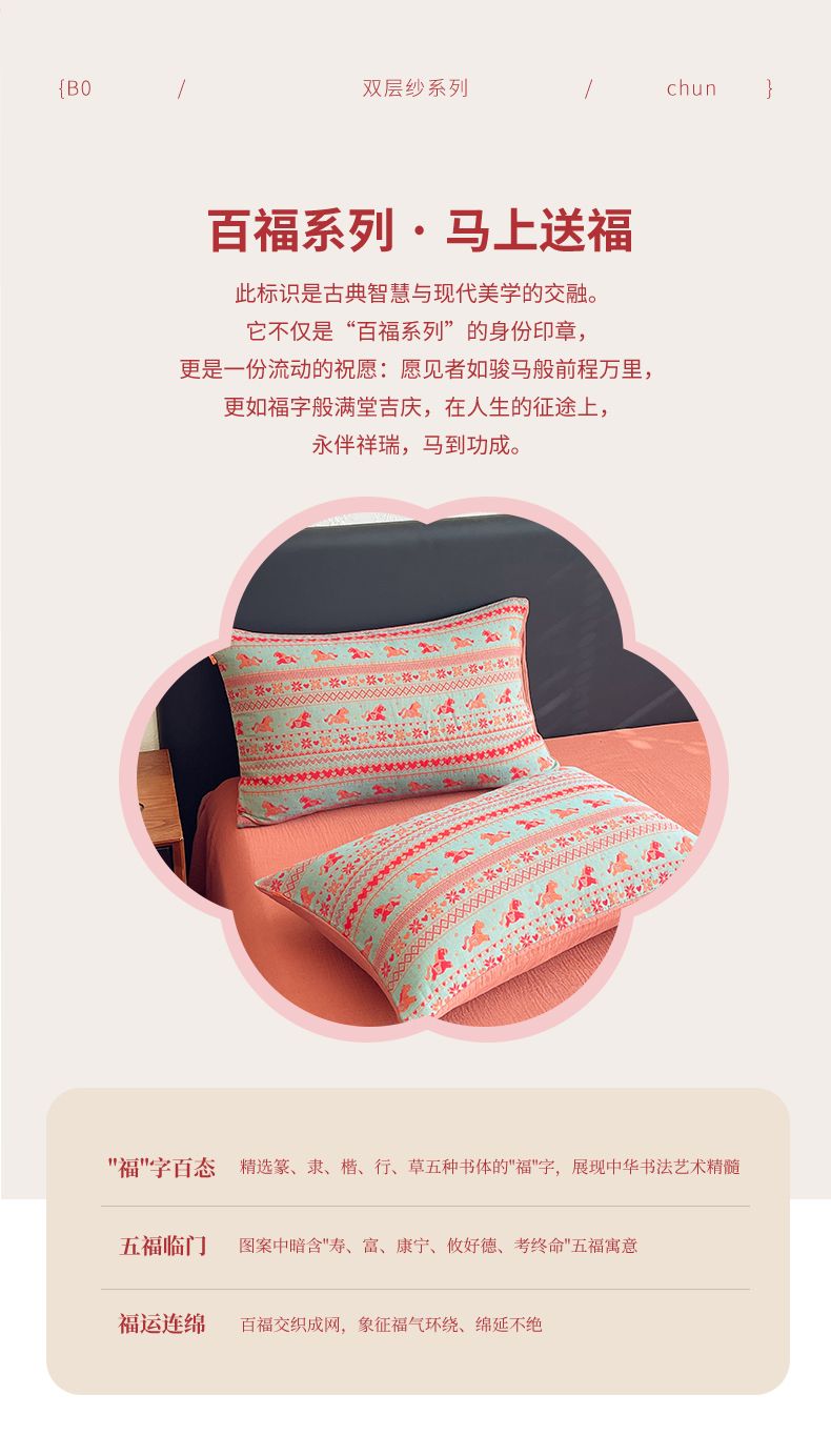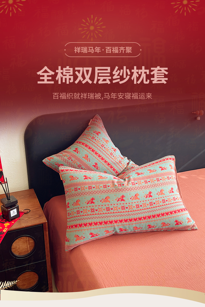(总)春皖家纺 2026新款全棉色织双层纱提花百福系列拉链款-四件套,红百福,红赤兔,红福马,绿赤兔,绿福马,红绝影,绿绝影
