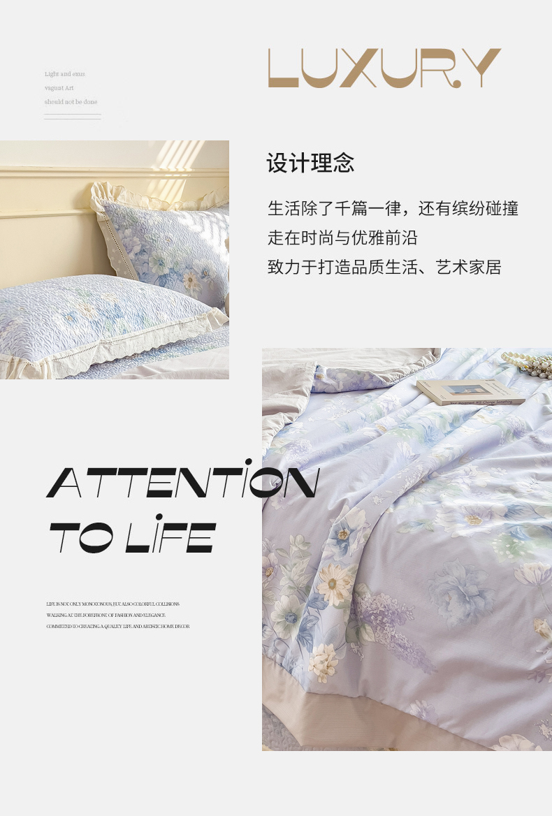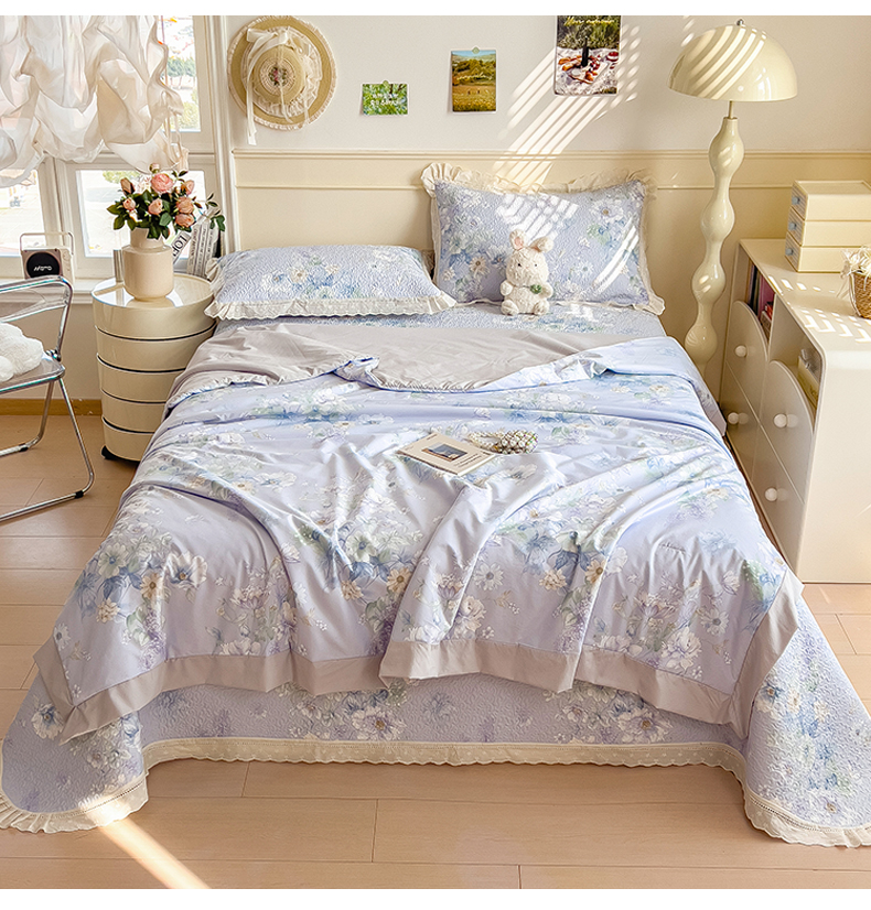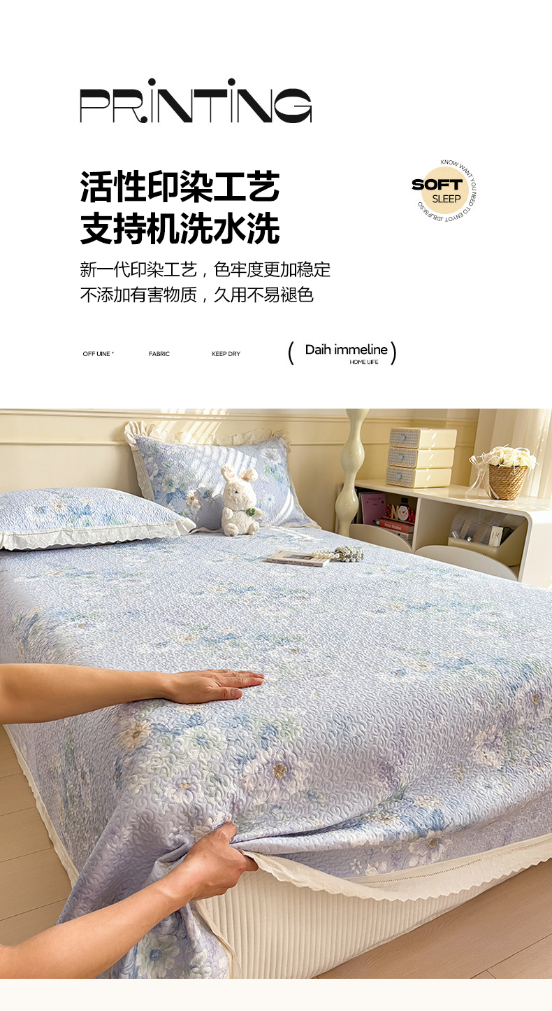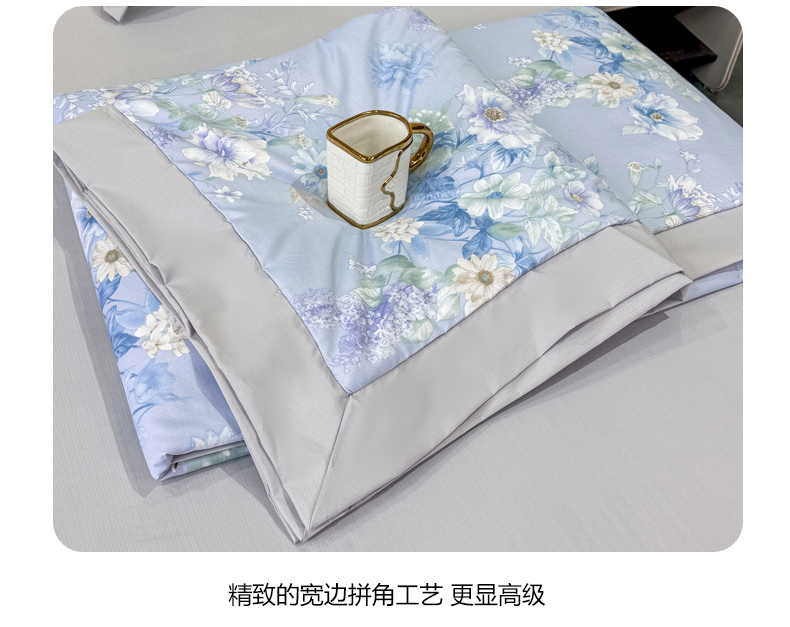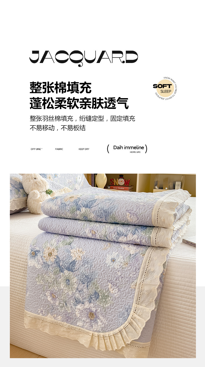 • 91家纺网 家纺一手货源 找家纺 叠派家纺 2026新款A类印花慕丝绵花边款床盖系列(抽空压缩可供跨境)提供买家秀 蓝庭叙+灰