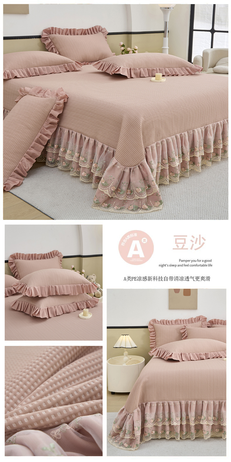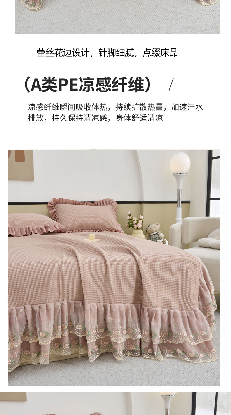 (总)能好家纺 2025新款双层刺绣花边冰豆豆席华夫格pe凉感席凉席,豆沙,灰,咖,蓝,绿