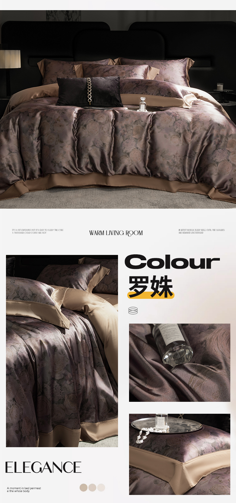 商品名称:娇逸 2025新款天丝桑珍丝数码印花宽边高端四件套 甘棠