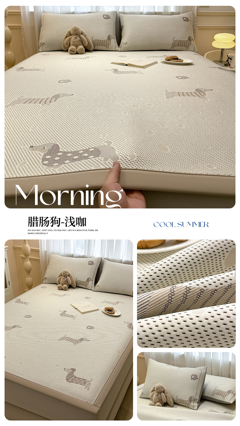 • 91家纺网 家纺一手货源 找家纺 全季家居 2025新款A类乙纶PE卡通系列凉豆豆席凉席席子 腊肠狗-浅咖-床笠款