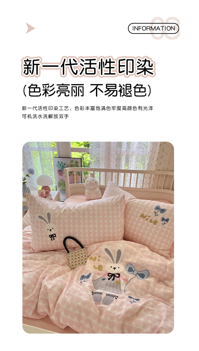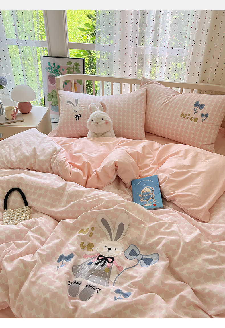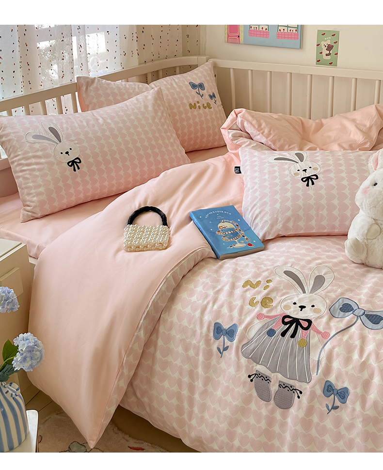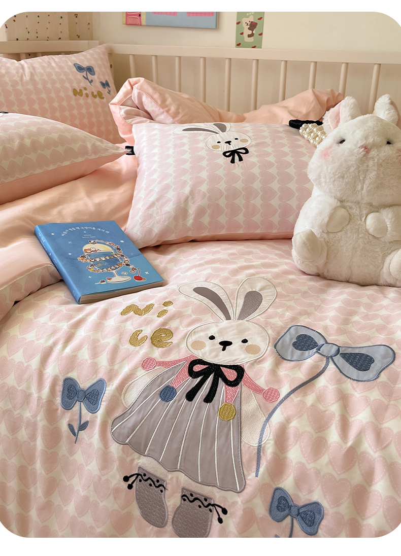 当前位置: 91家纺网 > 商品网购 > 床品套件 > 四件套 > 全棉普通四件套 > 乐美家纺 2025新款亲肤舒适全棉纯棉贴布绣卡通系列四件套 蝴蝶结兔子