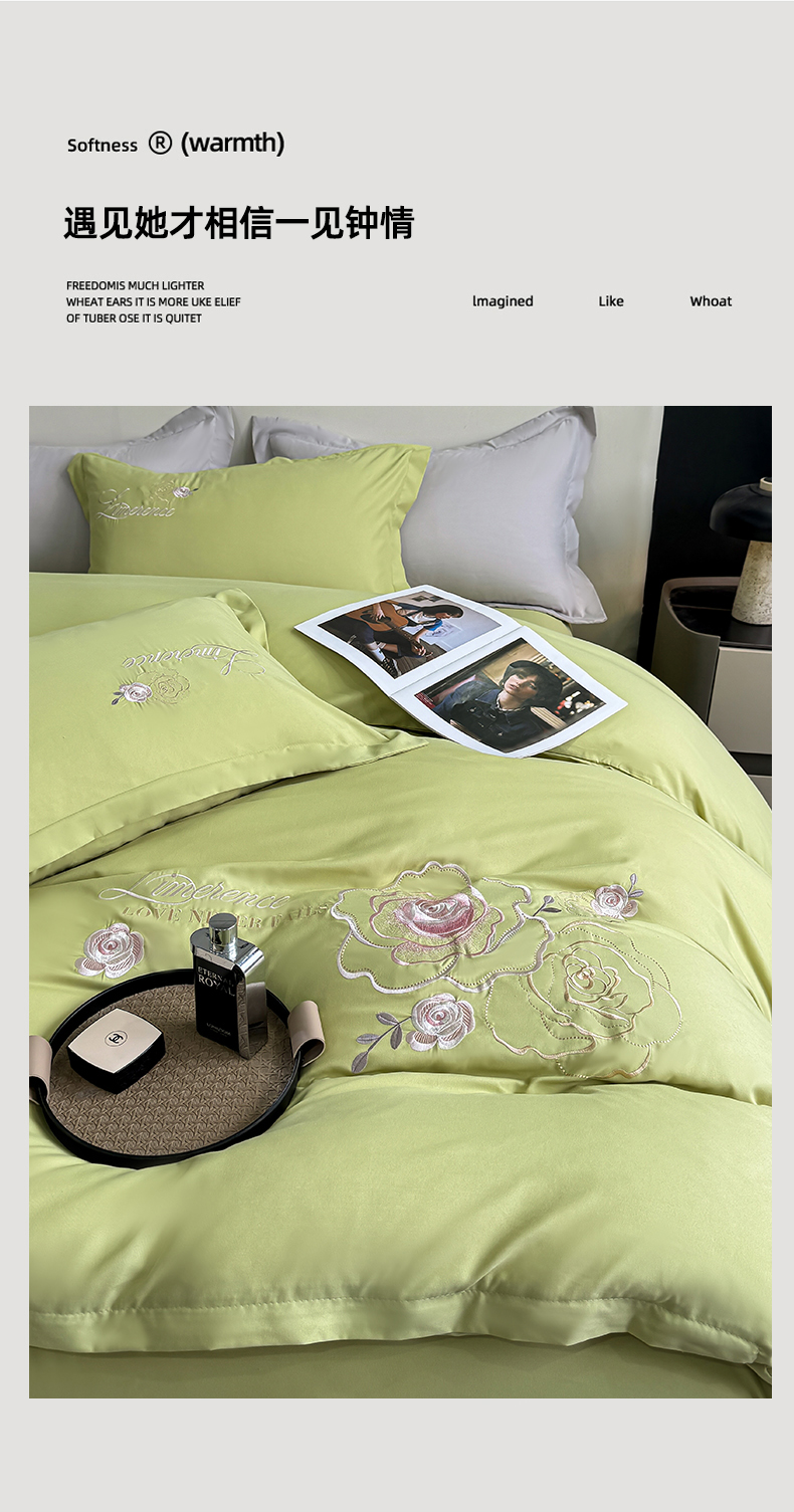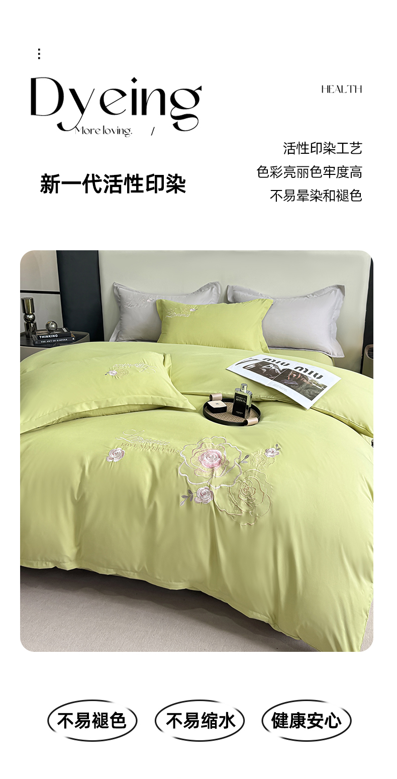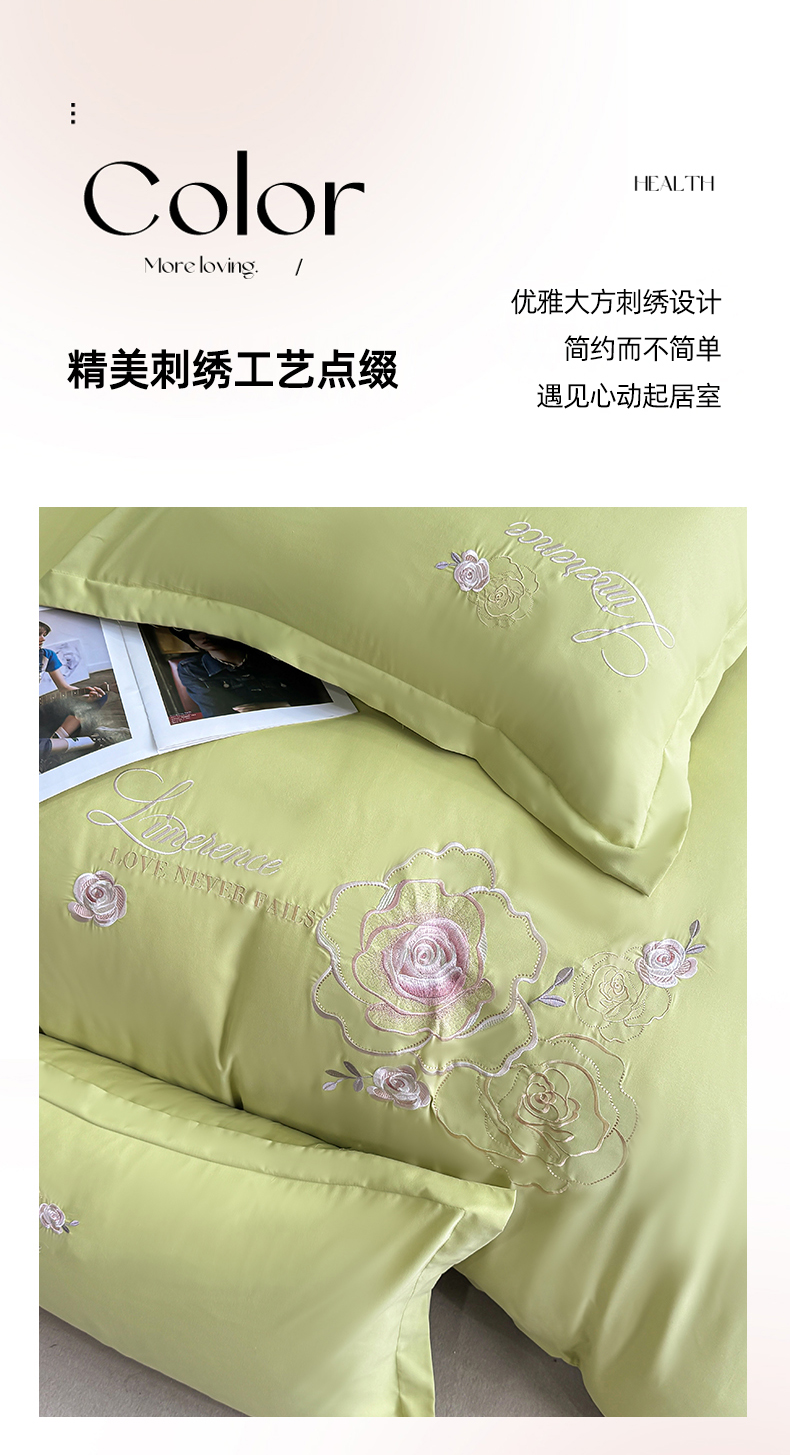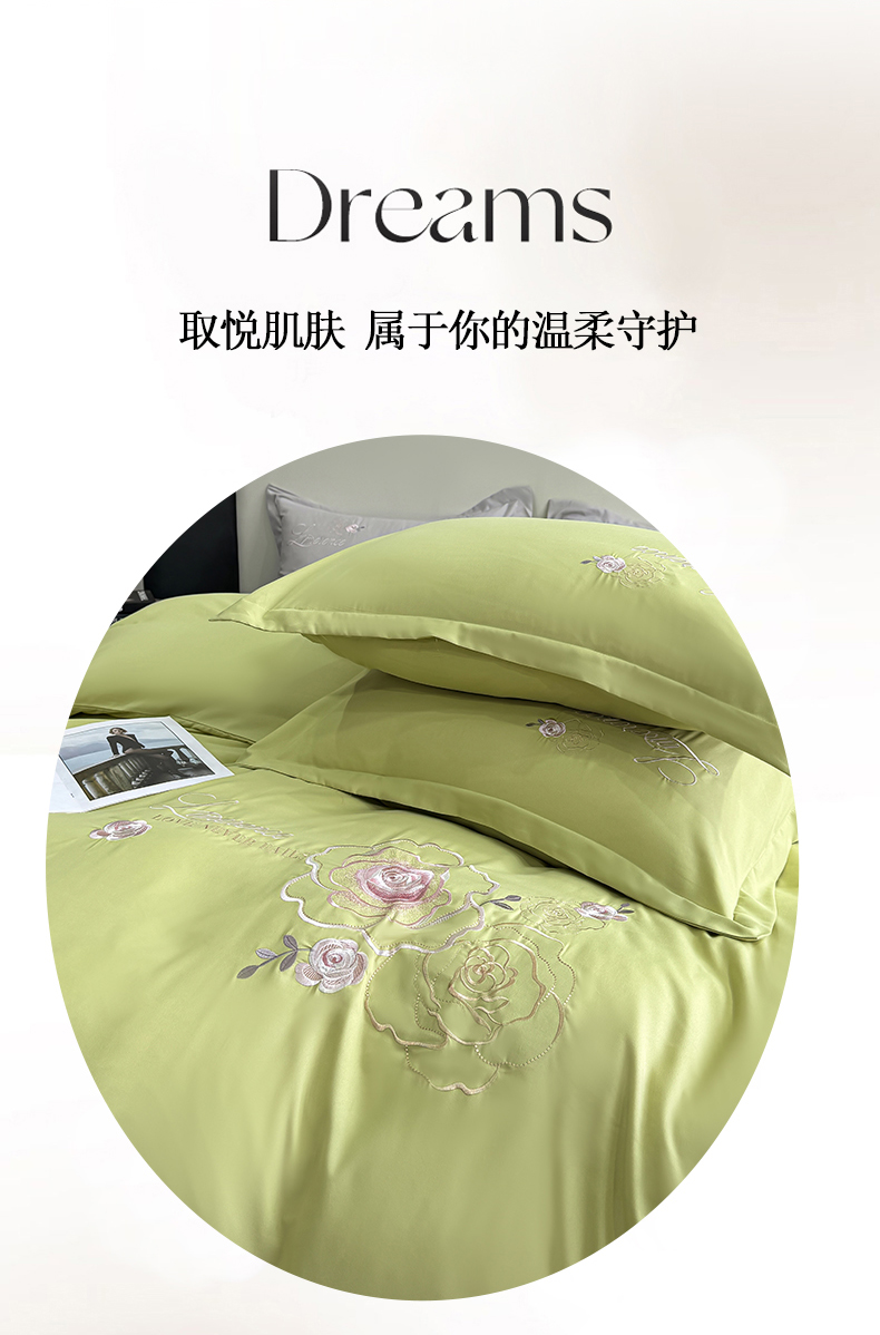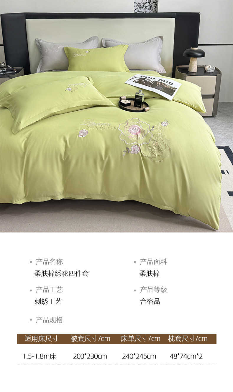 商品名称:悦织湾家纺 90克磨毛刺绣纯色四件套2025新款轻奢韩版公主风精致床上用品绣花亲肤水洗棉4件套 遇见-果绿