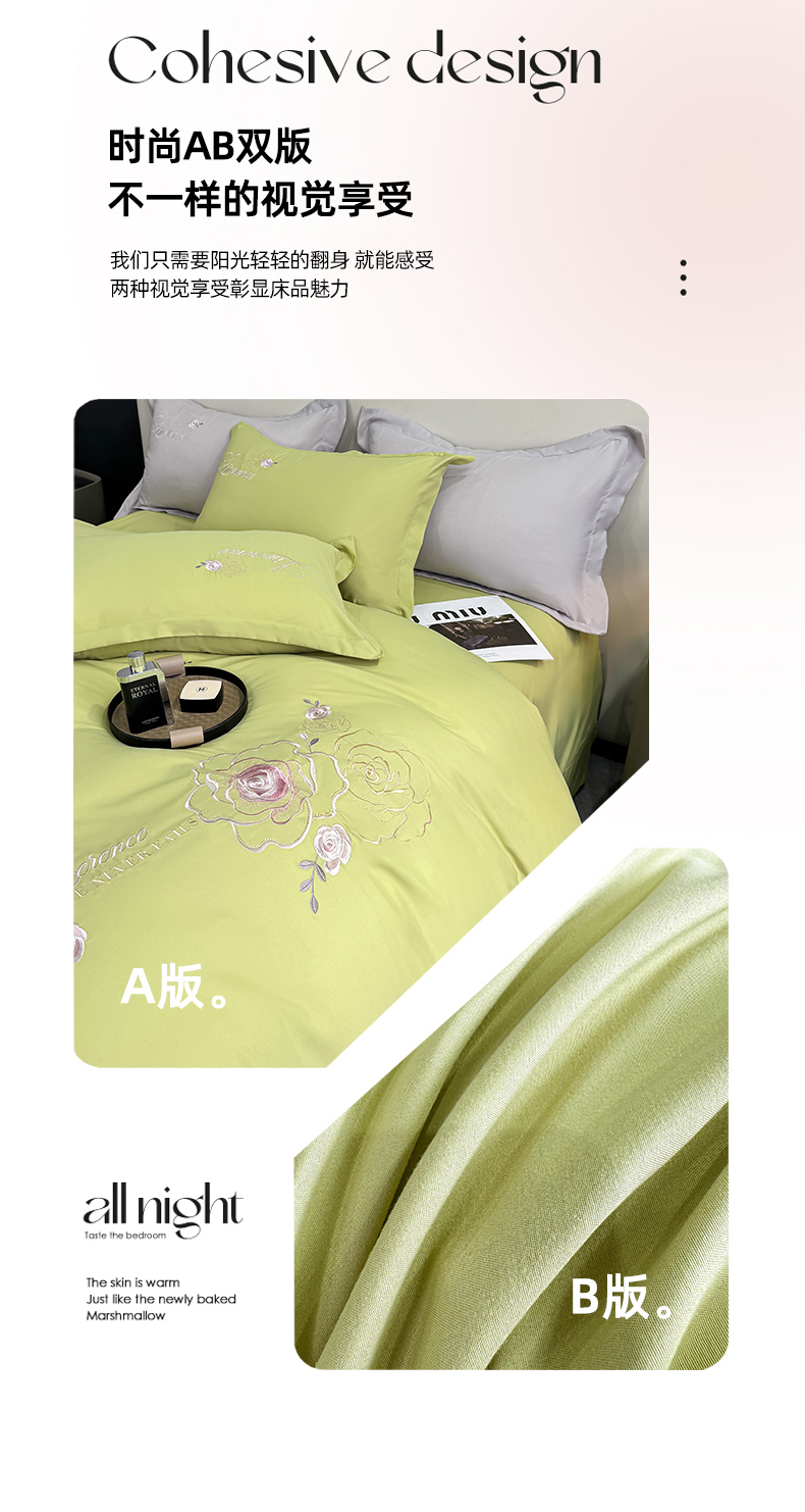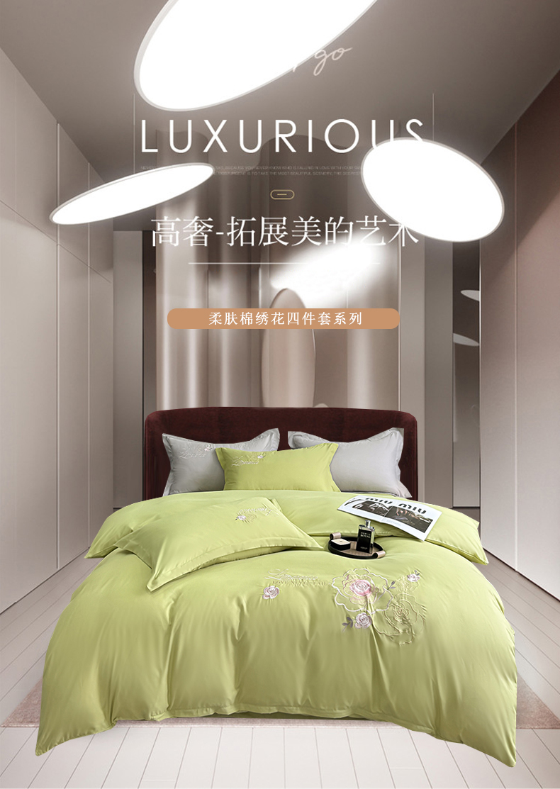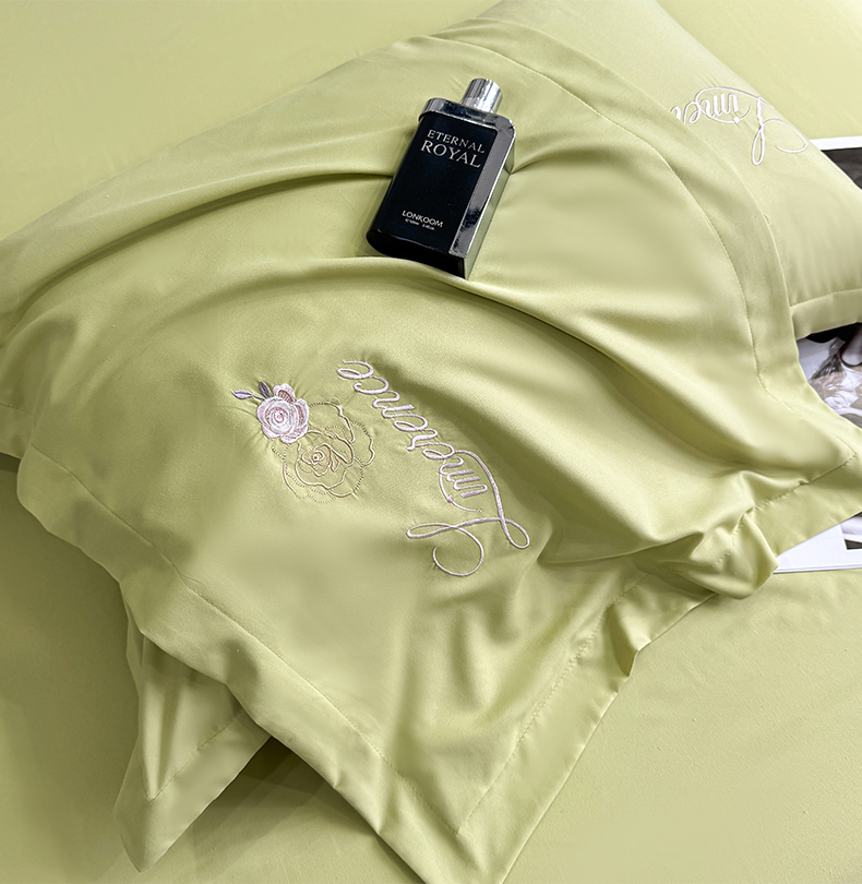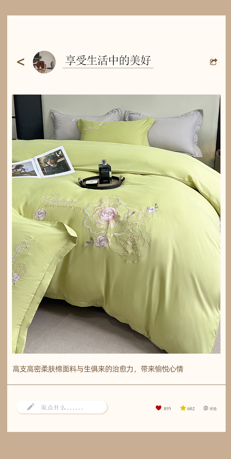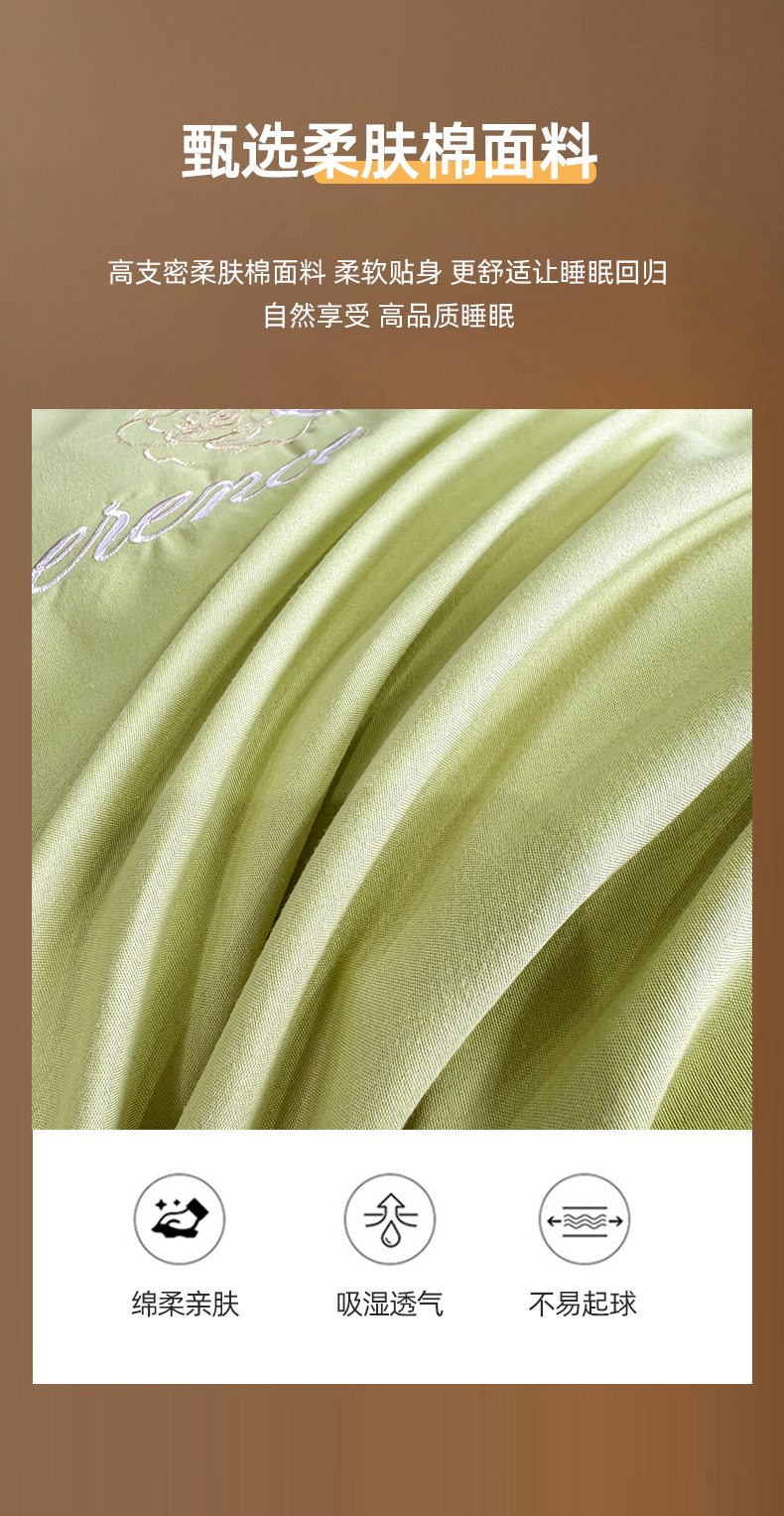 商品名称:悦织湾家纺 90克磨毛刺绣纯色四件套2025新款轻奢韩版公主风精致床上用品绣花亲肤水洗棉4件套 遇见-果绿