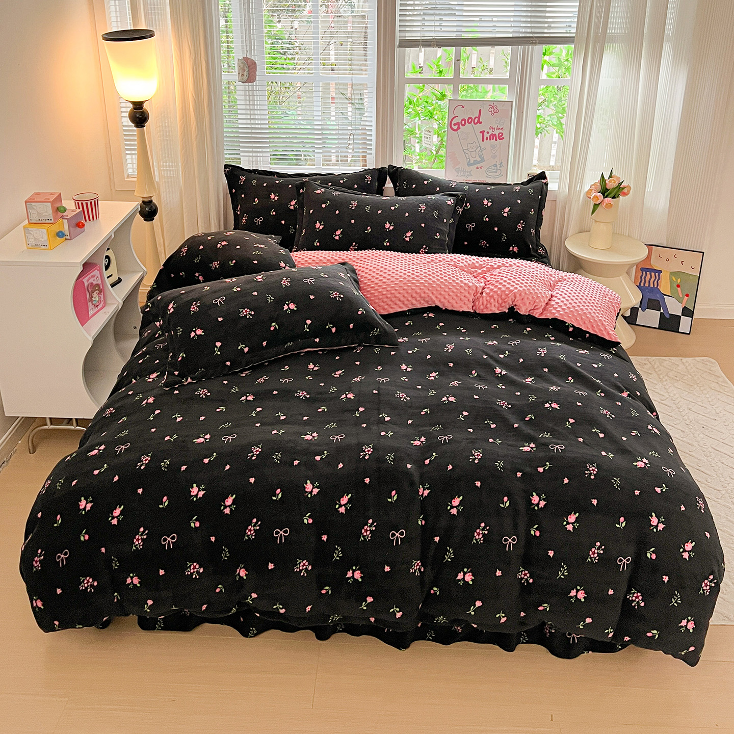 商品名称:仟网汇 2025新款牛奶绒豆豆绒床盖四件套 黑绒花梦