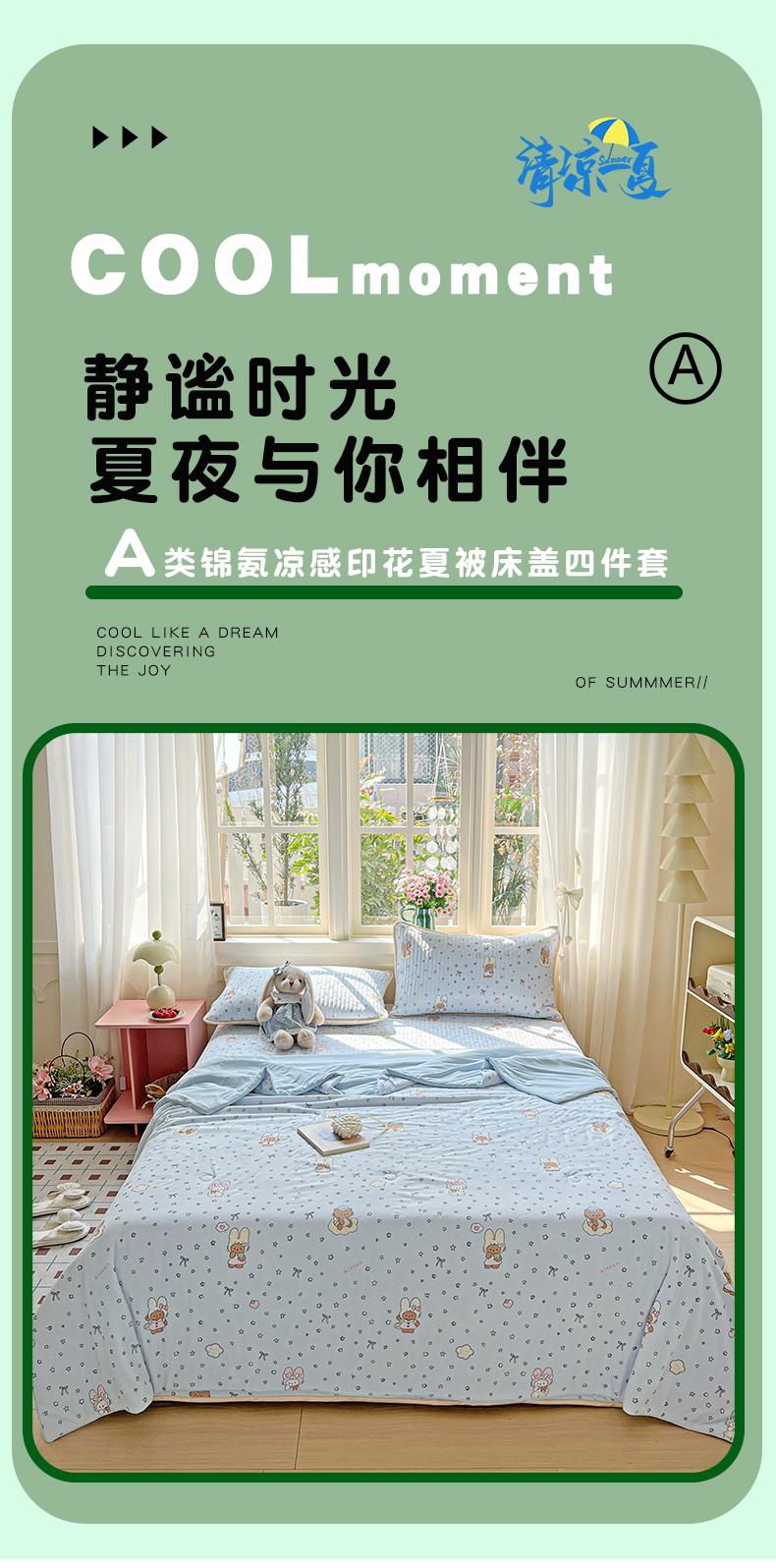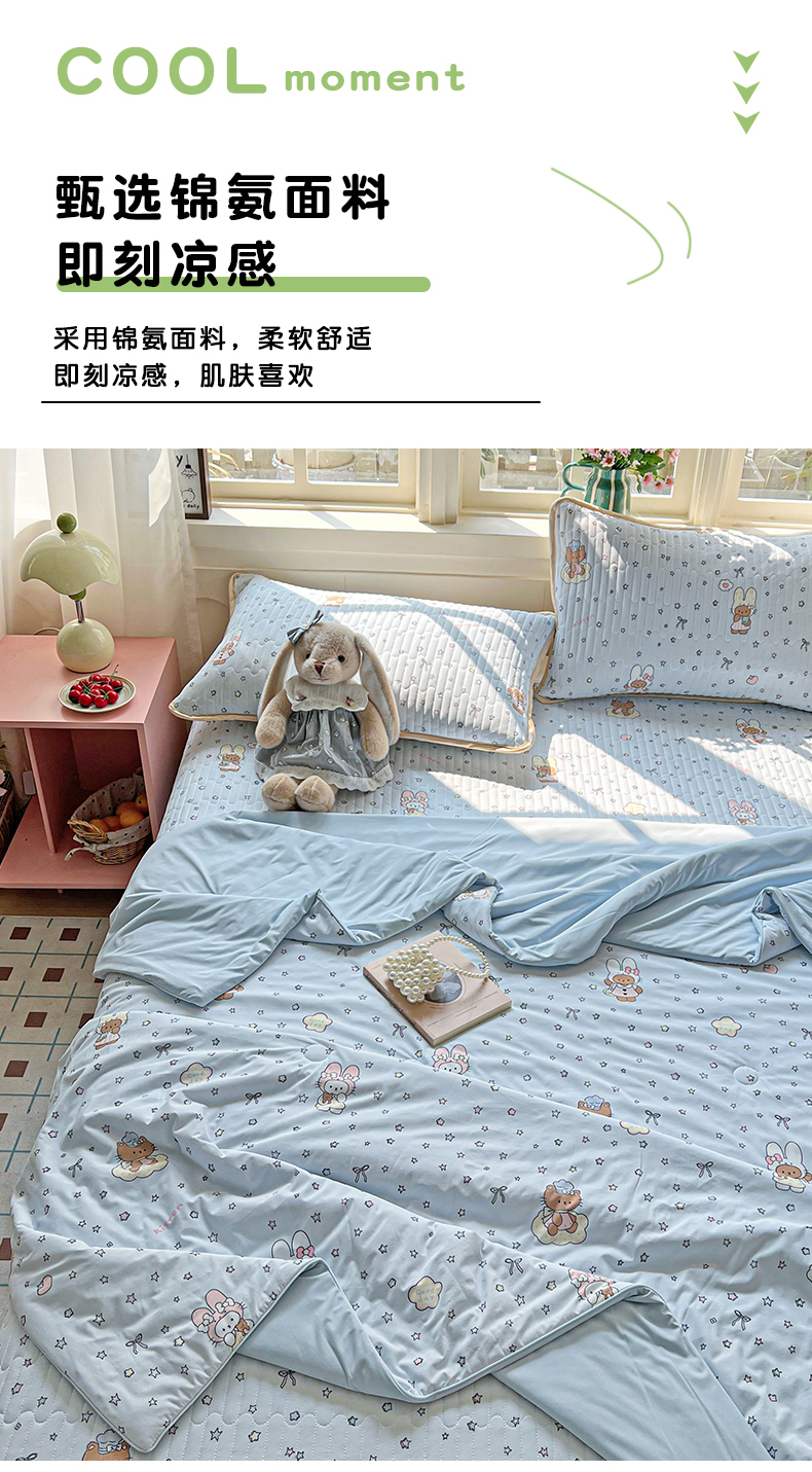 当前位置: 91家纺网 > 商品网购 > 床品套件 > 四件套 > 夏被四件套 > 卡普二店 2026新款A类锦氨凉感印花夏被四件套床盖凉席款--四件套 萌兔星愿