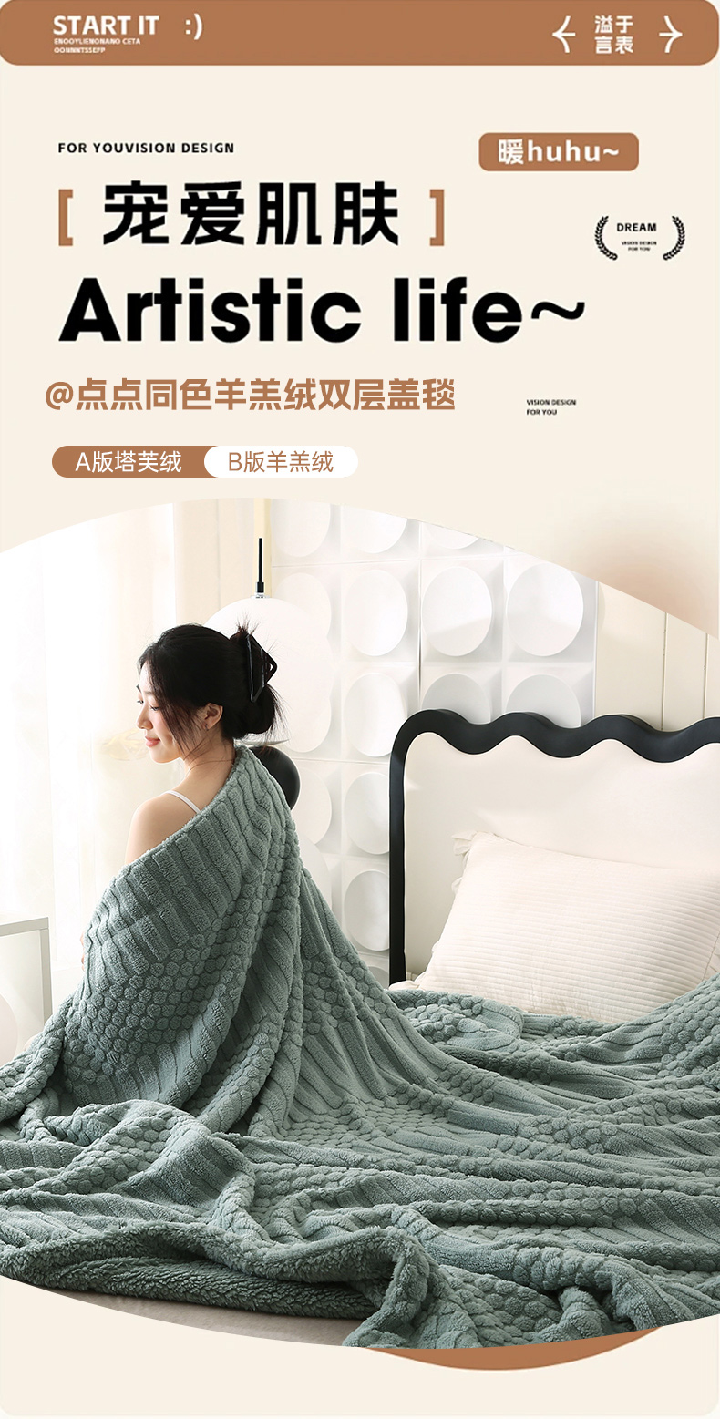 (总)巴木赫 2024新款舒棉绒点点塔芙绒双层羊羔绒毯,茶绿,豆沙,粉色,黄棕,灰蓝,米白,深灰,杏色,银灰