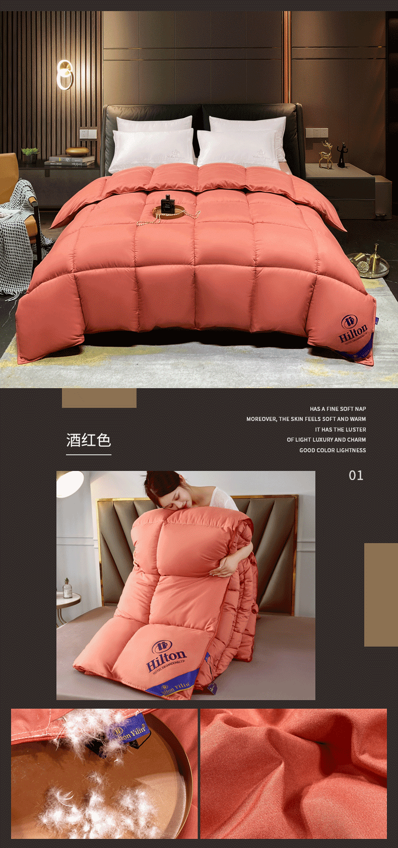 招财星2店仓储 2025新款款全棉防羽布希尔顿被 酒红色