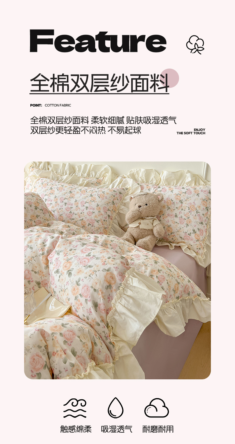 当前位置: 91家纺网 > 商品网购 > 床品套件 > 四件套 > 双层纱四件套 > 涵宸家纺 2025新款A类全棉双层纱荷叶花边四件套 花边-莫奈蓝