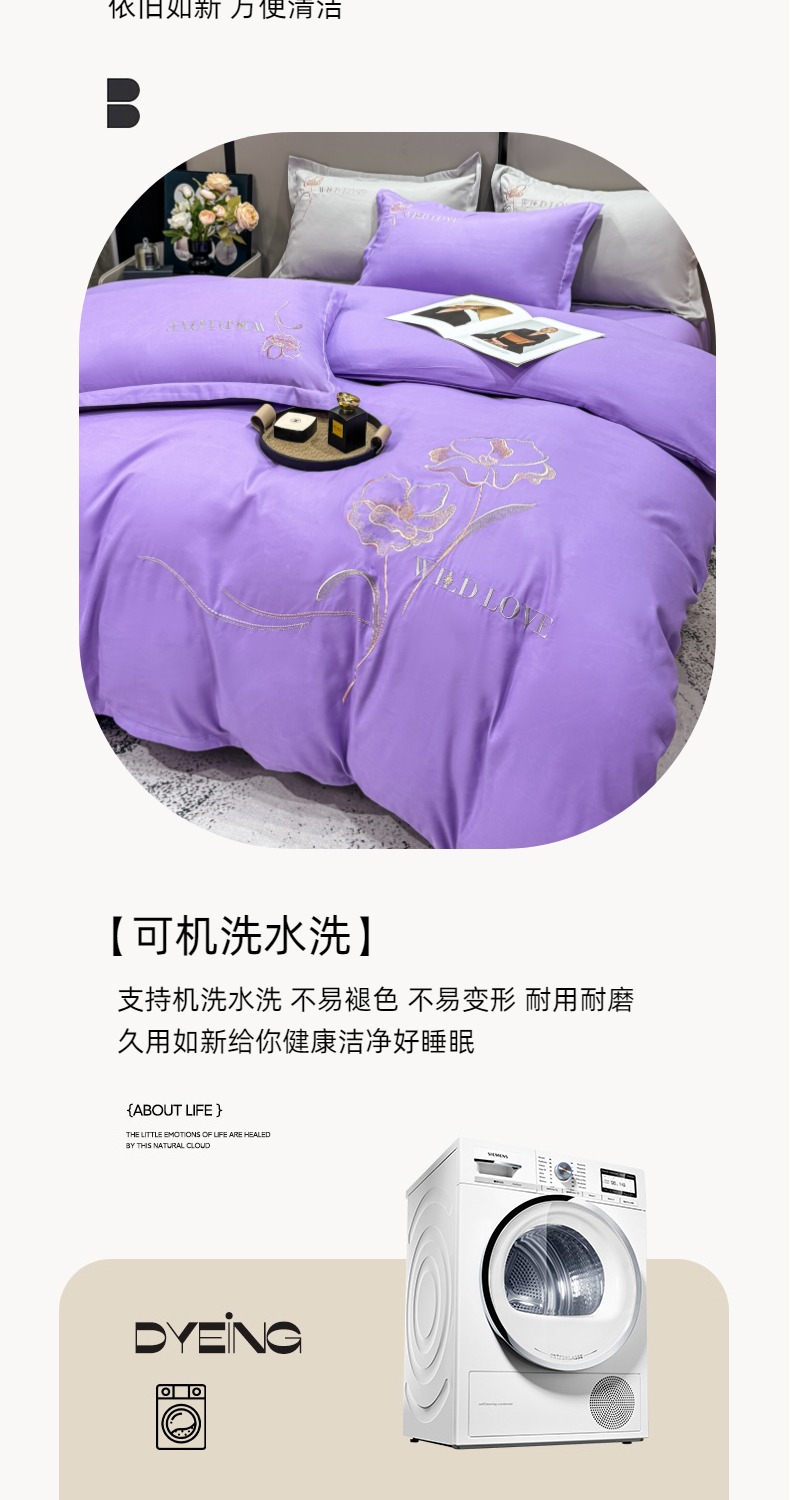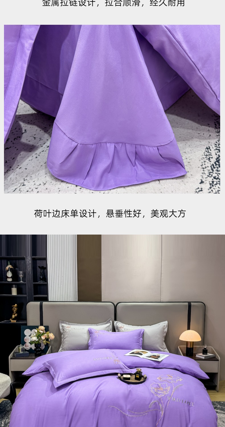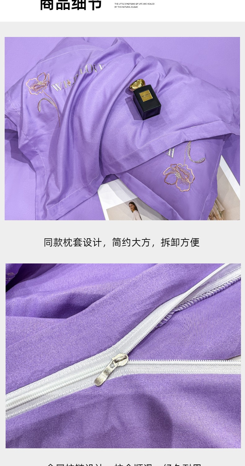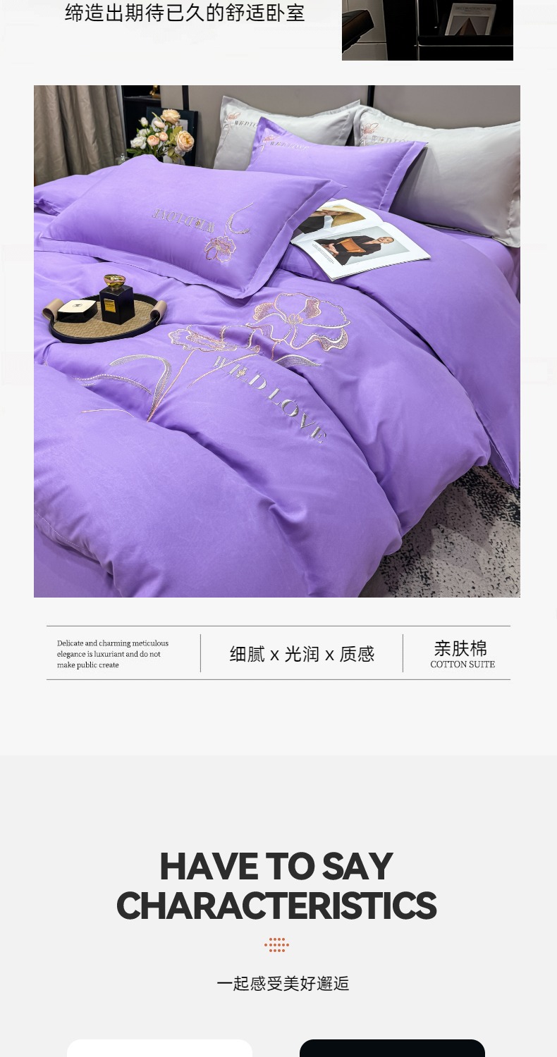 商品名称:悦织湾家纺 90克磨毛刺绣纯色四件套2025新款轻奢韩版公主风精致床上用品绣花亲肤水洗棉4件套 诗诺-紫色