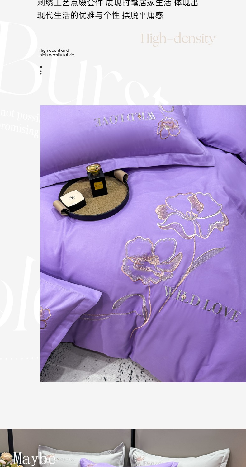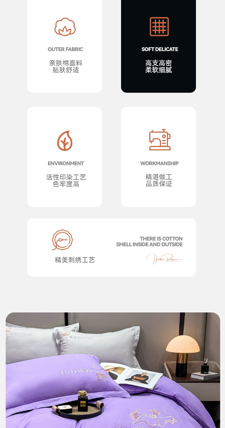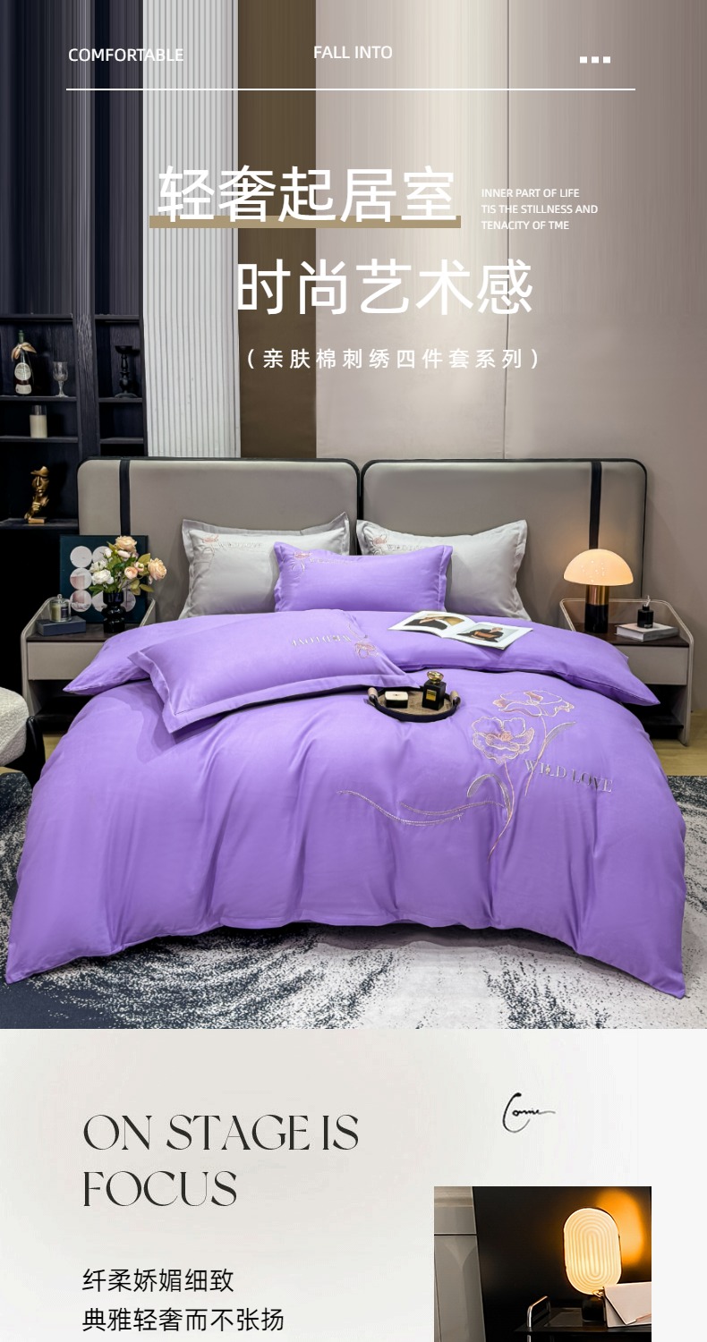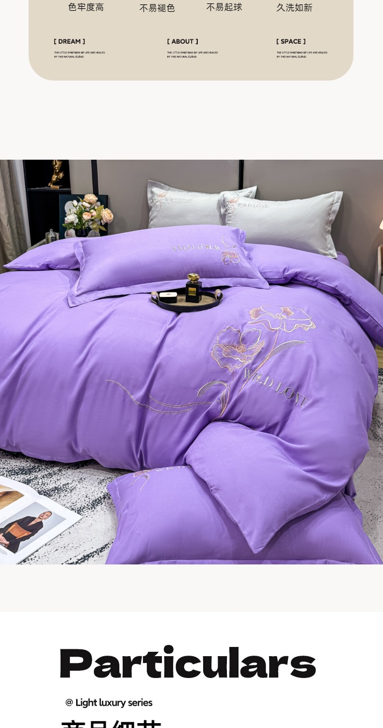 商品名称:悦织湾家纺 90克磨毛刺绣纯色四件套2025新款轻奢韩版公主风精致床上用品绣花亲肤水洗棉4件套 诗诺-紫色