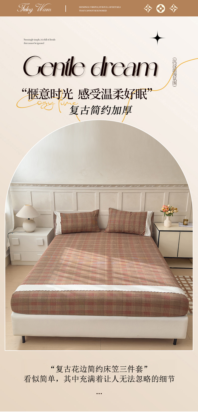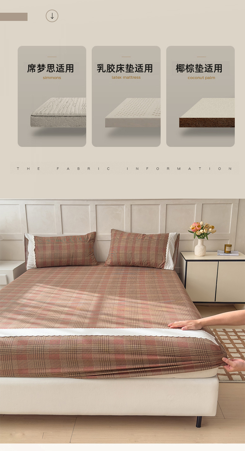 当前位置: 91家纺网 > 商品网购 > 床品套件 > 三件套 > 富阿娜家纺 2026年新款小布袋简约复古花边床笠三件套 浅棕软格