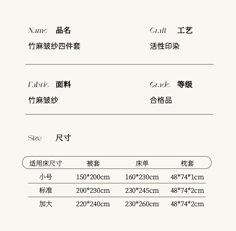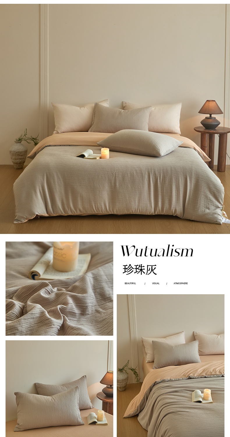 商品名称:麦空家居 2025新款无印风竹麻皱纱简约纯色四件套 珍珠灰-卡其
