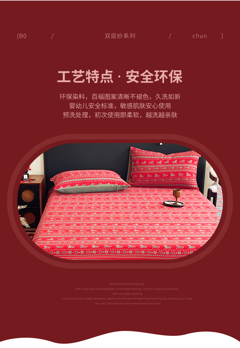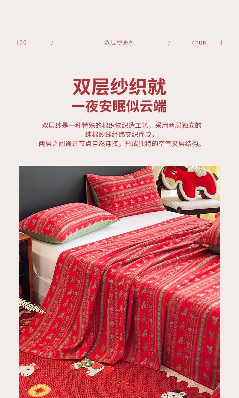 商品名称:春皖家纺 2026新款全棉色织双层纱提花百福系列拉链款-单床单 红绝影