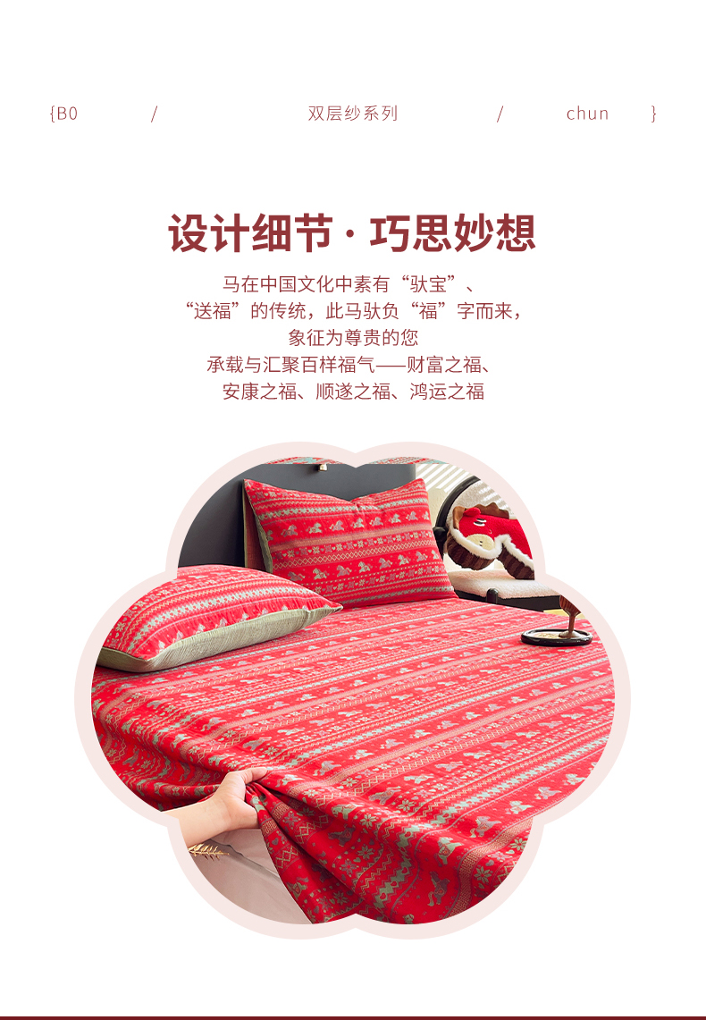 (总)春皖家纺 2026新款全棉色织双层纱提花百福系列拉链款-四件套,红百福,红赤兔,红福马,绿赤兔,绿福马,红绝影,绿绝影