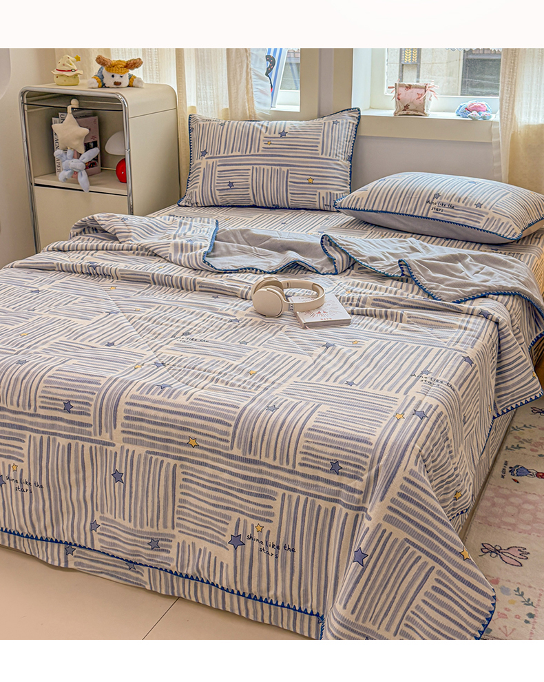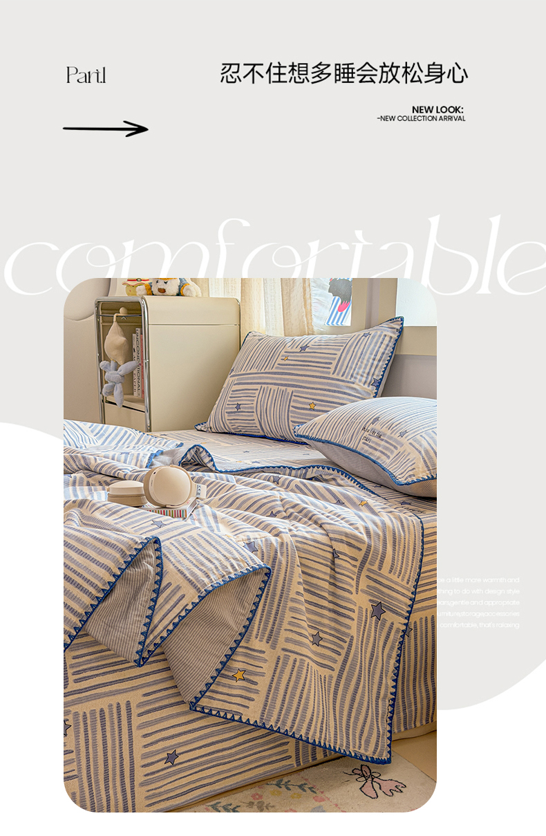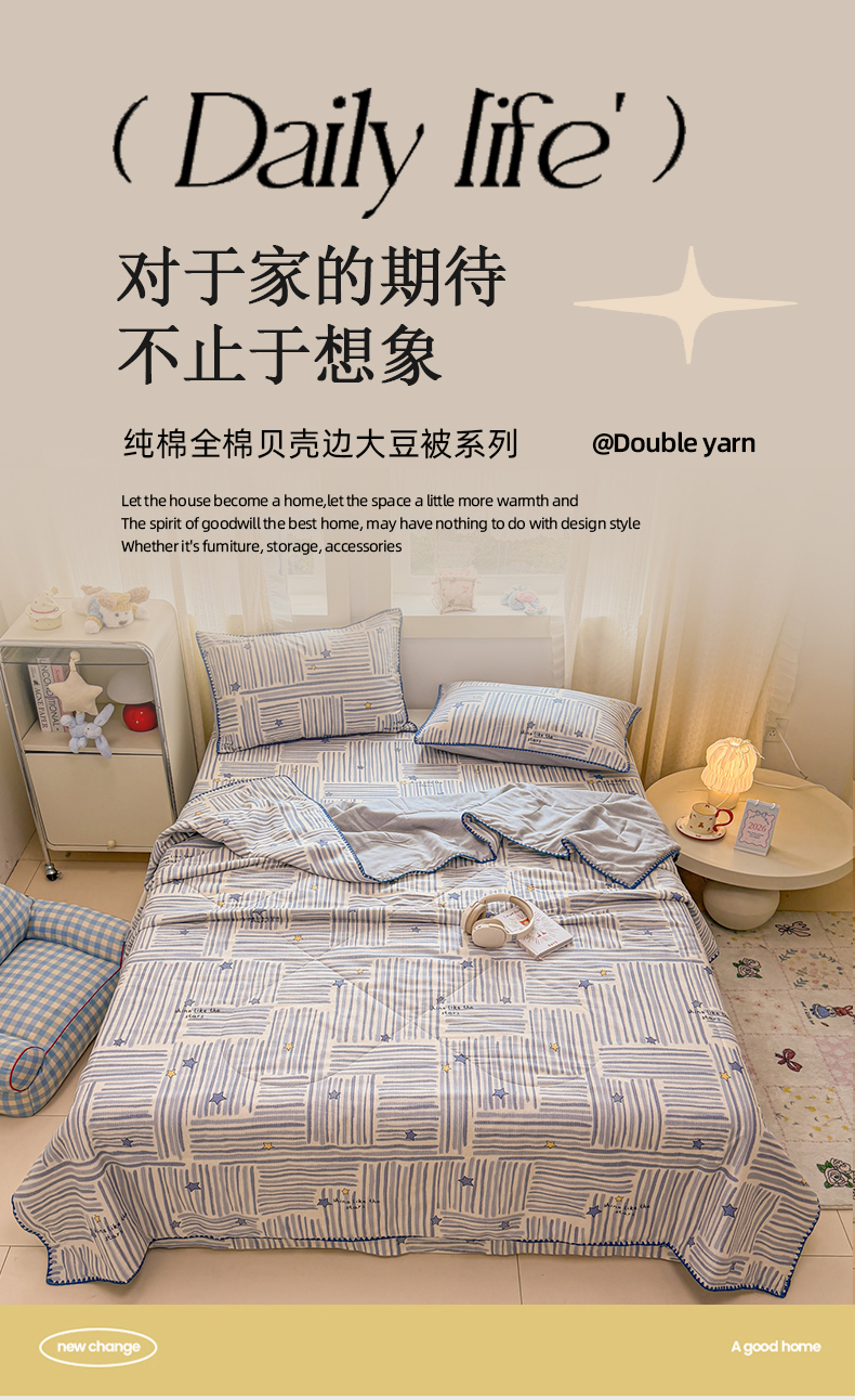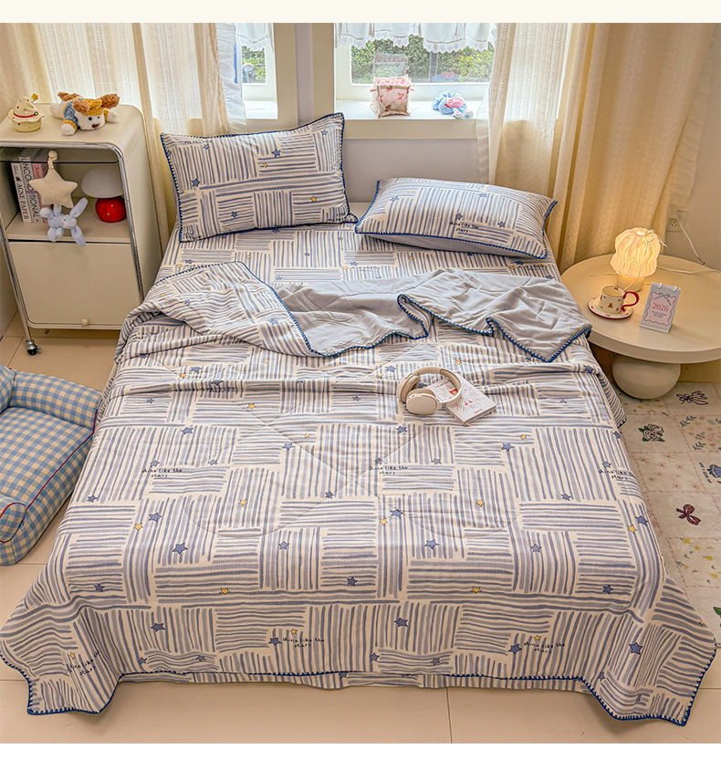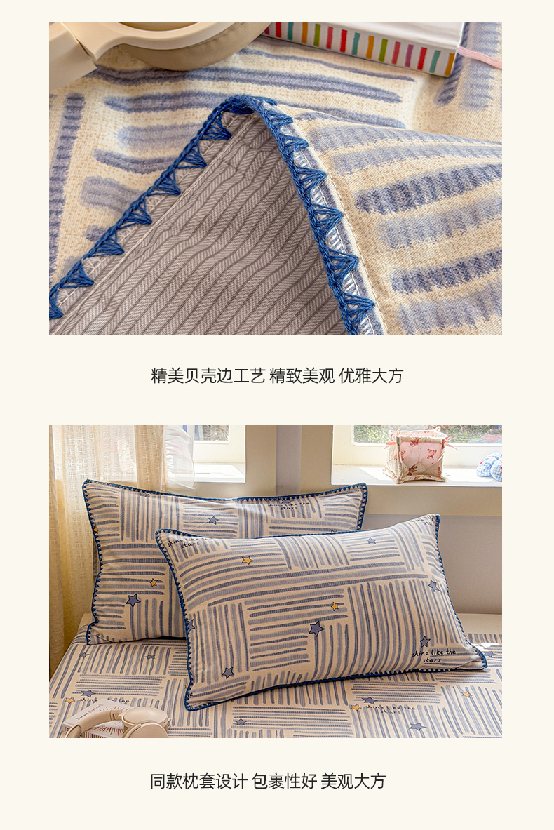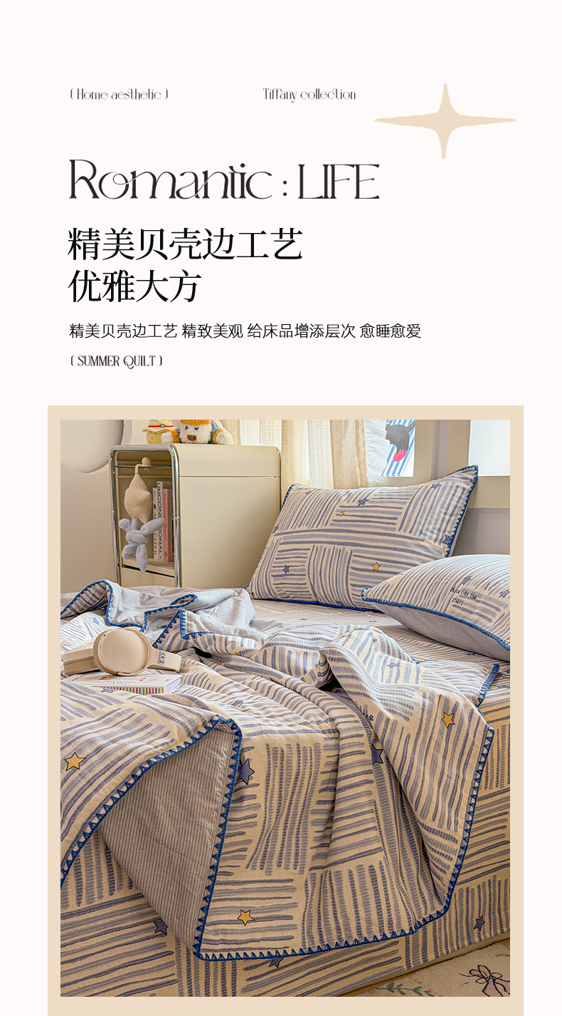 当前位置: 91家纺网 > 商品网购 > 床品套件 > 四件套 > 全棉普通四件套 > 简宜家居(朝初家纺) 2026新款全棉花卉卡通系列贝壳边夏被四件套 星落灰条