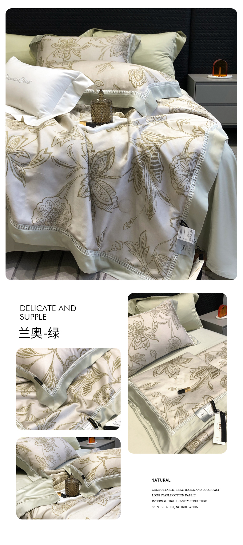 (总)黑白森林2024款 80X80S高支天丝棉四件套镂空蕾丝花边天丝全棉,尚美-晨夕粉,尚美-古象白,尚美-青砂绿,尚美-银雪灰