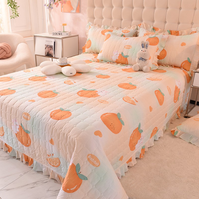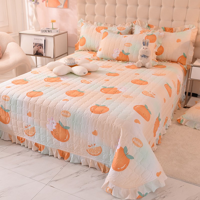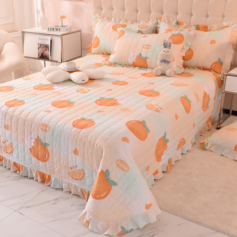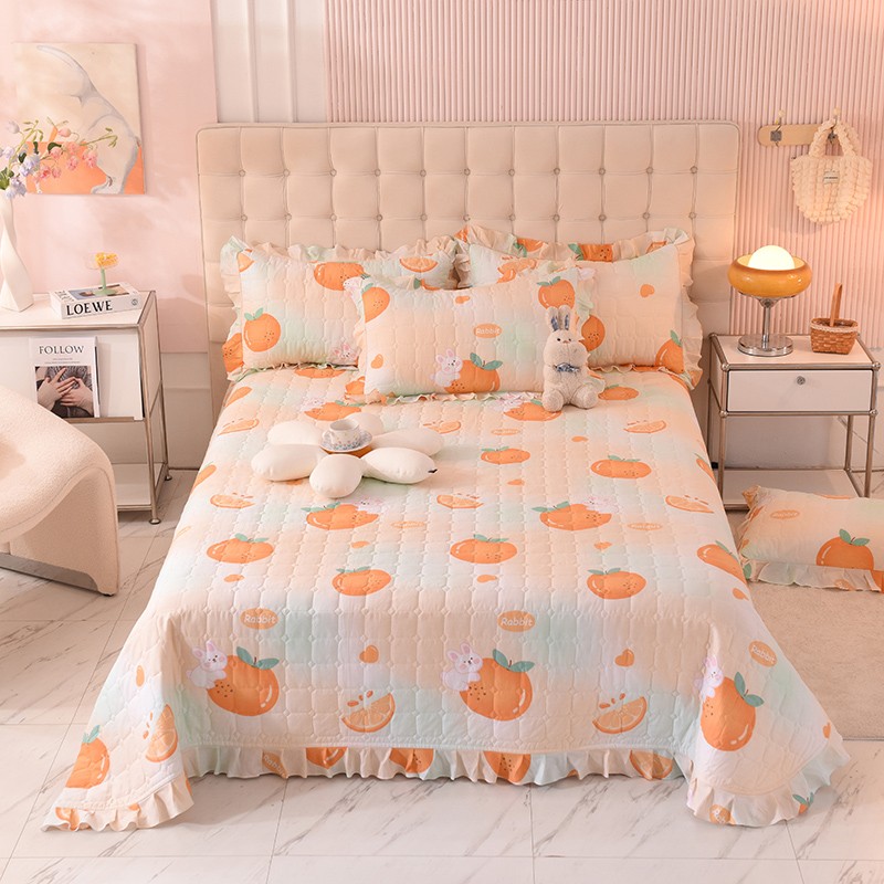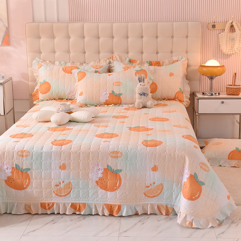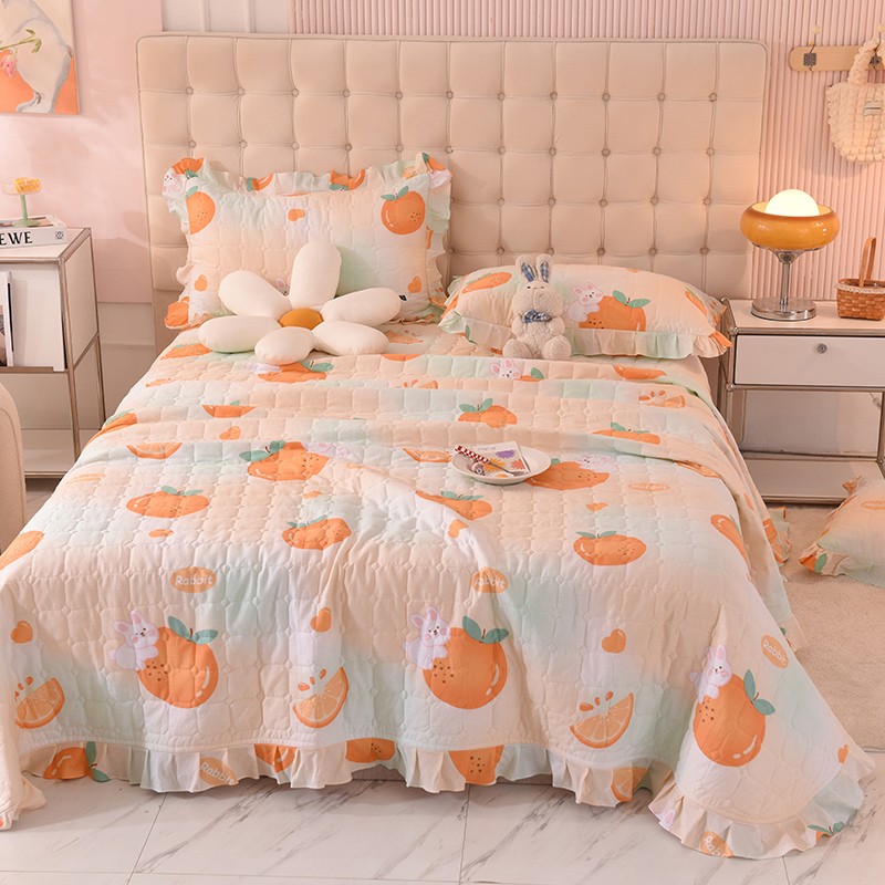 甜之梦家纺 2025新款全棉夹棉防滑抗菌花边款床盖 甜橙小兔