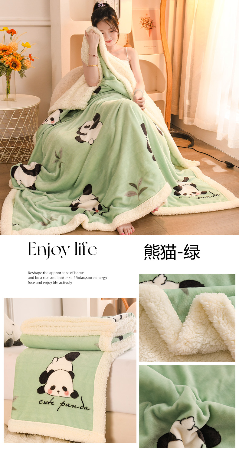 2025新款毛毯AB版牛奶绒+羊羔绒毯子复合多功能午睡毯 熊猫-绿